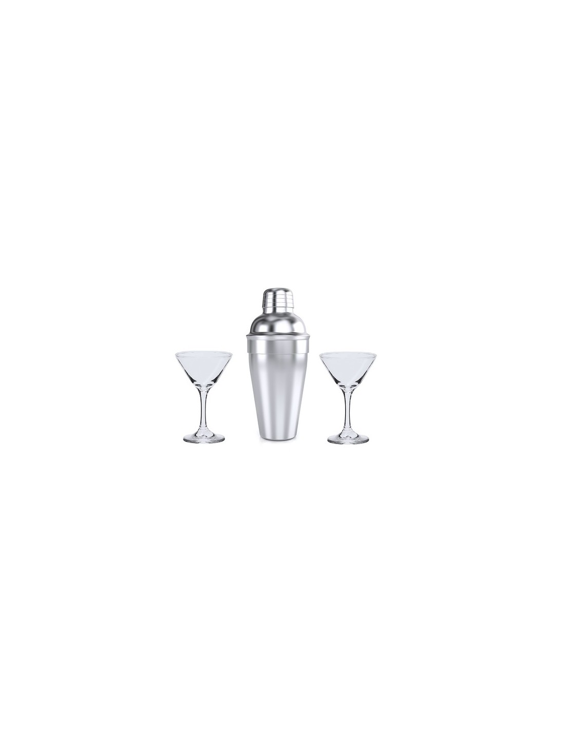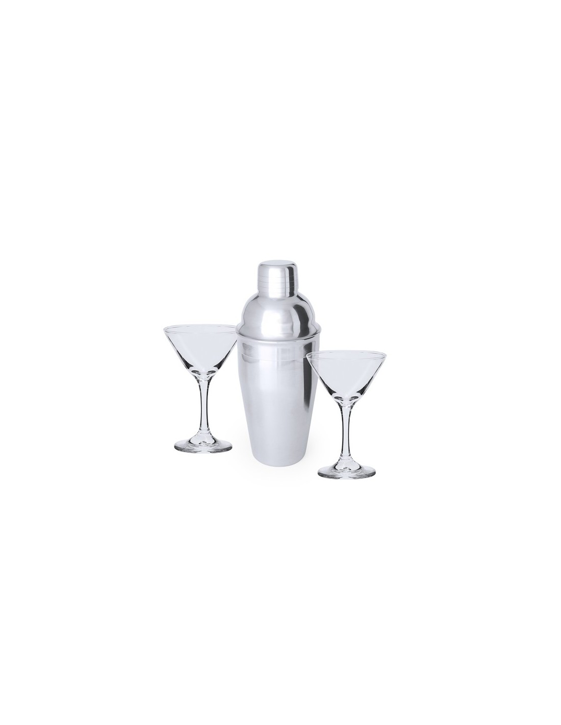 Elegante set de coctel. Conjunto de coctelera en acero inox de 550 ml para preparar las mejores mezclas de bebidas. Además, contiene 2 copas de cristal de 150 ml cada una y de elegante diseño triangular, para una presentación exquisita. Presentado en caja negra. Coctelera Acero Inox 550 ml. 2 Copas Cristal 150 ml