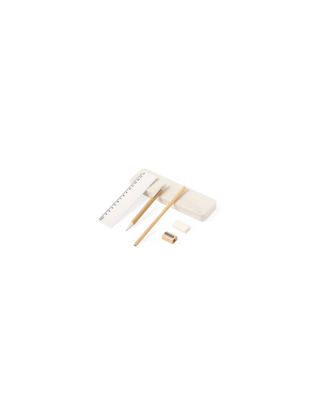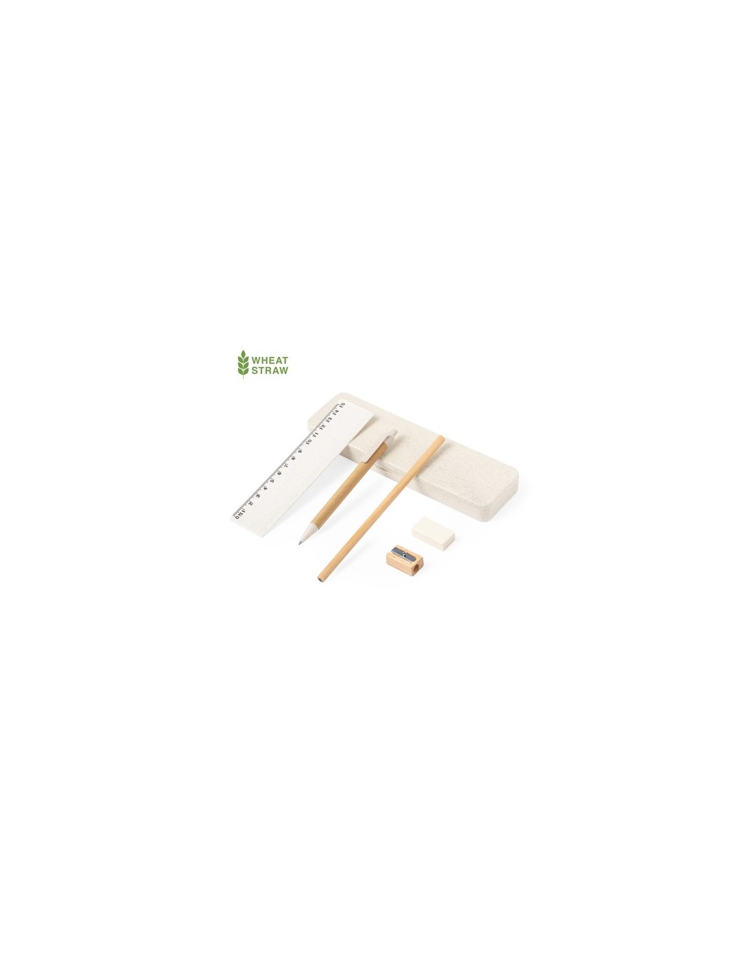 Set de escritura fabricado en caña de trigo. Práctico conjunto compuesto por: - Lápiz hecho en madera- Bolígrafo fabricado en cartón reciclado y caña de trigo- Regla hecha con caña de trigo- Sacapuntas de madera- Goma- Estuche hecho en caña de trigo. La caña de trigo fomenta la utilización de materias primas naturales, reduciendo así las emisiones contaminantes. 5 Piezas Composition : Caña de Trigo/ ABS.