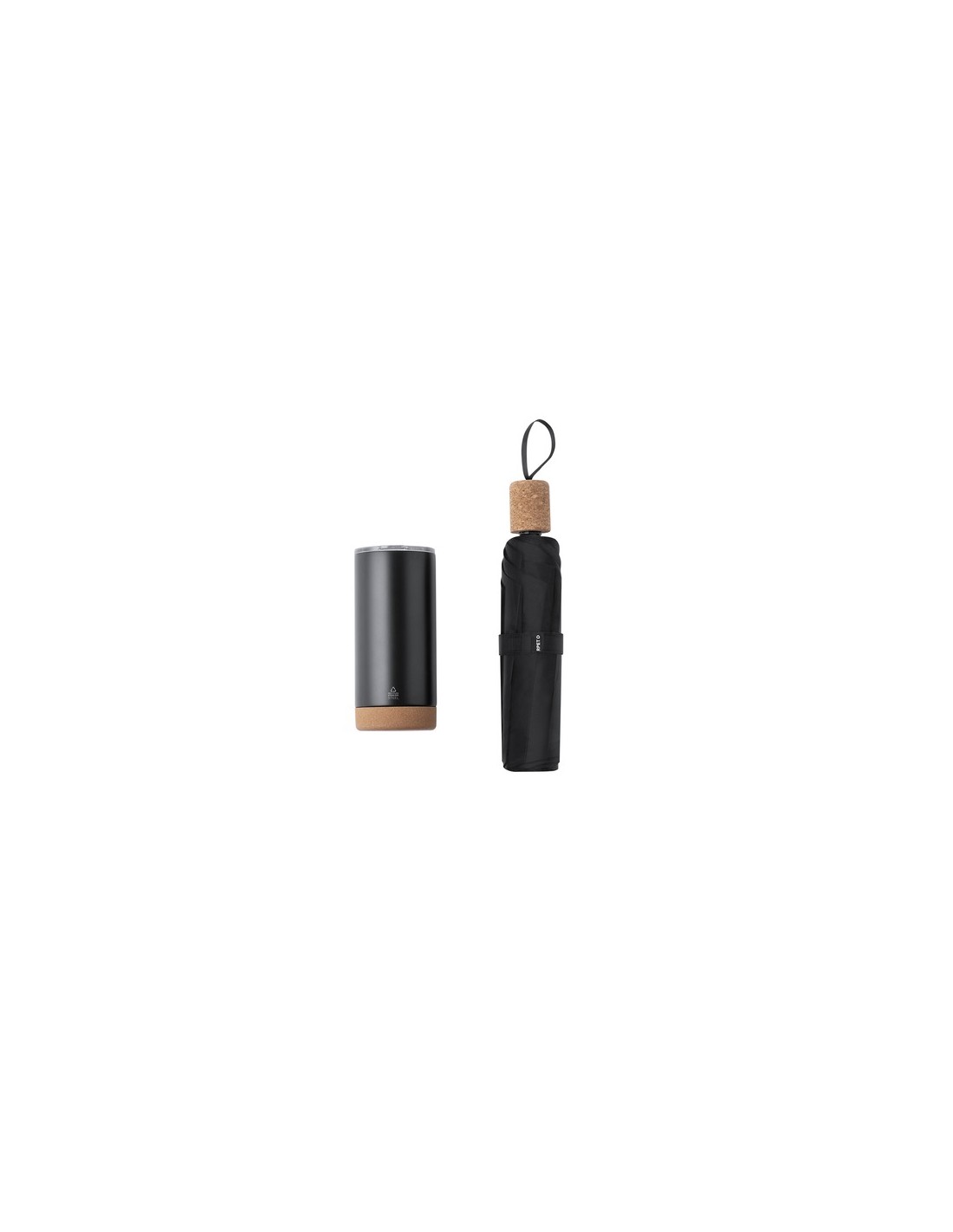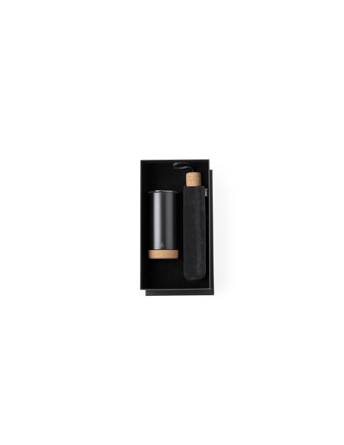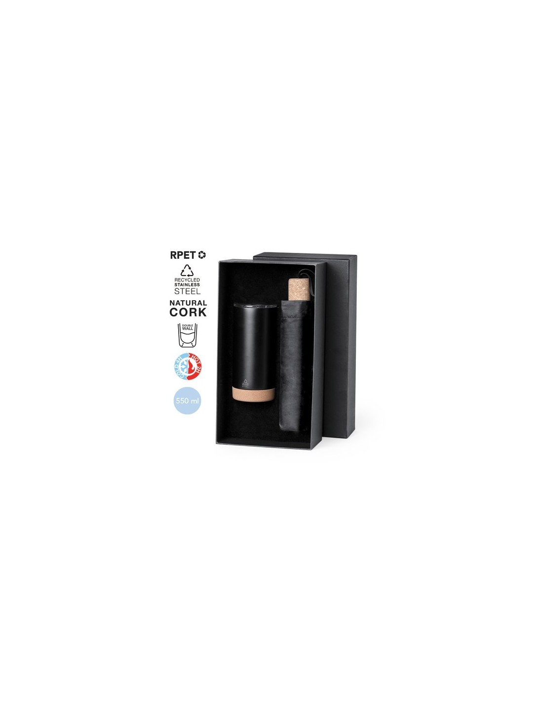 Elegante set premium que incluye: Vaso térmico de doble pared en Acero Inox Reciclado y 550 ml de capacidad, con elegante acabado negro mate. Base de corcho, con tapadera a presión y dosificador. Es ideal para tener en tu escritorio, mesa o en cualquier superficie donde disfrutar tranquilamente de tu bebida favorita. Paraguas plegable de color negro con 98cm de diámetro. En material pongee 190T RPET y mango de corcho. De apertura manual, con sistema anti viento y varillas en fibra de vidrio. Con etiqueta distintiva RPET. Set presentado en estuche individual de acabado mate, con troquelado interior para cada uno de los elementos del set. El material RPET se elabora a partir de plástico reciclado, para así fomentar la reutilización de residuos plásticos y ayudar a la sostenibilidad del planeta. Vaso Térmico Acero Inox Reciclado/ Corcho. 550 ml Composition : Paraguas Pongee 190T RPET. Varillas Fibra de Vidrio. 21". Sistema Antiviento. Mango Corcho. Funda Pongee RPET.