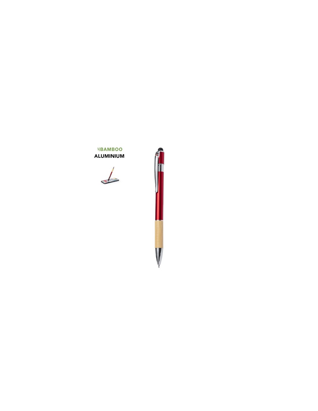 Elegante bolígrafo puntero de bambú y aluminio con mecanismo pulsador. Cuerpo en resistente aluminio de acabado brillante y empuñadura en bambú con puntero en la parte superior en negro. Caña en una amplia gama de distintivos colores metálicos. Clip metálico, con pulsador retráctil y en tinta azul. Presentado en bolsa individual reciclada.Materiales como el bambú fomentan la utilización de materias primas naturales, reduciendo las emisiones contaminantes. Proviene de una planta de gran resistencia y versatilidad, con crecimiento y regeneración rápidos, siendo una excelente alternativa al uso de madera tradicional. Composition : Aluminio/ Bambú.