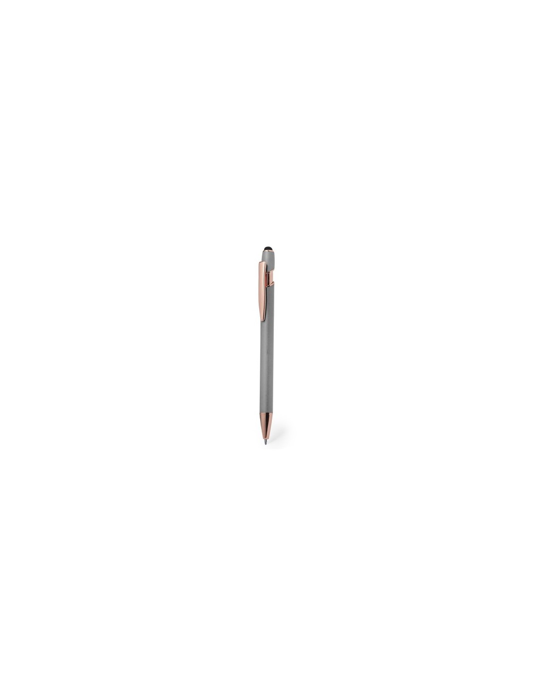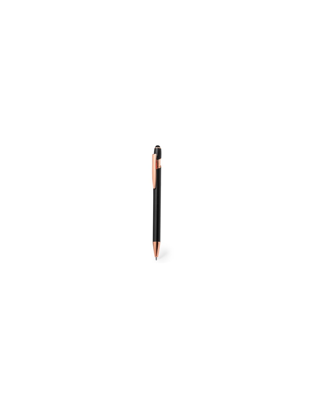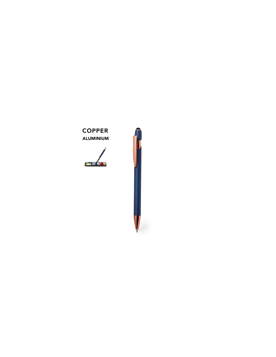 Excelente bolígrafo puntero de aluminio con mecanismo pulsador. Cuerpo en resistente aluminio de acabado mate con elementos decorativos de elegante acabado color cobre, con la caña en una amplia gama de distintivos colores. Clip metálico, con pulsador retráctil y puntero negro en la parte superior. En tinta azul. Presentado en una bolsa individual reciclada. Composition : Aluminio.
