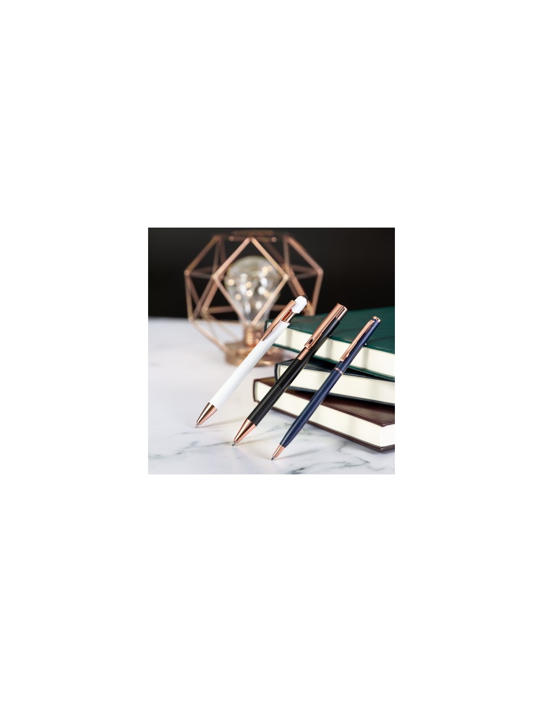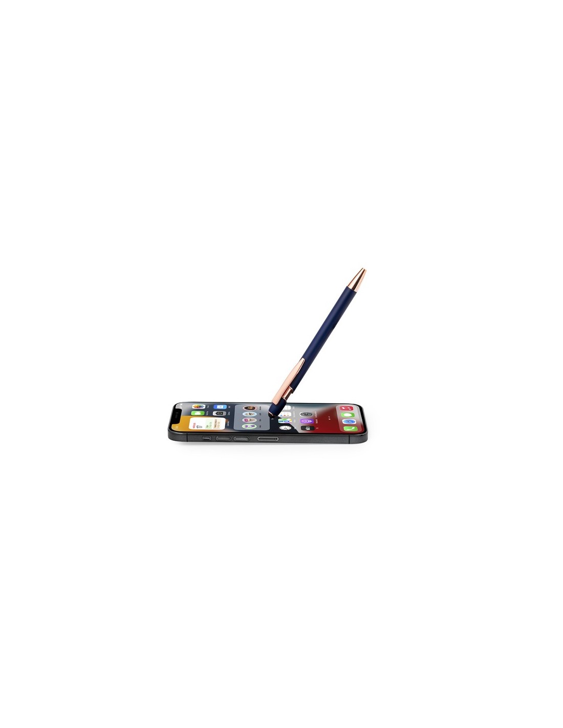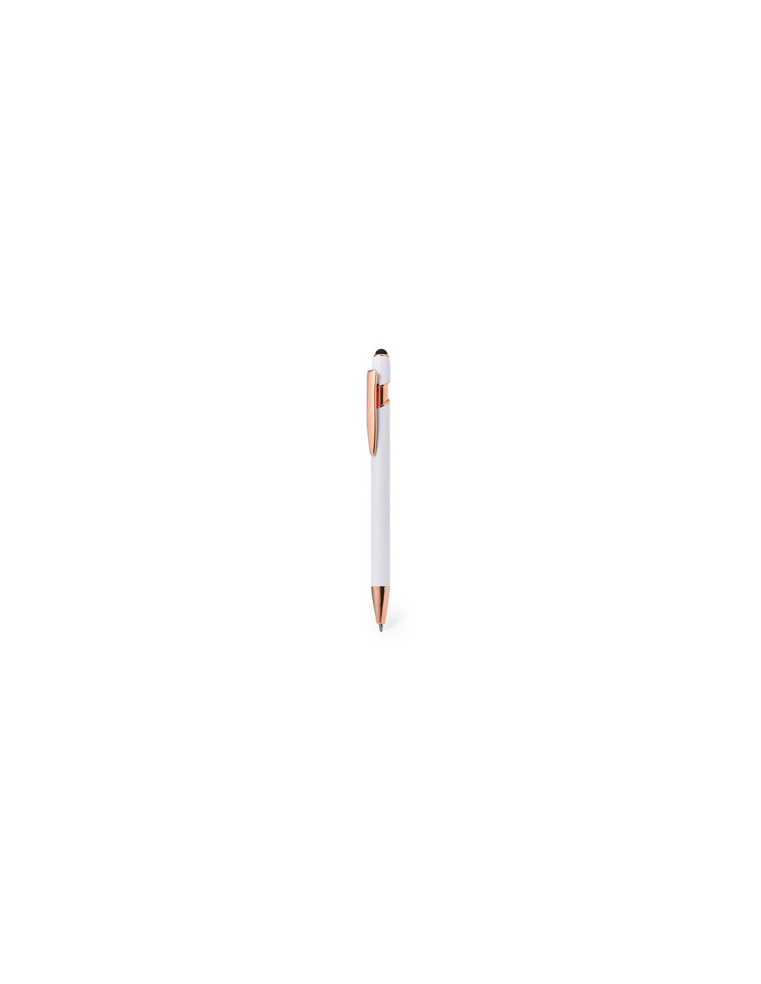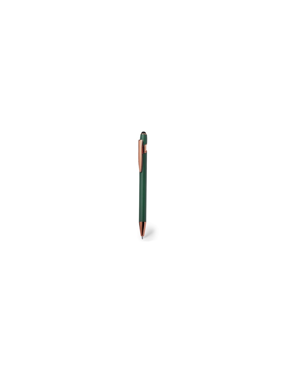 Excelente bolígrafo puntero de aluminio con mecanismo pulsador. Cuerpo en resistente aluminio de acabado mate con elementos decorativos de elegante acabado color cobre, con la caña en una amplia gama de distintivos colores. Clip metálico, con pulsador retráctil y puntero negro en la parte superior. En tinta azul. Presentado en una bolsa individual reciclada. Composition : Aluminio.