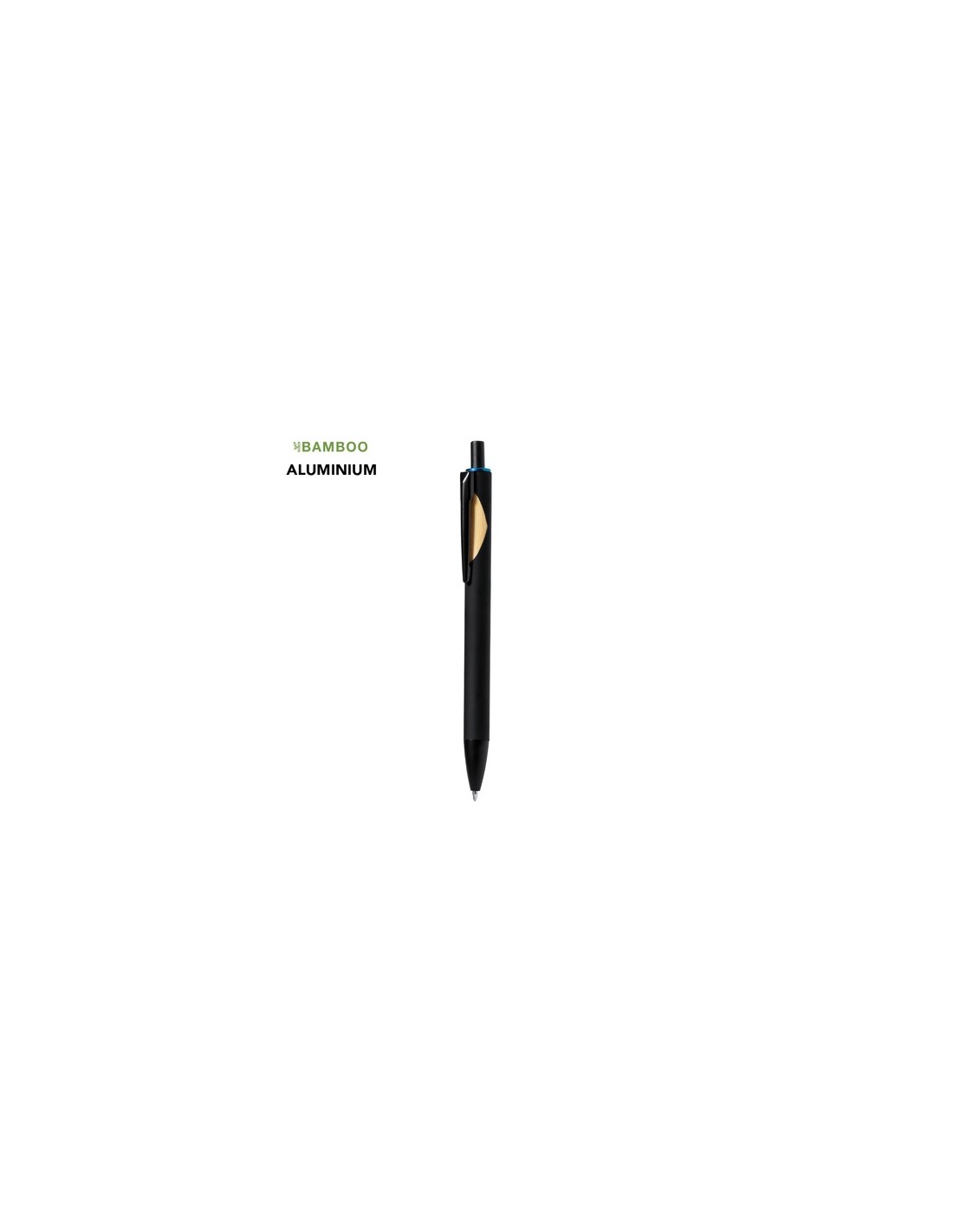 Bolígrafo de mecanismo pulsador con cuerpo de acabado sólido en color negro y detalle superior en variada gama de colores. Clip metálico en color negro con detalle en bambú. Especialmente diseñado para marcaje en láser y con un recubrimiento exterior especial para que tu publicidad quede perfectamente grabada y a juego. En tinta azul. Presentado en bolsa individual reciclada.Materiales como el bambú fomentan la utilización de materias primas naturales, reduciendo las emisiones contaminantes. Proviene de una planta de gran resistencia y versatilidad, con crecimiento y regeneración rápidos, siendo una excelente alternativa al uso de madera tradicional. Composition : Aluminio/ Bambú.