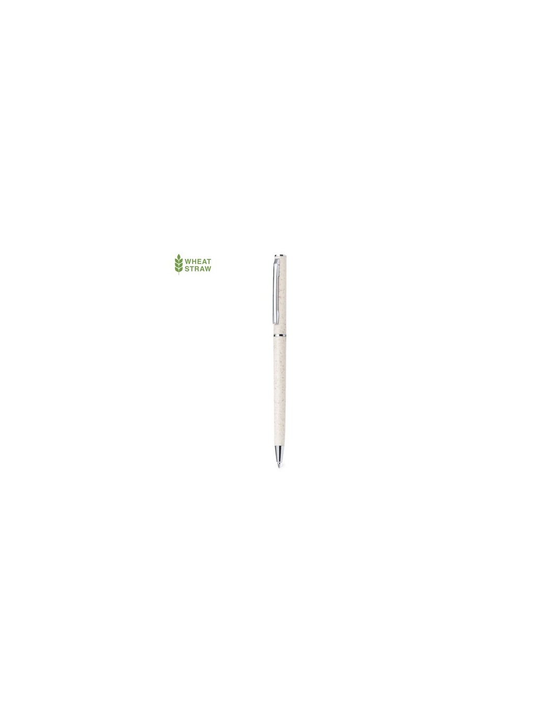 Bolígrafo con cuerpo en caña de trigo. Clip metálico y accesorios cromados. De mecanismo giratorio y de tinta azul. Con logotipo caña de trigo y disponible en color nature.La caña de trigo fomenta la utilización de materias primas naturales, reduciendo así las emisiones contaminantes. Composition : Caña de Trigo/ ABS.