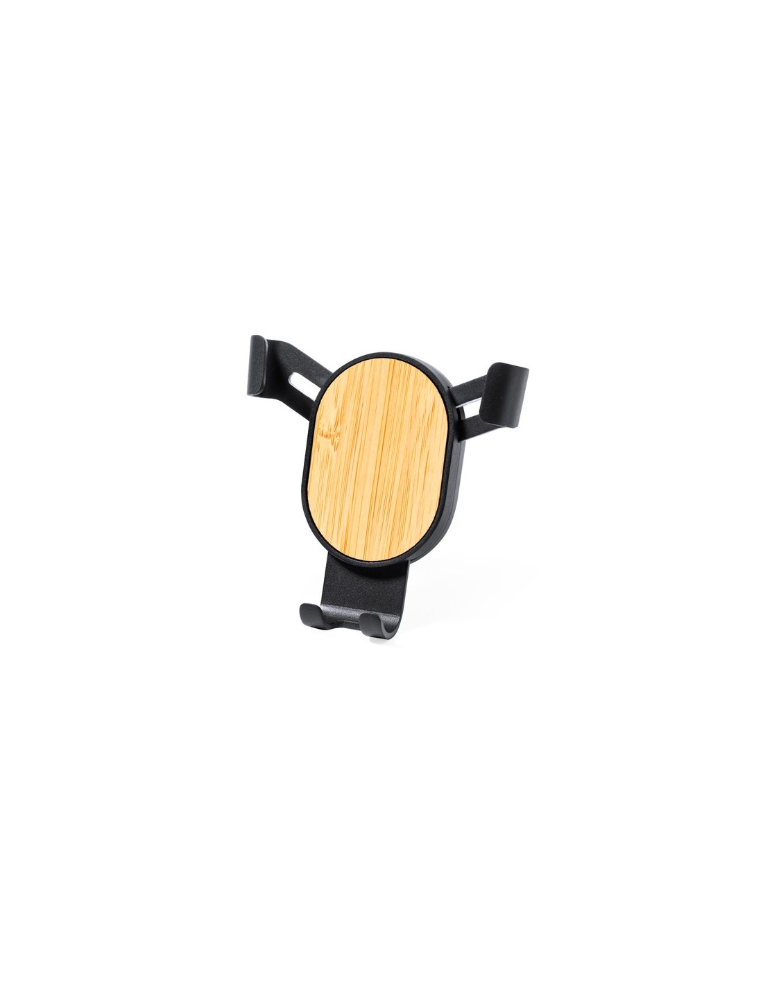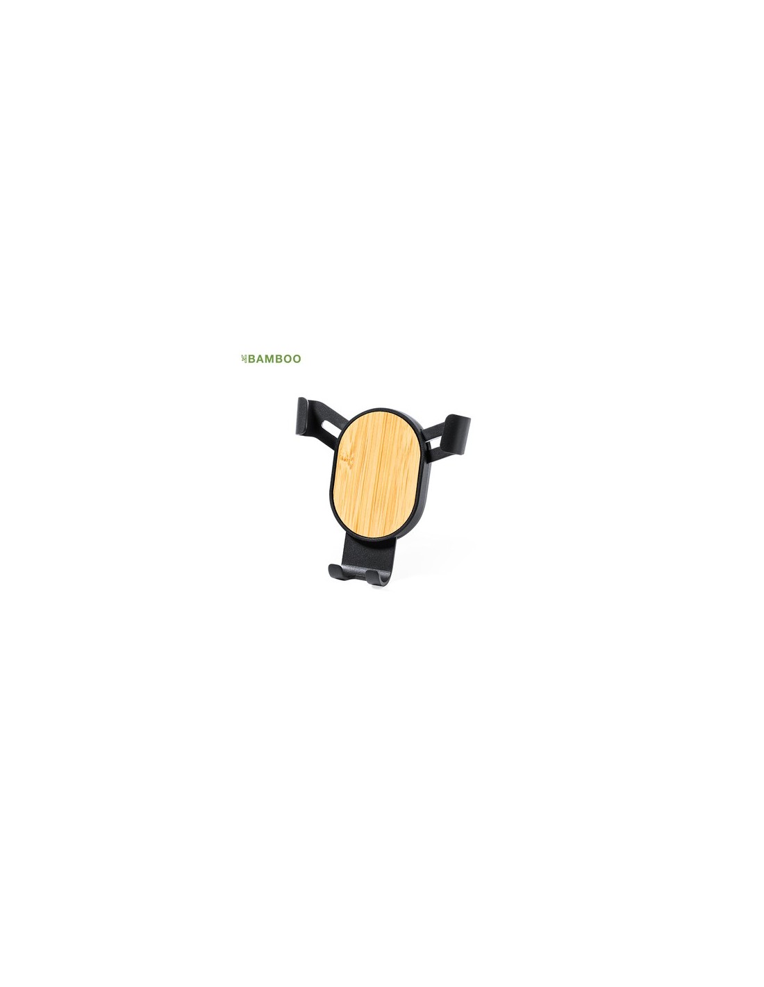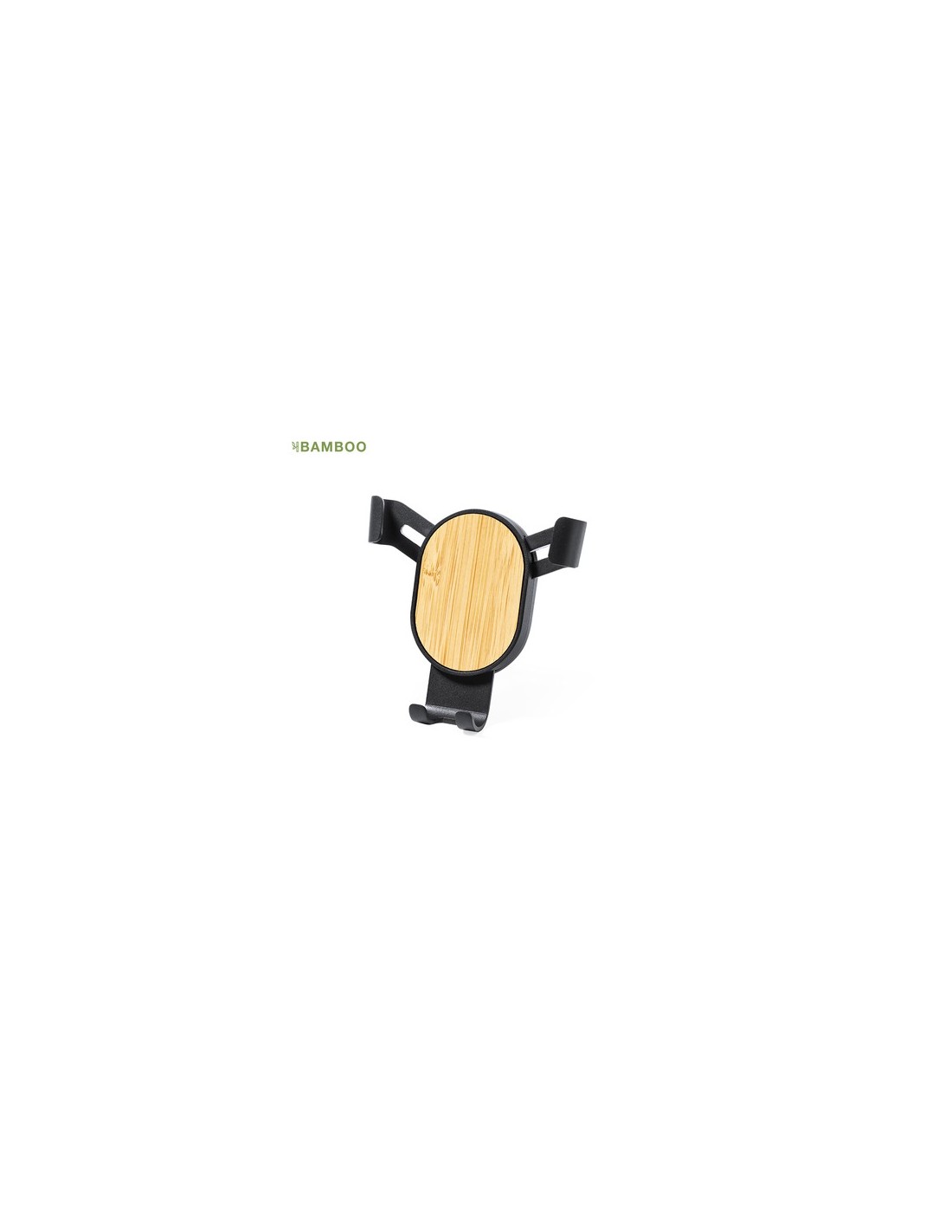 Ingenioso soporte para smartphone de diseño minimalista y especialmente diseñado para smartphones tamaño XXL. Elegante diseño negro con detalles en bambú, con sistema de fijación universal que se adapta por el propio peso del teléfono, ajustando las pinzas de agarre una vez que se sitúa el dispositivo en el soporte, con base rotatoria 360º. Para rejilla de ventilación del automóvil y con frontal especialmente diseñado para marcaje. Presentado en caja de diseño kraft. Materiales como el bambú fomentan la utilización de materias primas naturales, reduciendo las emisiones contaminantes. Proviene de una planta de gran resistencia y versatilidad, con crecimiento y regeneración rápidos, siendo una excelente alternativa al uso de madera tradicional. Ajustable Composition : ABS/ Bambú.