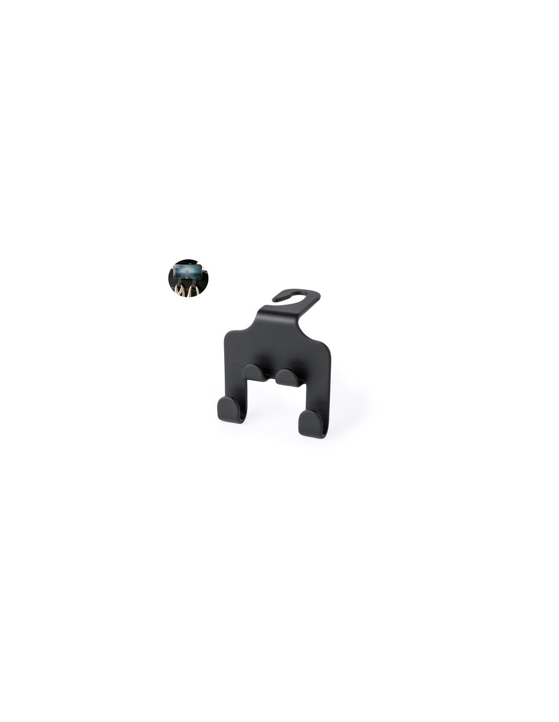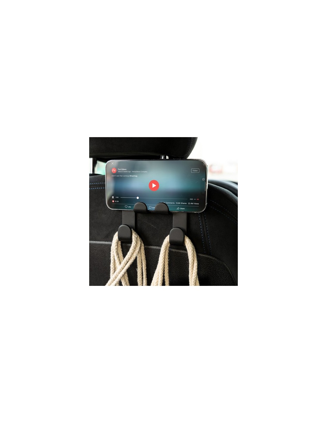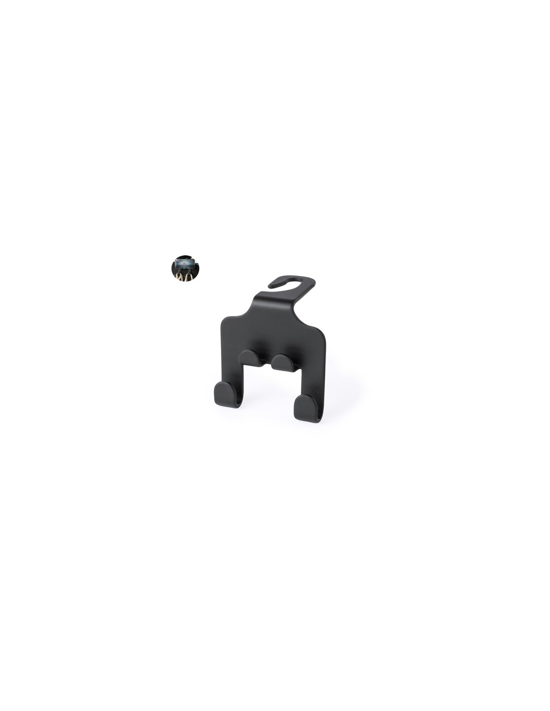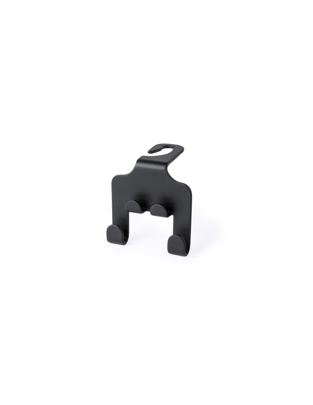 Resistente soporte fabricado en ABS. Fácil instalación mediante el gancho abierto diseñado para colocarse en el reposacabezas, con soporte para dispositivos móviles y dos ganchos adicionales para bolsas. Presentado en bolsa individual.