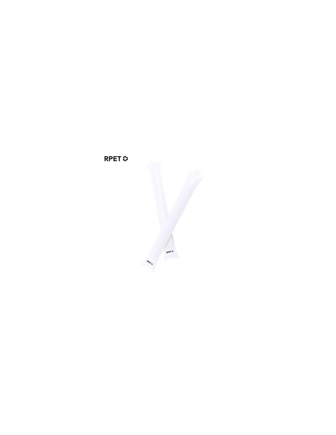 Par de bastom sticks/aplaudidores en resistente RPET y ruidoso material de color blanco. Reutilizables y con válvula de inflado incluida.El material RPET se elabora a partir de plástico reciclado, para así fomentar la reutilización de residuos plásticos y ayudar a la sostenibilidad del planeta. Presentado en bolsa de papel reciclada. Reutilizable. Válvula Inflado Incluida Composition : RPET.
