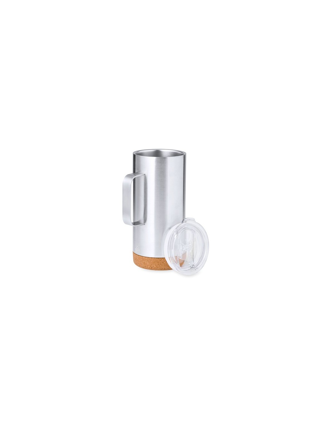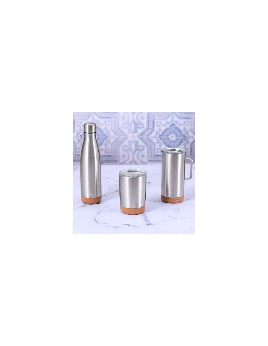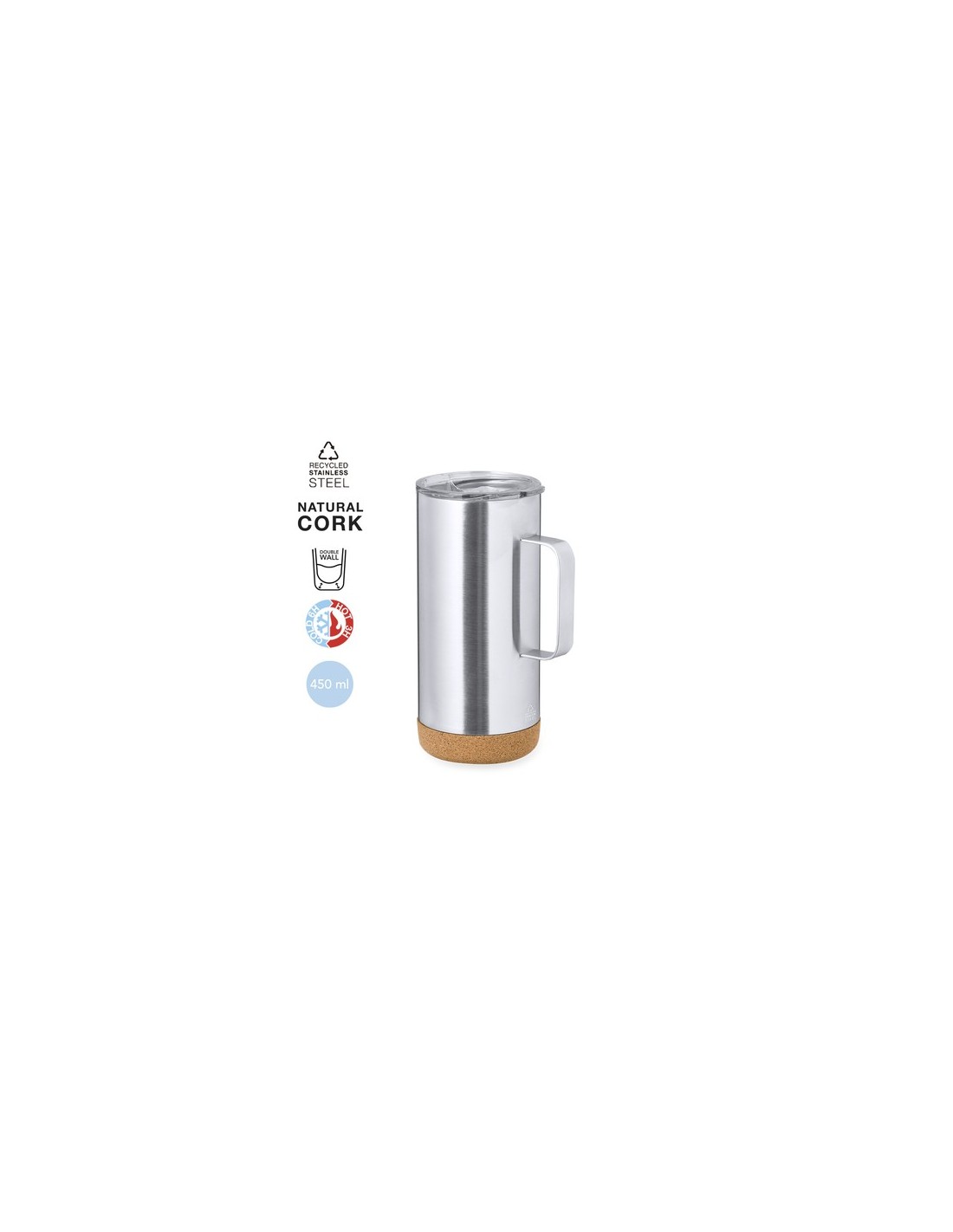 Taza térmica fabricada en acero inox reciclado de doble pared y 450 ml de capacidad. Con dosificador abrefácil en tapa, libre de BPA, y base en corcho natural. Con logotipo Acero Inox Reciclado. Es ideal para tener en tu escritorio, mesa o en cualquier superficie donde disfrutar tranquilamente de tu bebida favorita. El acero es uno de los materiales más demandados y que puede encontrarse casi en todas partes, desde productos de uso diario a grandes construcciones. Con innumerables propiedades, entre las que cabe destacar la durabilidad y su alto grado de reutilización, convirtiéndolo en una alternativa muy valorada en soluciones de sostenibilidad. Debidamente tratado, permite obtener nuevos recursos de infinita utilización. 450 ml Composition : Acero Inox Reciclado/ Corcho.