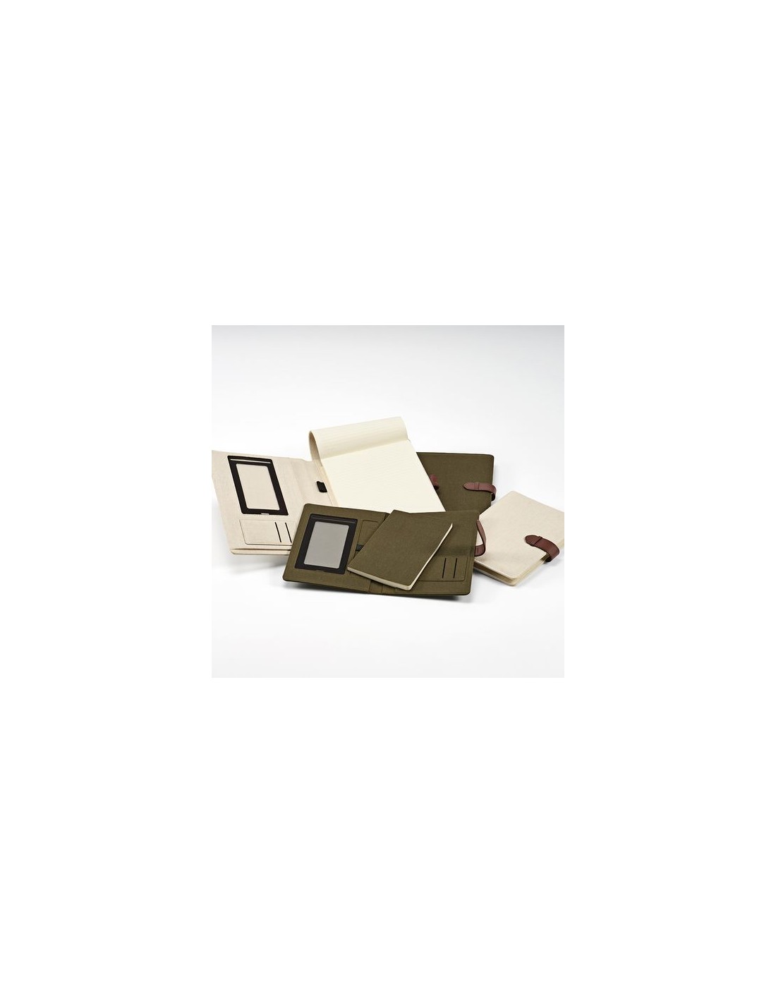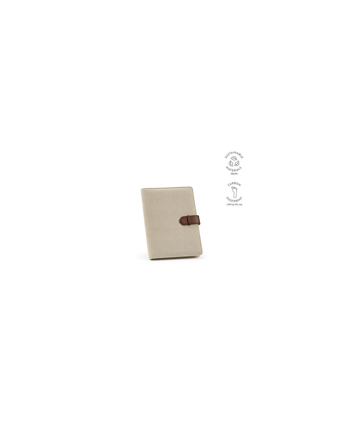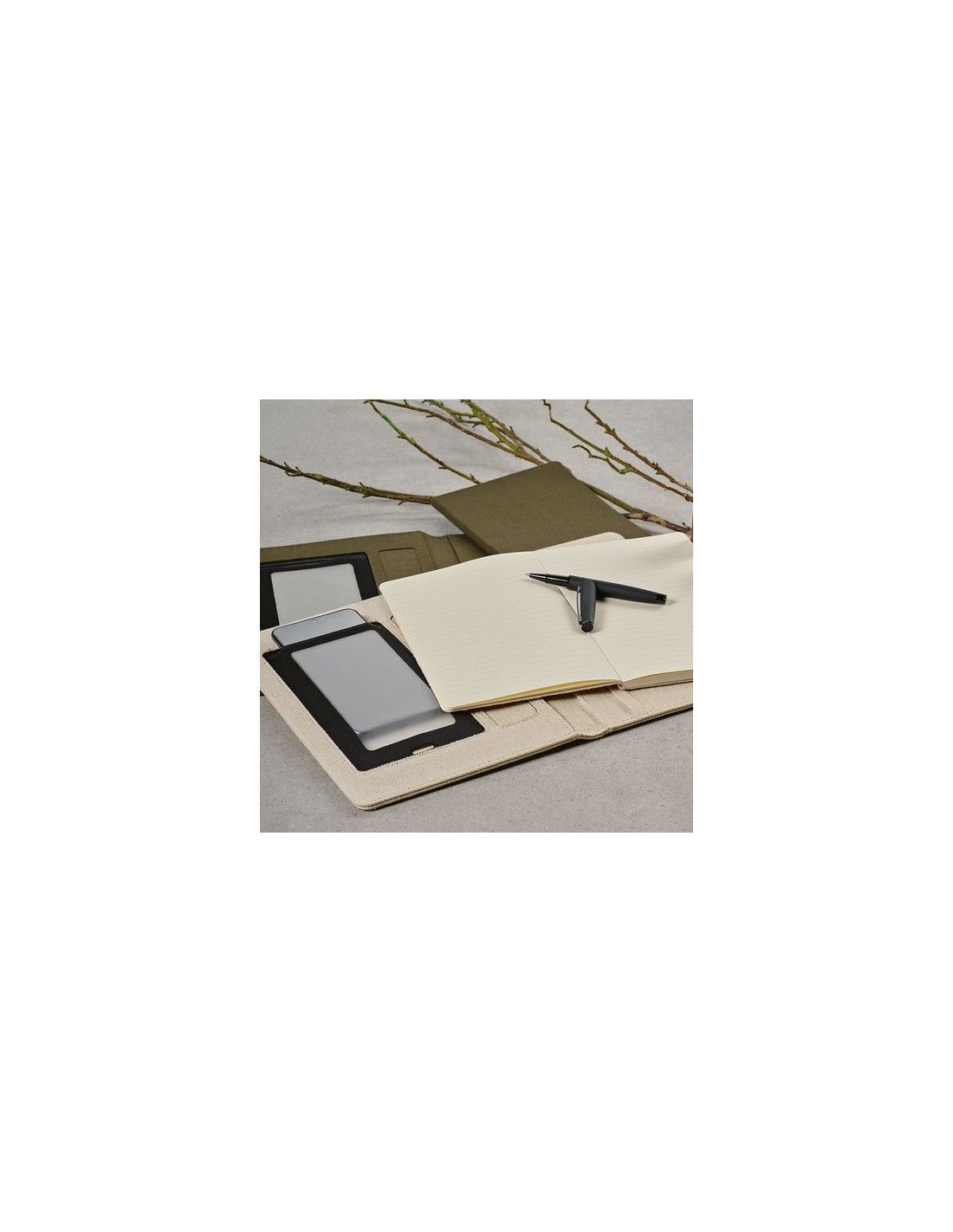 Nuestra carpeta A5 de lona de algodón reciclado ecológica cuenta con un práctico cierre a presión de PU reciclado, un bloc de 64 páginas con puntos FSC (70 g/m2), un bolsillo para el teléfono, un portalápices doble y ranuras para tarjetas. Diseñado para la sustentabilidad, es su elegante compañera hacia el éxito. Material : Algodón Reciclado Percentage Recycled Material : 98 CO2 Footprint : 1,47 Printing Technique Default : Tránsfer.