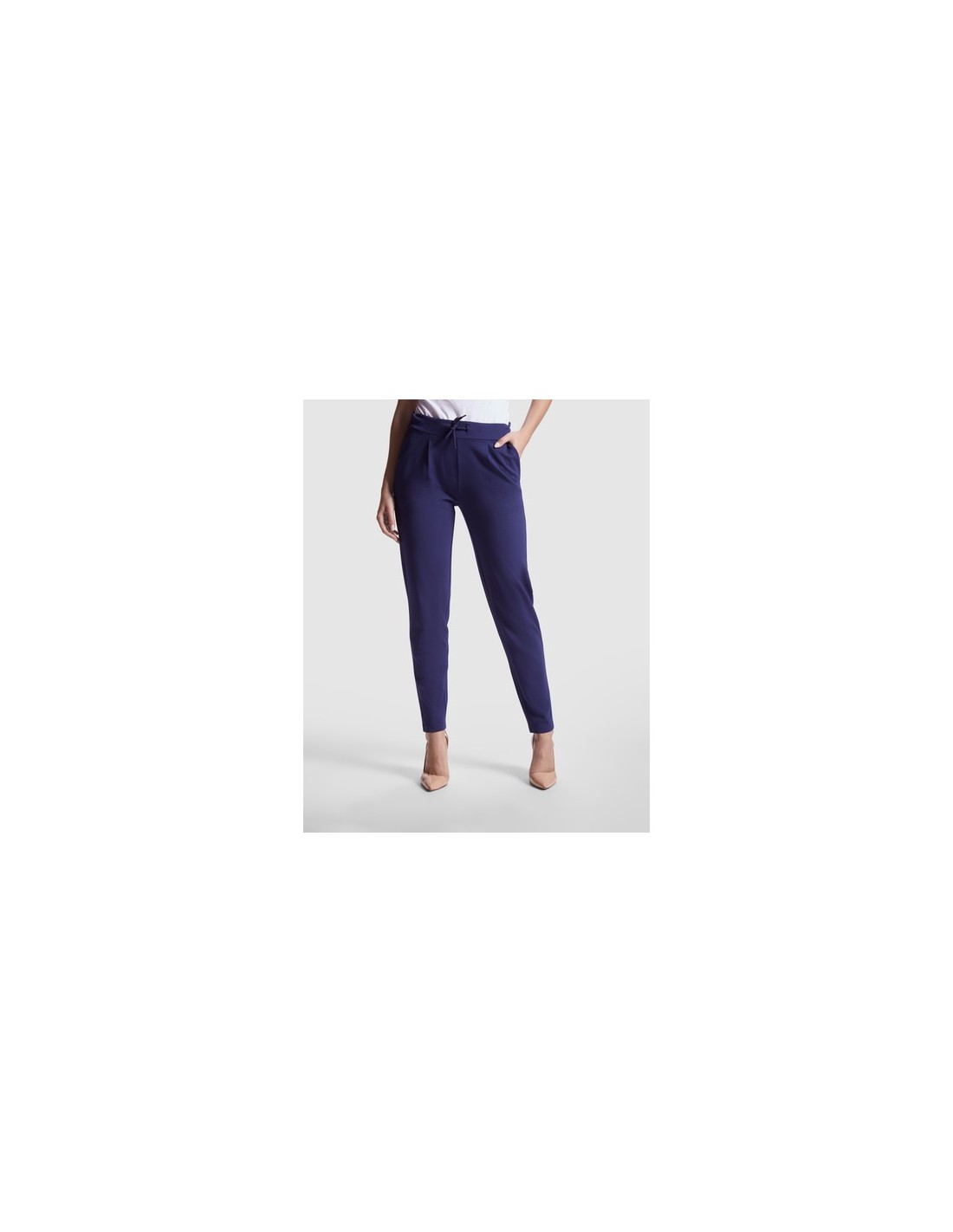 Pantalón de mujer en tejido elástico.· Cinturilla con cordón ajustable y elástico en la parte trasera.· Pinzas en la parte delantera.· Dos bolsillos frontales.· Dos bolsillos traseros decorativos *Etiqueta removible Composition : 65% viscosa / 31% poliamida / 4% elastano, 325 g/m².