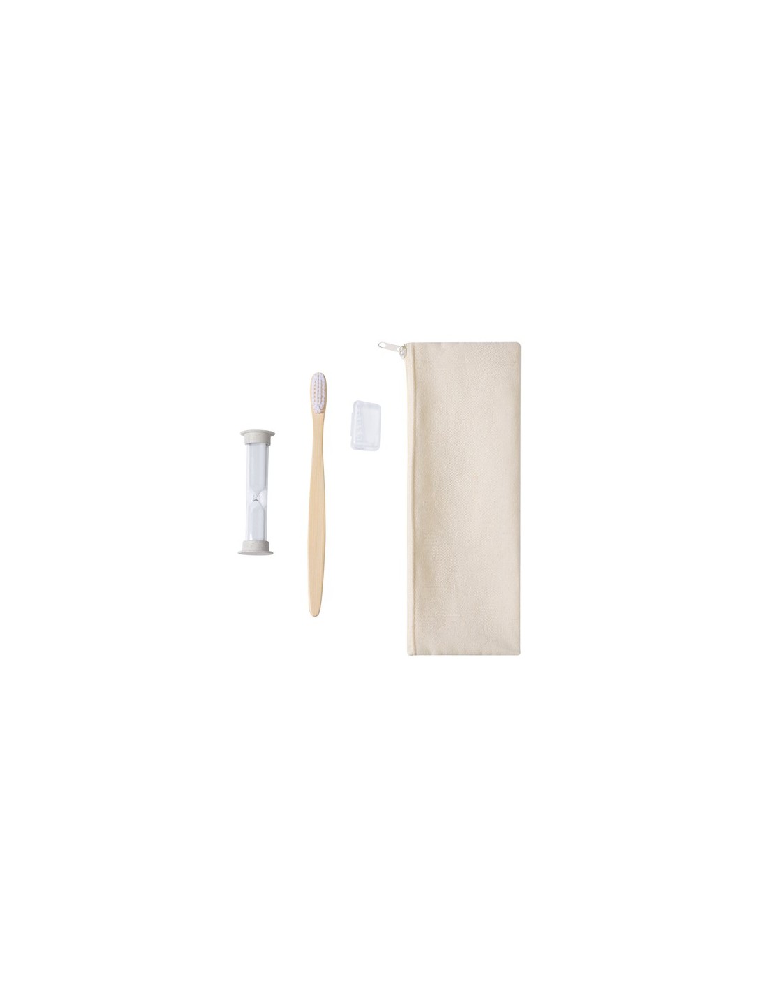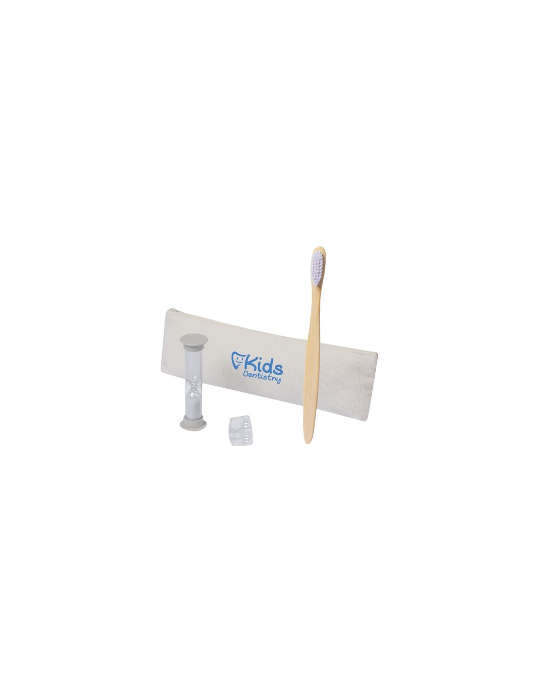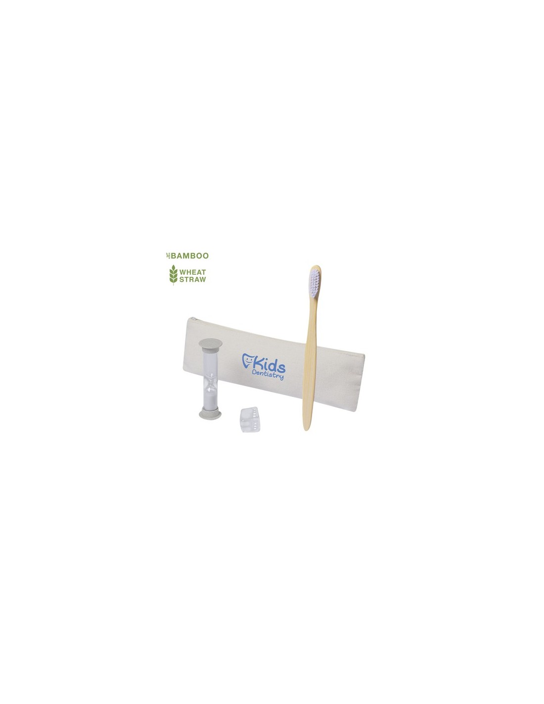 Set de cepillo de dientes y reloj de arena fabricado en bambú y caña de trigo. Incluye cepillo con mango ergonómico hecho en suave bambú con capucha protectora. Además, incluye un reloj de arena de 2 minutos de duración fabricado en caña de trigo. Presentado un práctico estuche hecho de algodón transpirable. La caña de trigo fomenta la utilización de materias primas naturales, reduciendo así las emisiones contaminantes. Cepillo Dientes Bambú. Reloj Arena Caña de Trigo/ ABS, 2 Minutos. Funda Algodón