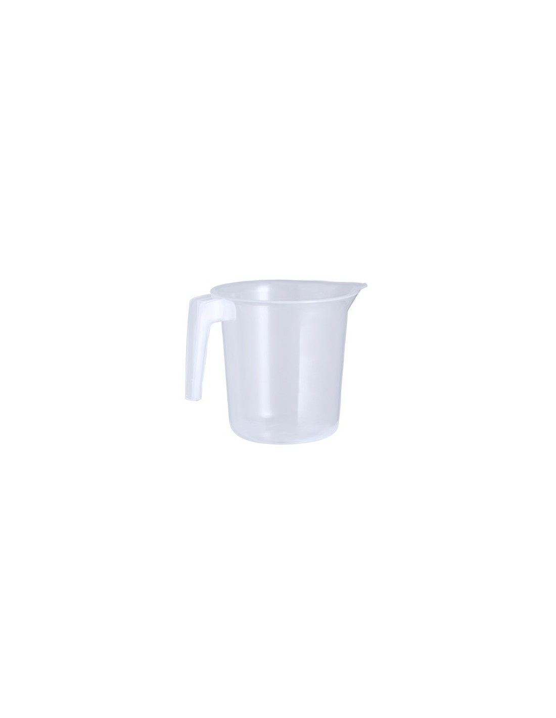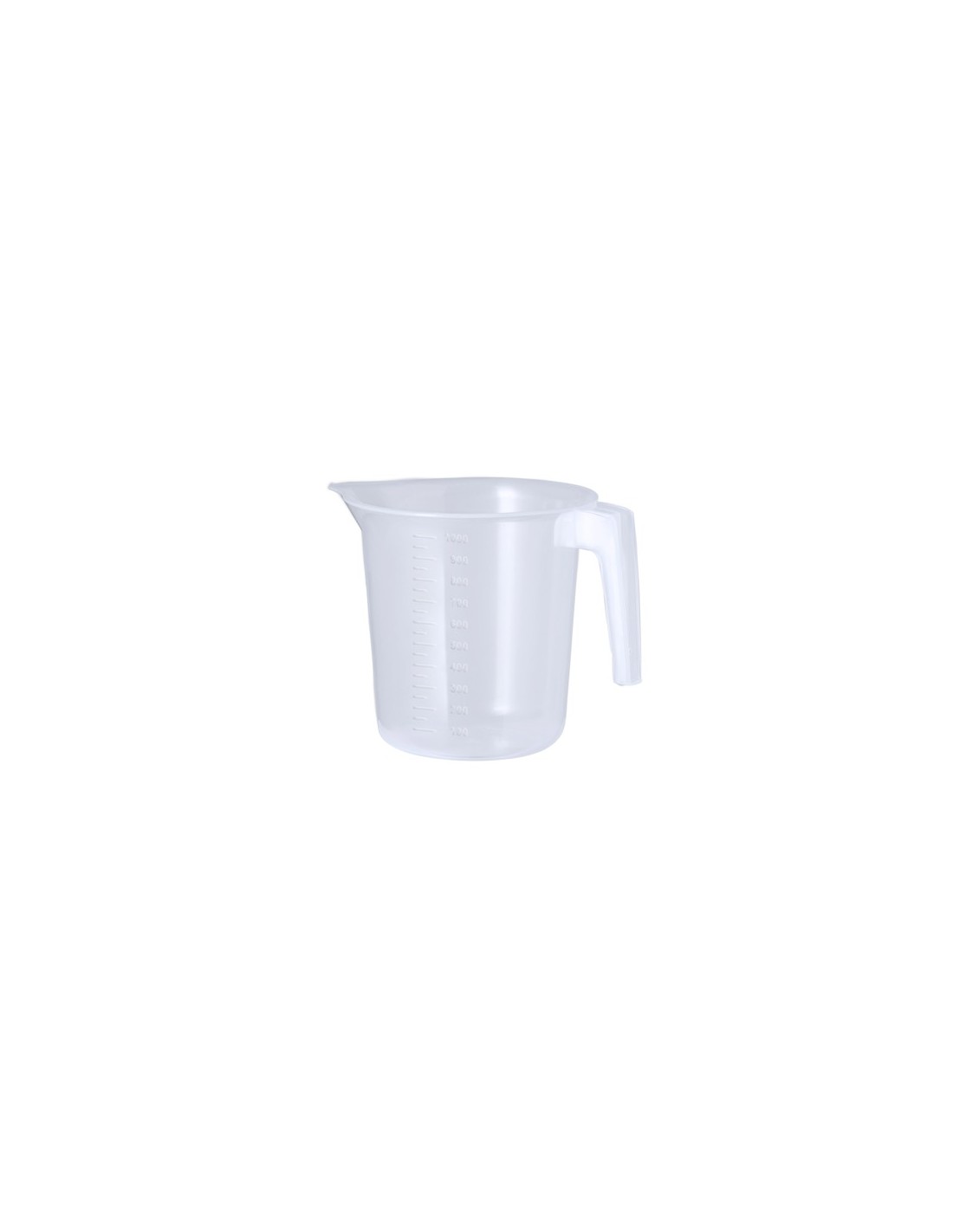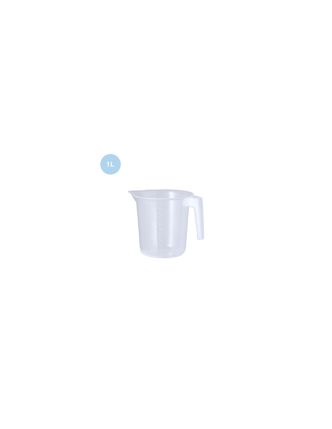 Jarra medidora de 1L fabricada en resistente PP transparente con asa. Con medidor lateral en tramos de 50 ml y vertedor en el borde para evitar derrames. 1 L Composition : PP.