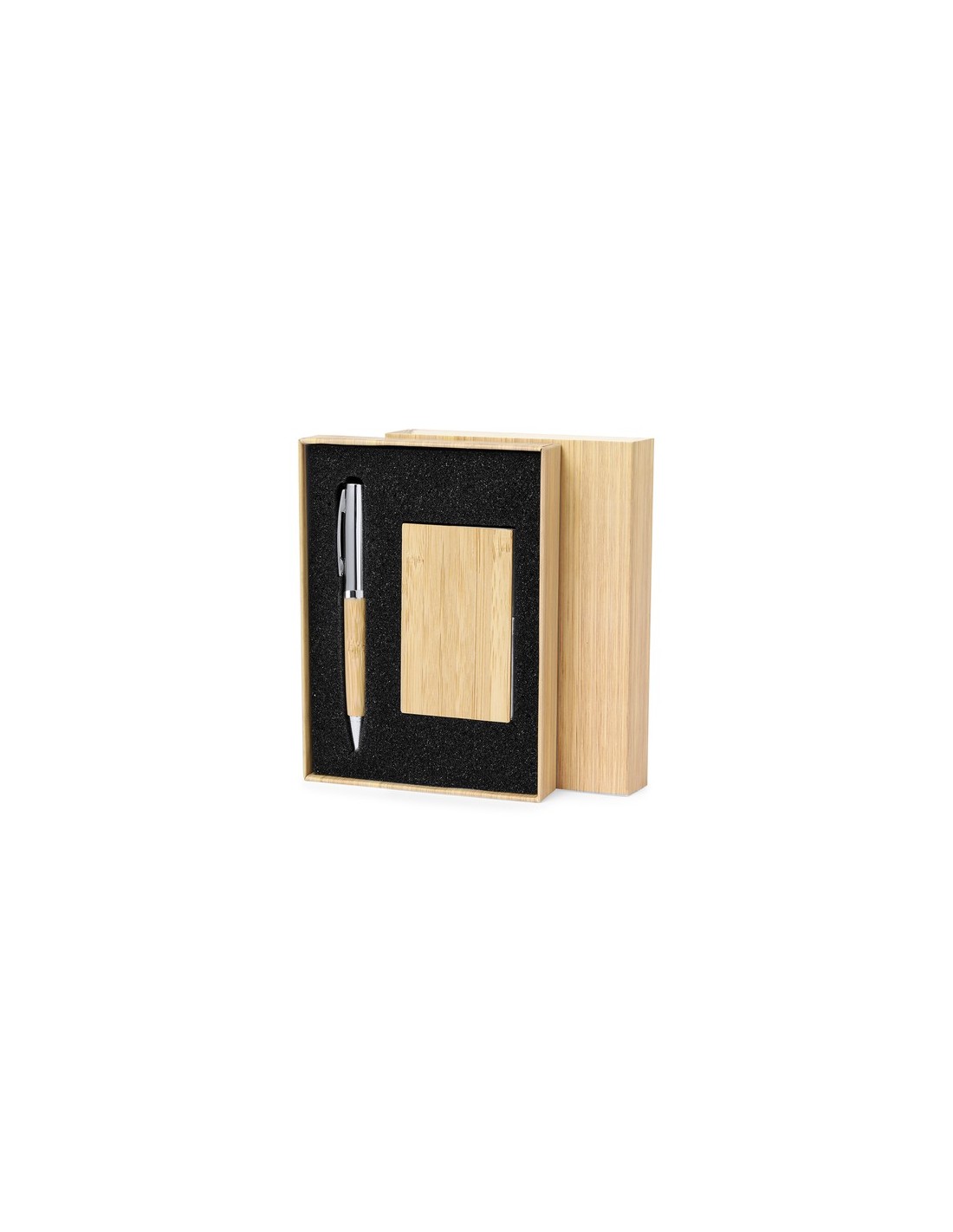 Distinguido set de bolígrafo y tarjetero fabricados en bambú y metal. Práctico conjunto de bolígrafo con cuerpo metálico brillante y empuñadura de suave bambú con mecanismo giratorio y en tinta azul. Incluye excelente tarjetero de un compartimento en brillante metal, con tapa en suave bambú. Presentado en una caja individual diseño bambú.Materiales como el bambú fomentan la utilización de materias primas naturales, reduciendo las emisiones contaminantes. Proviene de una planta de gran resistencia y versatilidad, con crecimiento y regeneración rápidos, siendo una excelente alternativa al uso de madera tradicional. Tarjetero 1 Compartimento. Bolígrafo Composition : Metal/ Bambú.