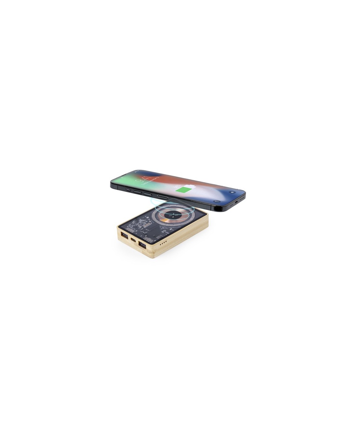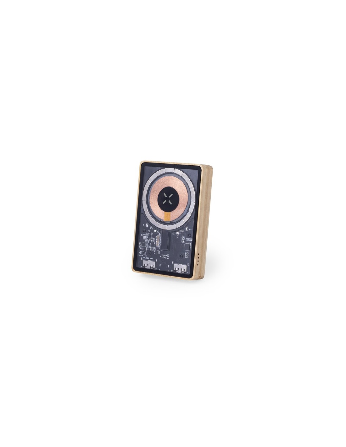 Batería auxiliar externa de original diseño y superficie transparente que permite ver los componentes internos del dispositivo. 5.000 mAh de capacidad de carga, con base en bambú y cargador inalámbrico integrado 15W. Conexiones de entrada/salida Tipo C + salida USB. Fijación magnética Magsafe y compatible con dispositivos equipados con tecnología de carga inalámbrica Qi. Cable de carga incluido, con manual de instrucciones en español e inglés. Presentada en caja individual de diseño eco y en cartón kraft.Entrada/Salida Tipo C: 5-12V DC 3-1.67A, 20WSalida USB: 5-12V DC 3-1.5A, 18WLas capacidades mostradas en todas nuestras baterías auxiliares externas son reales, incorporando todas ellas baterías de grado A y no recicladas, con una vida útil de al menos 500 ciclos de carga y según normativa CE. Además, están fabricadas conforme a los estándares RoHS y en cumplimiento con los siguientes requisitos de seguridad:Sistema de protección contra sobrecarga del power bank.Sistema de protección contra descarga completa que proporciona una mayor durabilidad del power bank.Sistema de bloqueo para evitar cortocircuitos.Sistema de transferencia de carga constante, acorde con la capacidad del dispositivo de destino.Materiales como el bambú fomentan la utilización de materias primas naturales, reduciendo las emisiones contaminantes. Proviene de una planta de gran resistencia y versatilidad, con crecimiento y regeneración rápidos, siendo una excelente alternativa al uso de madera tradicional. Inalámbrico 15W. Magnético. 5000 mAh. Salida y Entrada Tipo C Composition : Bambú.