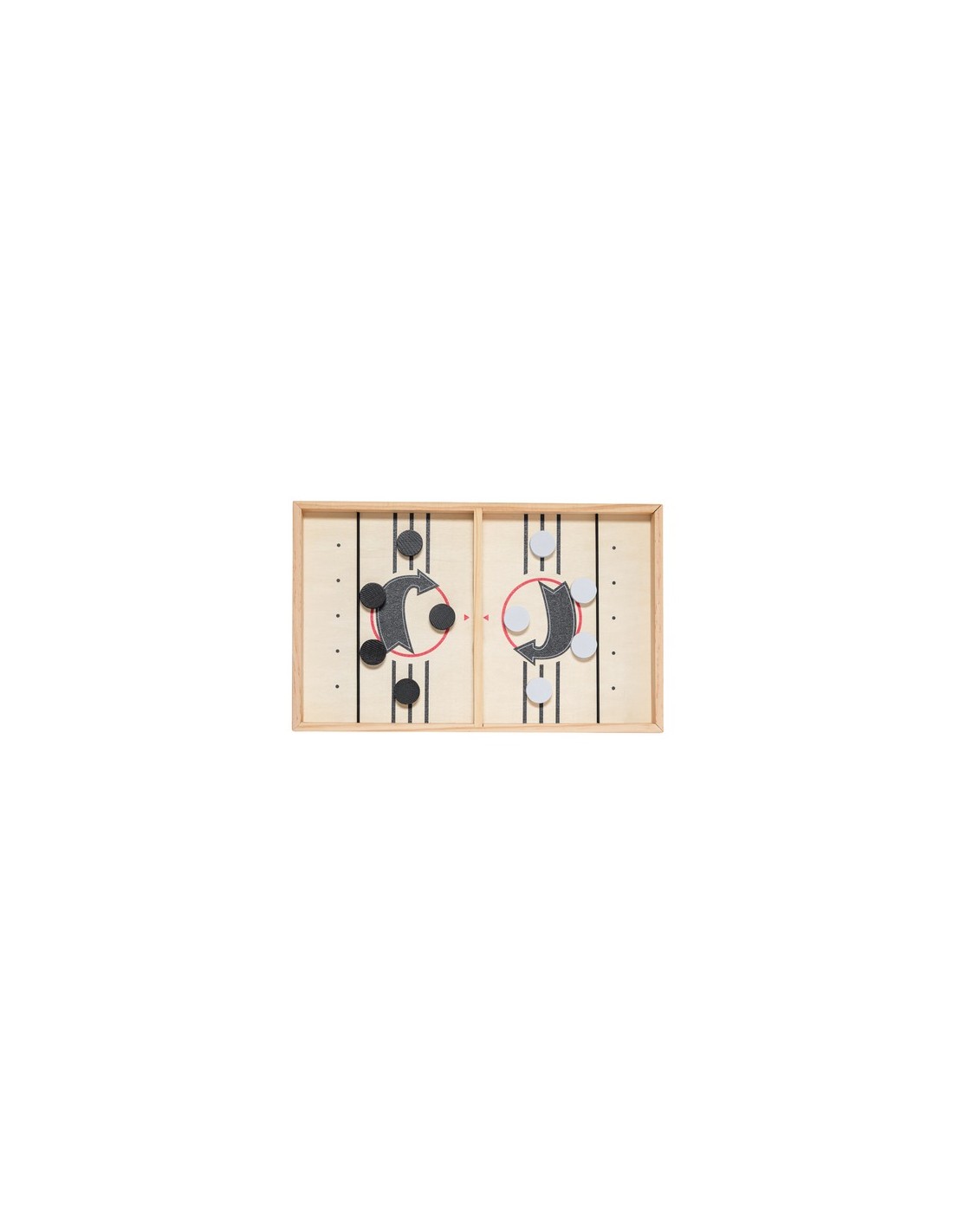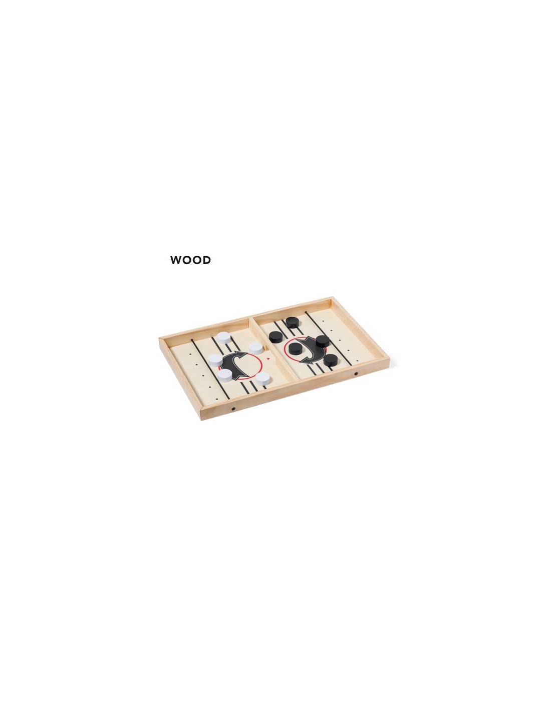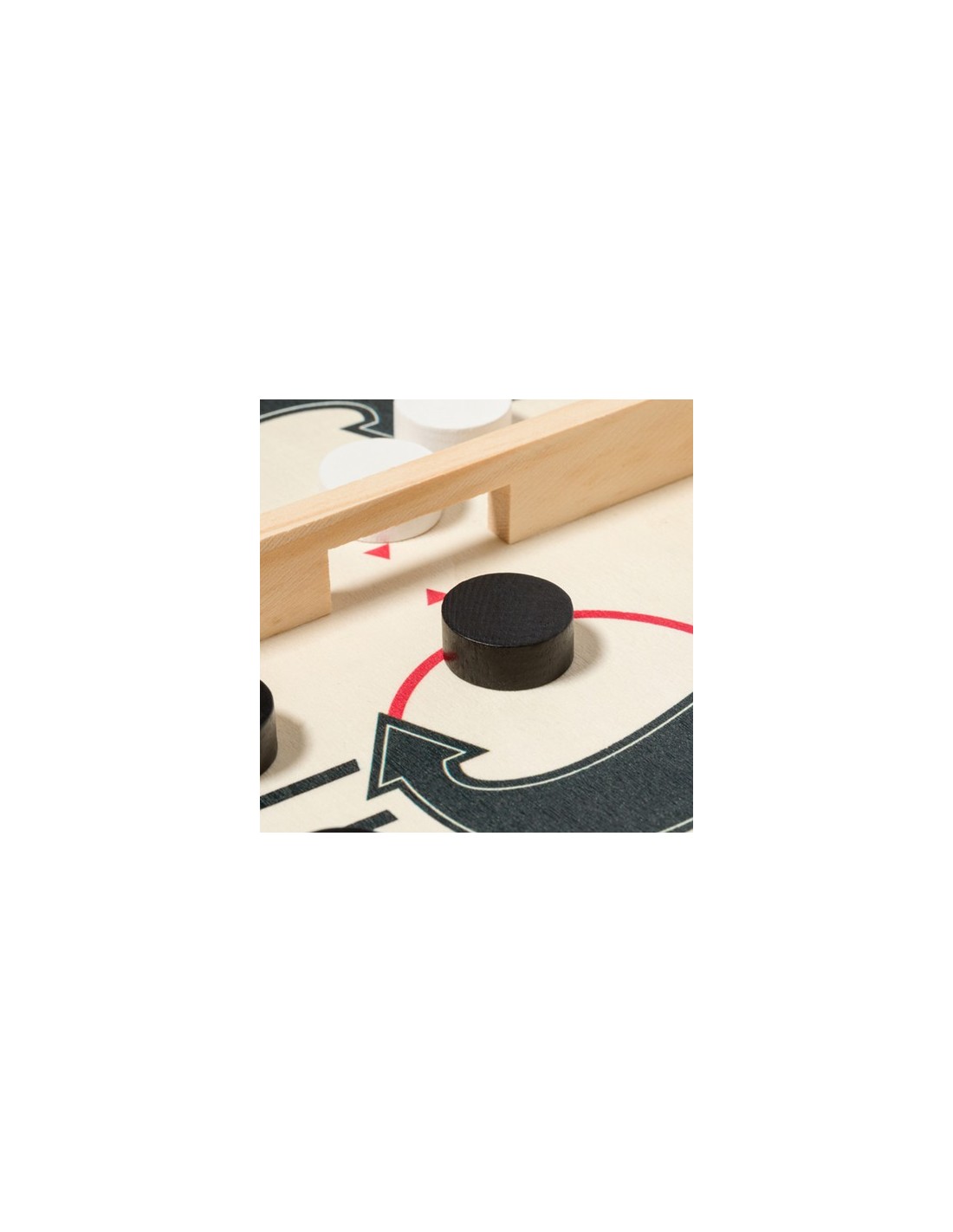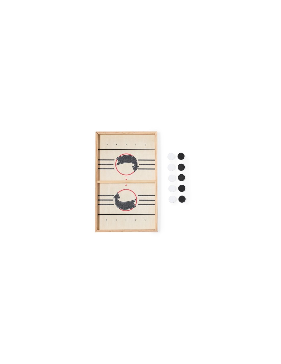 Divertido juego de mesa fabricado en madera e ideal para los más competitivos. El juego consiste en lanzar las fichas desde cada campo al capo contrario usando el elástico. Gana el que más fichas cuele por la ranura del oponente. Tablero con 5 fichas blancas y 5 negras, presentado en una caja individual de diseño kraft. 10 Piezas Composition : Madera.