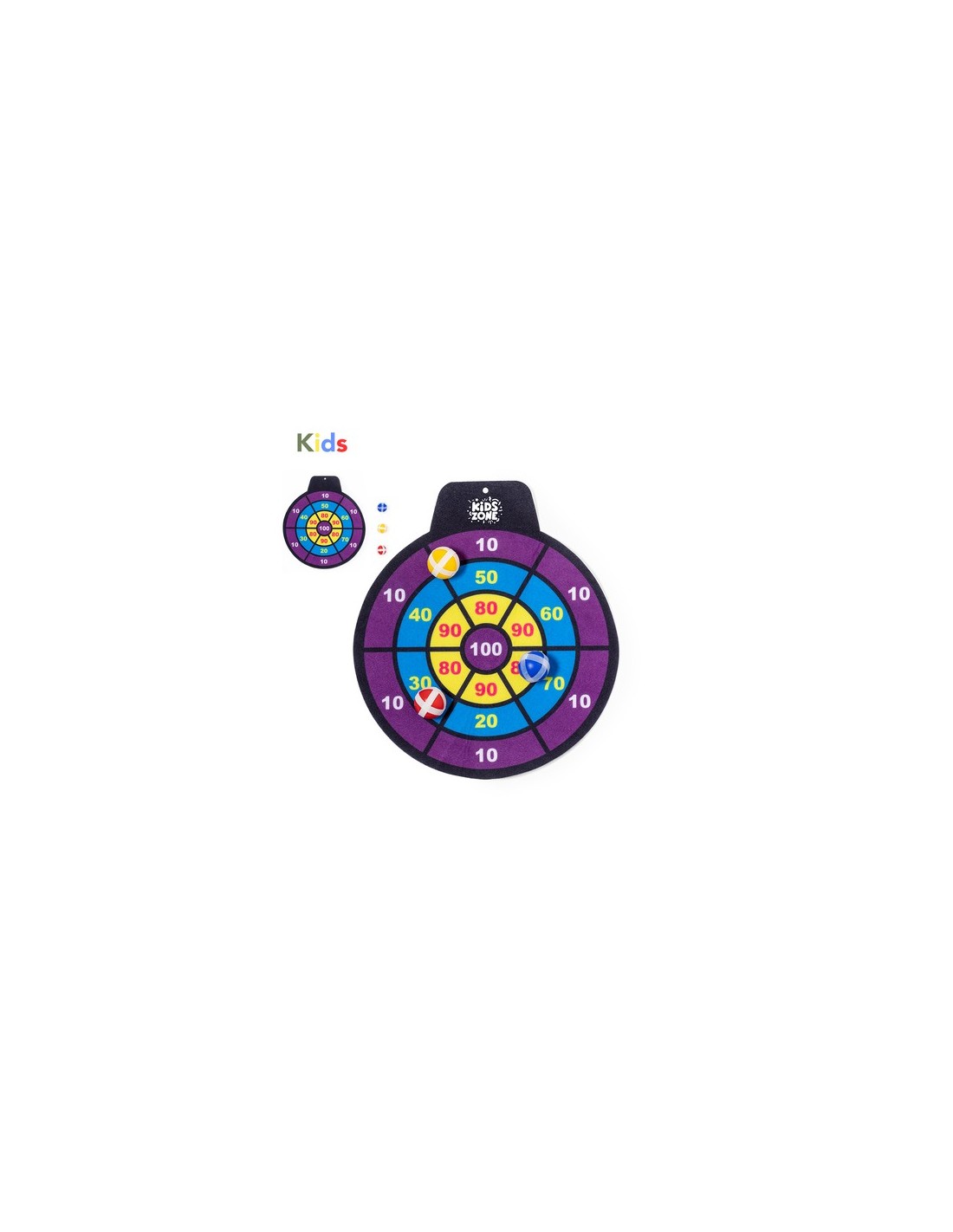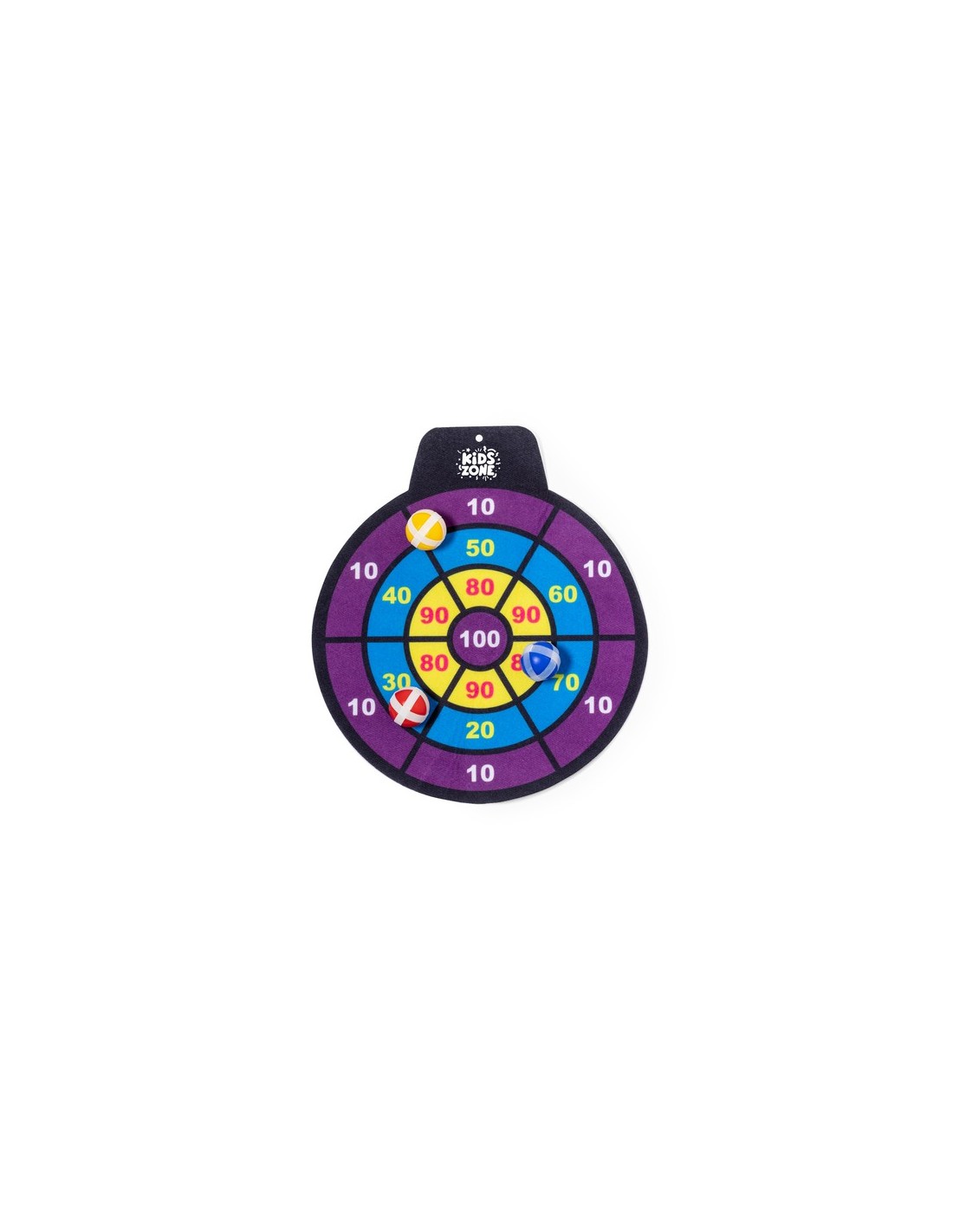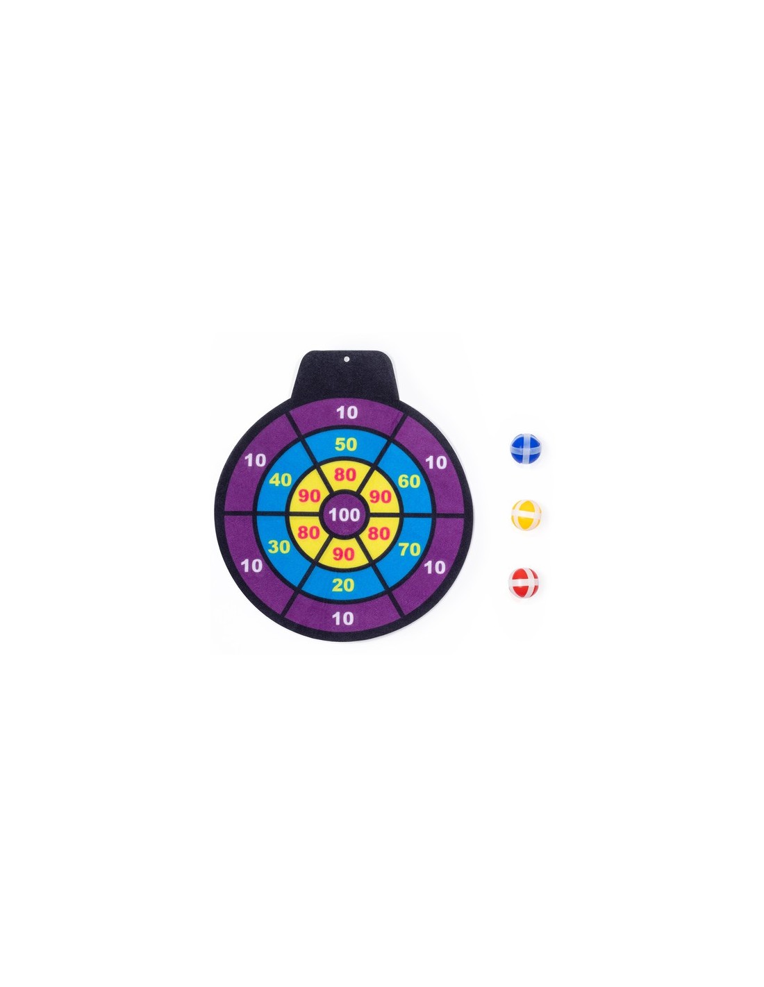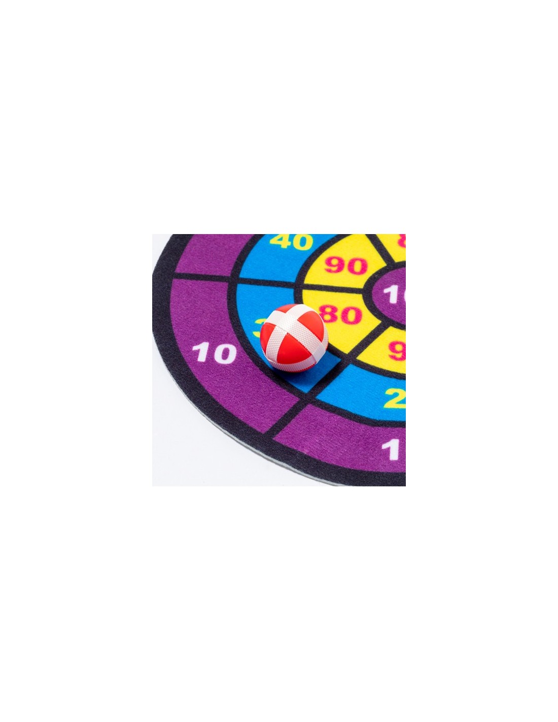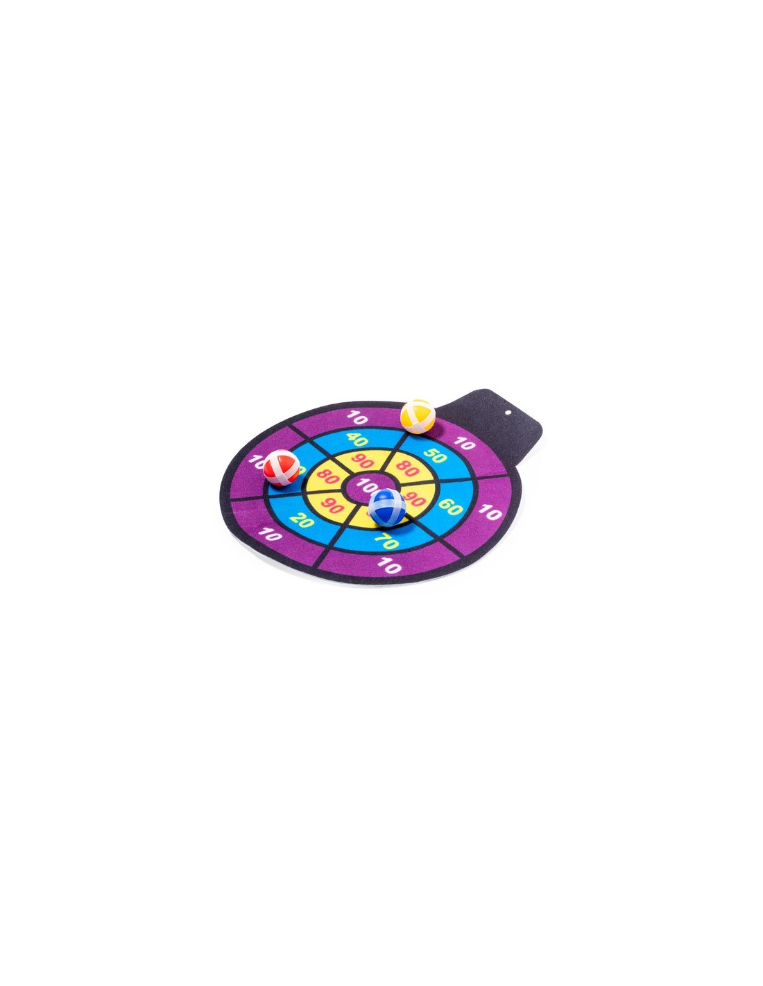 Divertida diana de tela con pelotas de velcro. Perfecta para todas las edades ofreciendo un objetivo desafiante y seguro. El juego consiste en lanzar a la diana con puntuaciónes las pelotas de distintos colores, que se quedarán fijas gracias a su envoltura de velcro. Fácil de colgar en cualquier sitio y a cualquier altura mediante agujero. Incluye diana de tela flexible y 3 pelotas con velcro. Presentado en bolsa reciclada. 3 Bolas Incluidas Composition : Poliéster.