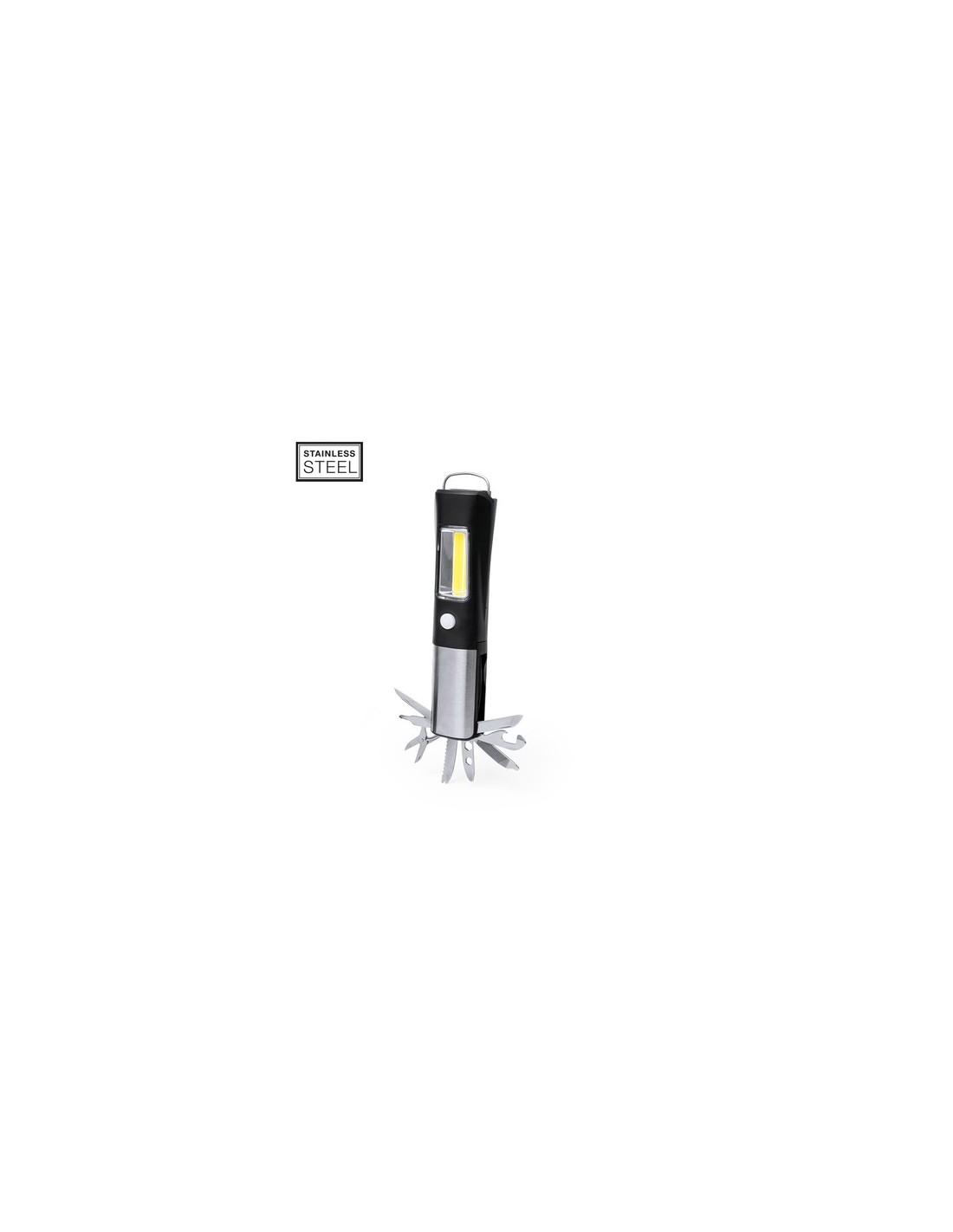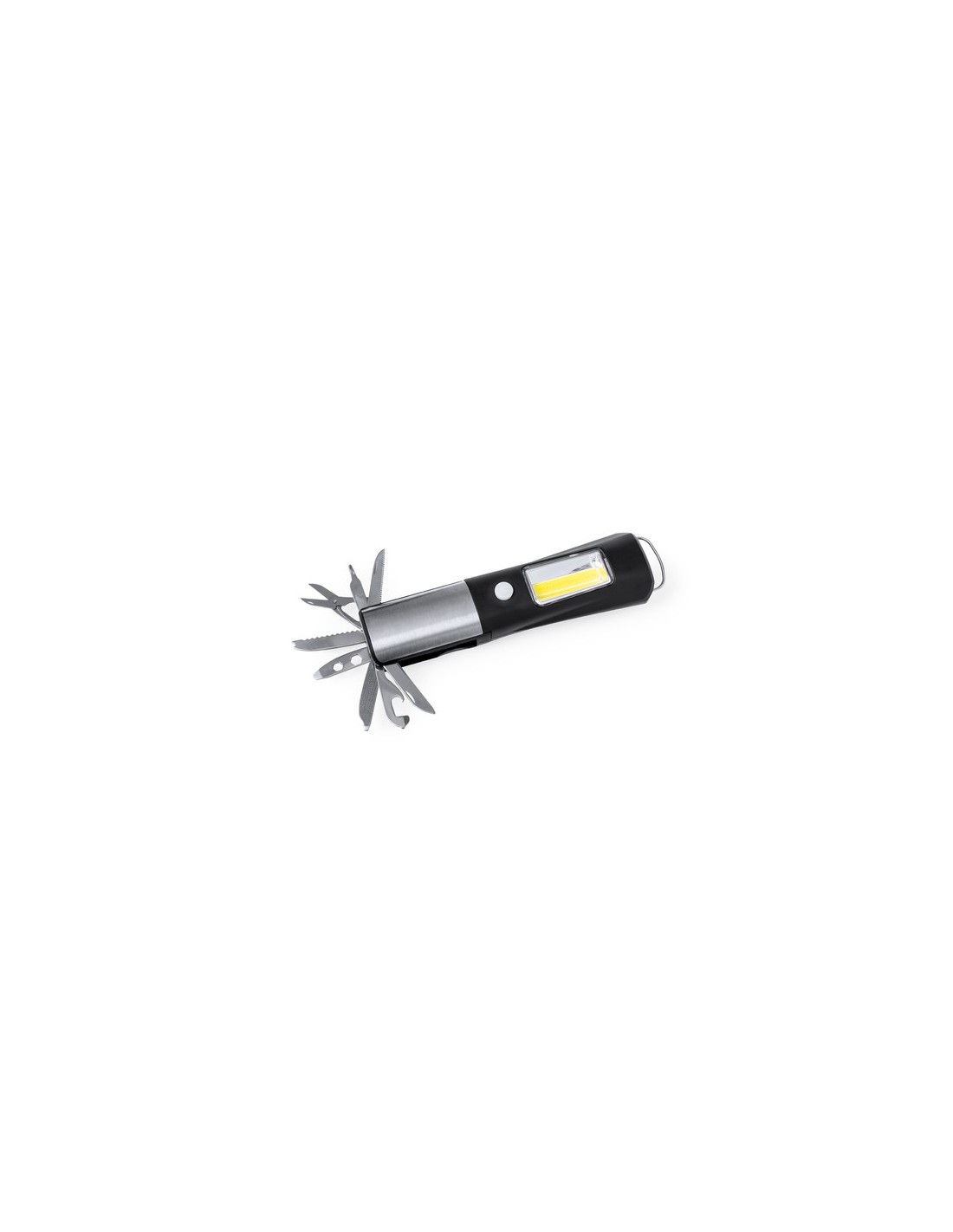 Práctica multiherramienta fabricada en resistente ABS y acero inox, con linterna frontal integrada de 1 LED. Incluye linterna lateral de 19 luces COB con dos posiciones de ilumincación (fija e intermitente). Dispone de 13 funciones, entre ellas cuchillo liso, de sierra, destornillador philips, tijeras, destornilladores planos, llave para tuercas hexagonales en varios tamaños, abrelatas, abrebotellas y una lima. Con imán de fijacion y asa. Alimentada con 3 pilas AAA, no incluidas. Presentada en caja de diseño kraft. 1 Led. 19 Luces COB. 2 Posiciones de Luz, Fija e Intermitente. 13 Funciones. Magnético. 3 Pilas AAA No Incluidas