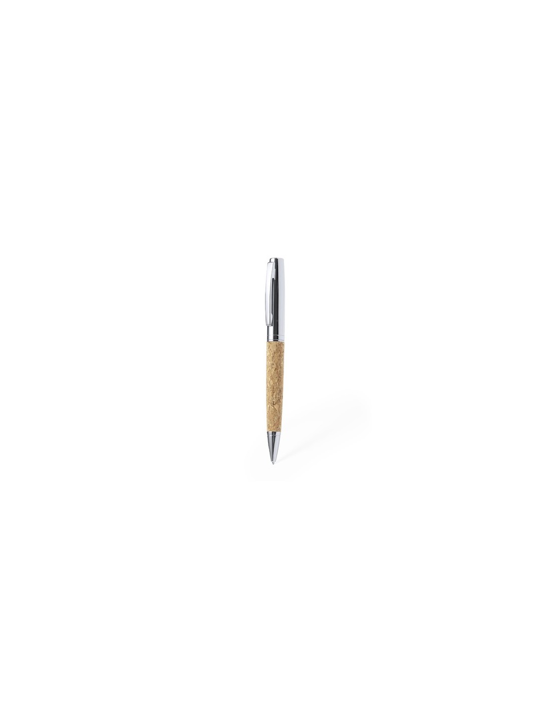 Elegante bolígrafo de corcho y metal con mecanismo giratorio. Cuerpo en resistente metal de acabado brillo y empuñadura en corcho. Clip metálico y en tinta azul. Presentado individualmente en un estuche de corcho.Elaborado con elementos vegetales para así fomentar la utilización de materias primas naturales y reducir las emisiones contaminantes. Composition : Metal/ Corcho.
