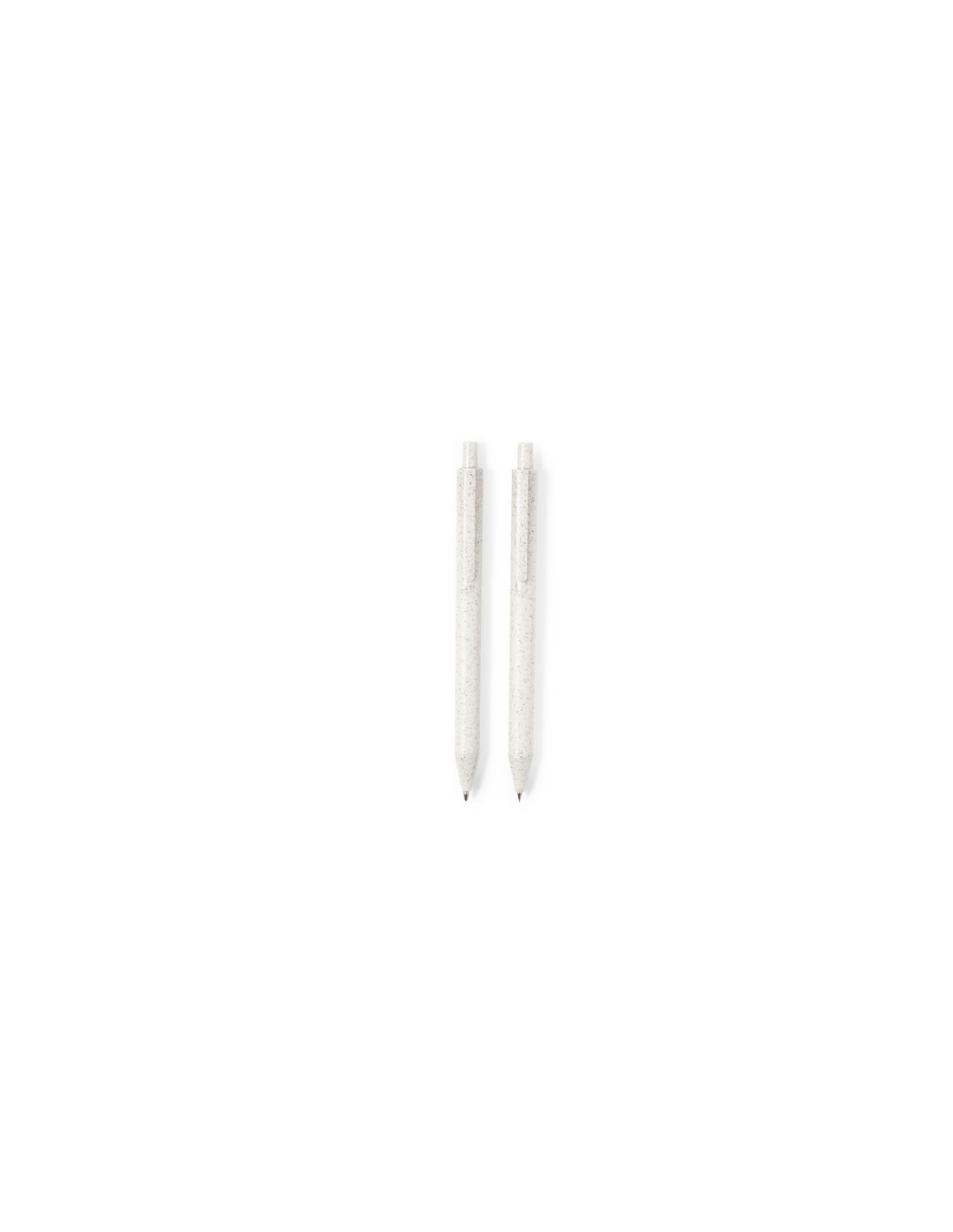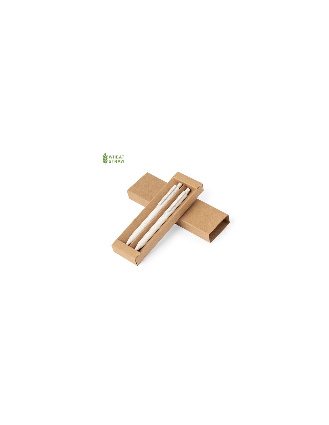 Set de bolígrafo y portaminas. Fabricados en caña de trigo con clip. Bolígrafo en tinta azul y portaminas con 2 minas incluidas de 0,7mm. Presentado en estuche individual de cartón reciclado. Logotipo Wheat Straw en la parte superior del bolígrafo y portaminas.La caña de trigo fomenta la utilización de materias primas naturales, reduciendo así las emisiones contaminantes. Bolígrafo. Portaminas: Minas 0,7 mm Incluidas Composition : Caña de Trigo/ PP.