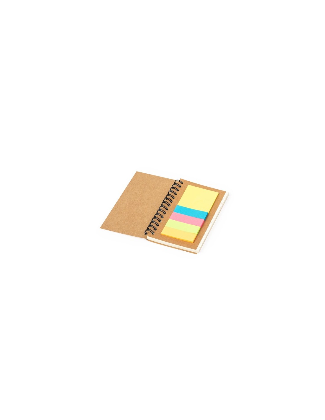 Bloc de notas con anillas y tapas blandas elaborado en cartón reciclado. Incluye 70 hojas blancas de disposición a una raya, 25 notas adhesivas de 4,5x5cm y 125 mininotas adhesivas de 1,5x5cm en variados colores. Presentado individualmente en bolsa de papel.El cartón reciclado proviene del reaprovechamiento de excedente de fabricaciones y reciclaje de papel en el final de su vida útil, convirtiéndose en un lienzo ecológico y sostenible. 70 Hojas. 25 Notas Adhesivas 4,5 x 5 cm. 125 Mininotas Adhesivas 1,5 x 5 cm Composition : Cartón Reciclado.