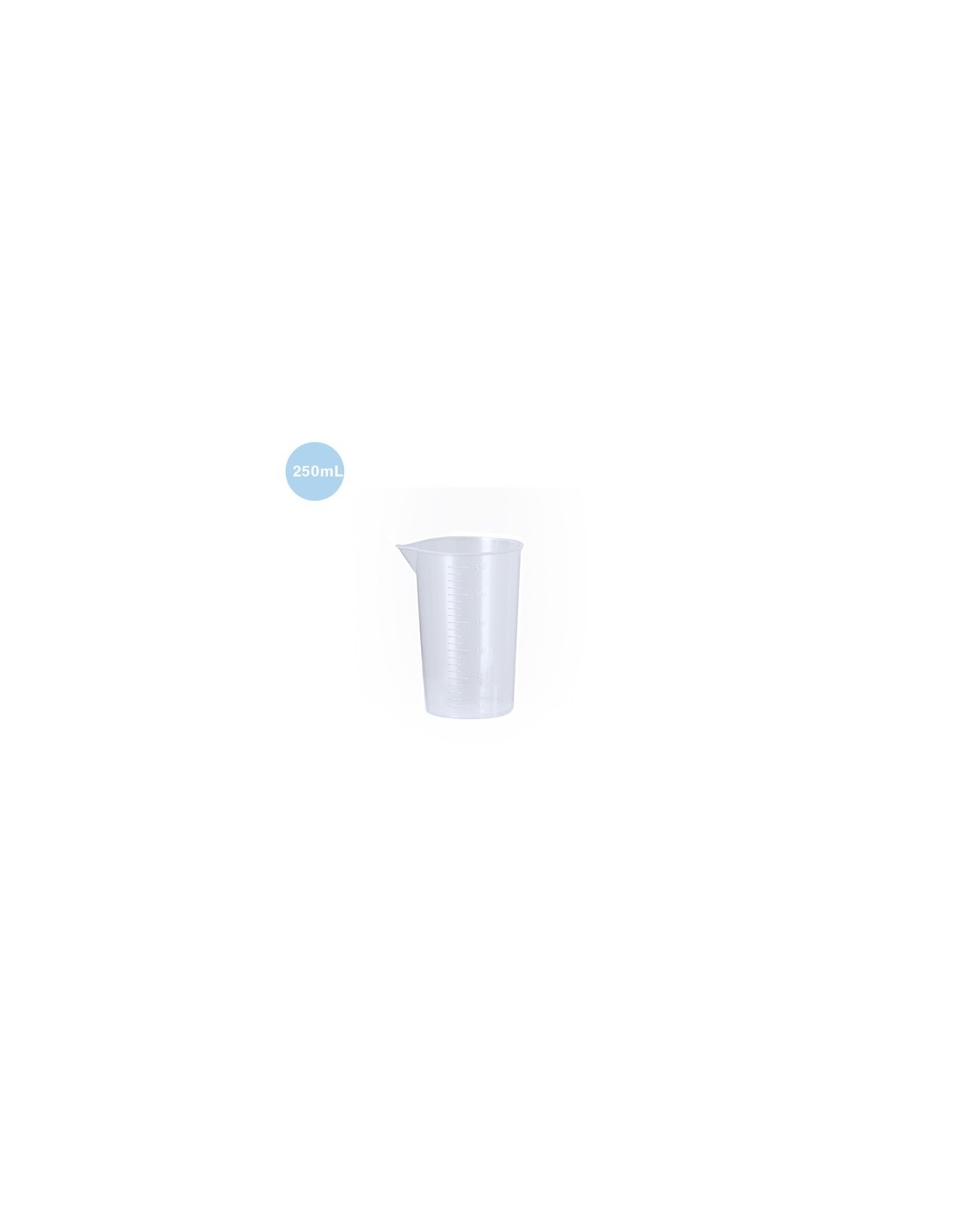 Vaso medidor de 250 ml fabricado en resistente PP transparente. Con medidor lateral en tramos de 10 ml y vertedor en el borde para evitar derrames. 250 ml Composition : PP.