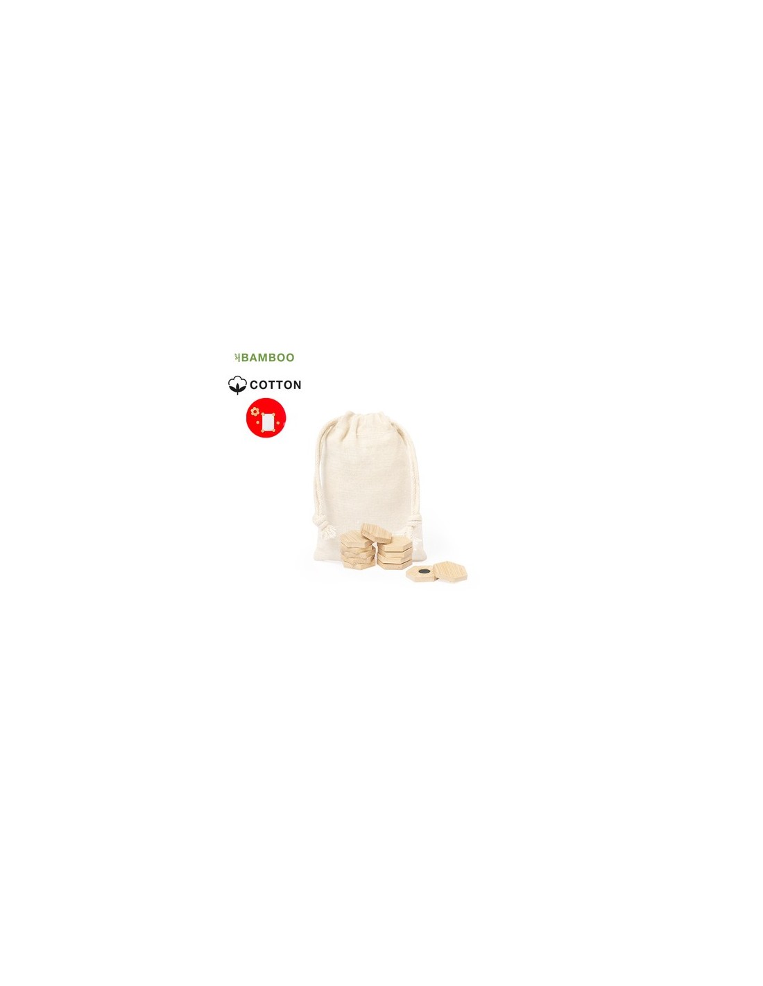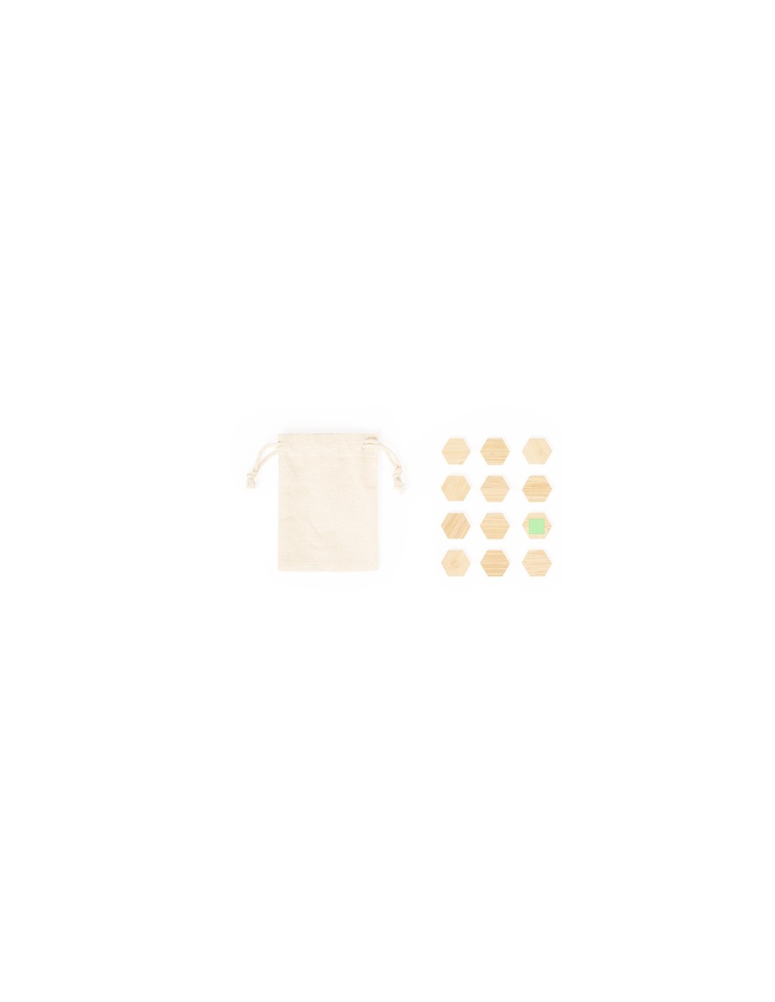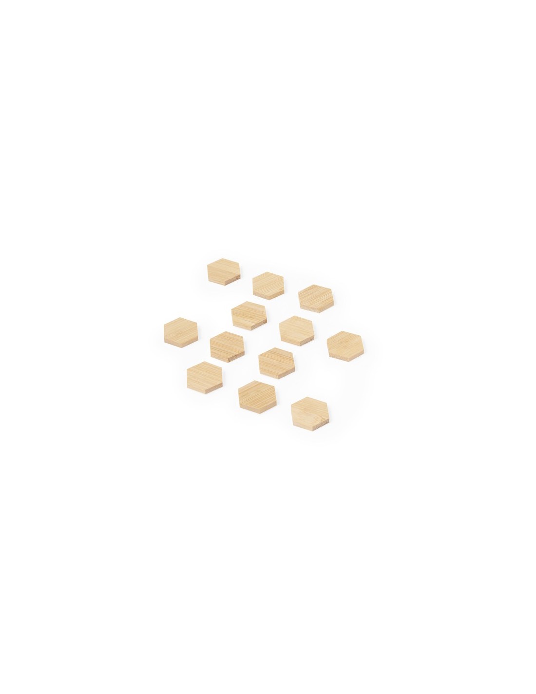Set de imanes fabricados en bambú. Incluye 12 piezas pentagonales talladas en bambú con imán para poder fijar anotaciones, fotos, etc., en cualquier superficie metálica. Presentados en bolsa de algodón. Materiales como el bambú fomentan la utilización de materias primas naturales, reduciendo las emisiones contaminantes. Proviene de una planta de gran resistencia y versatilidad, con crecimiento y regeneración rápidos, siendo una excelente alternativa al uso de madera tradicional. 12 Piezas. Funda Algodón Composition : Bambú.