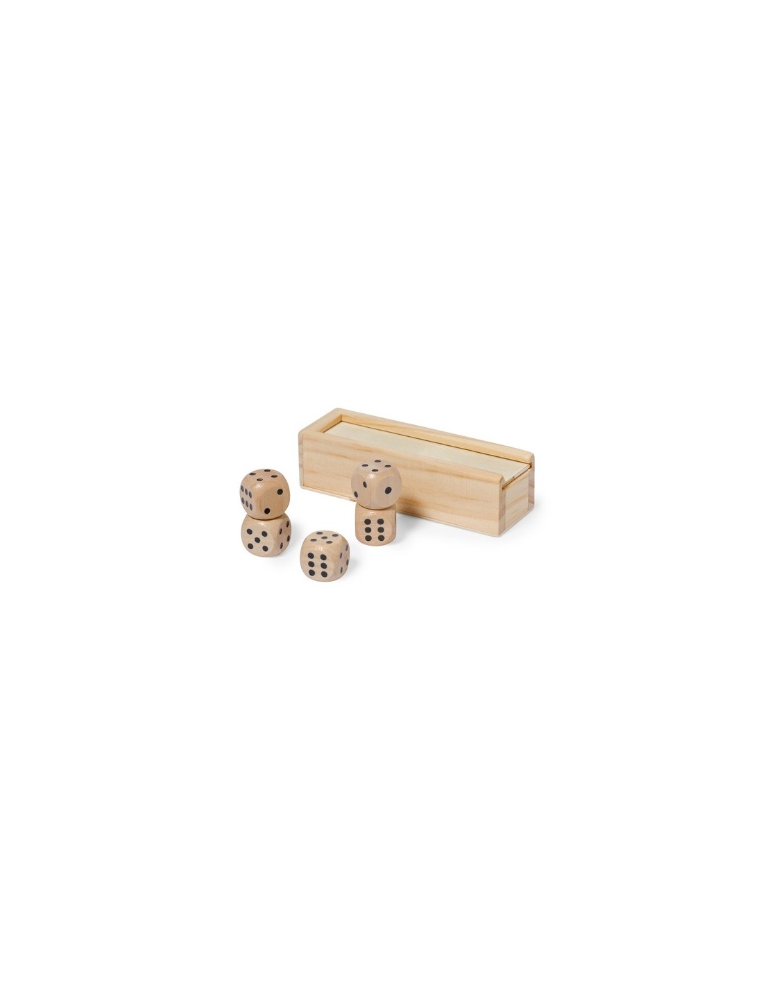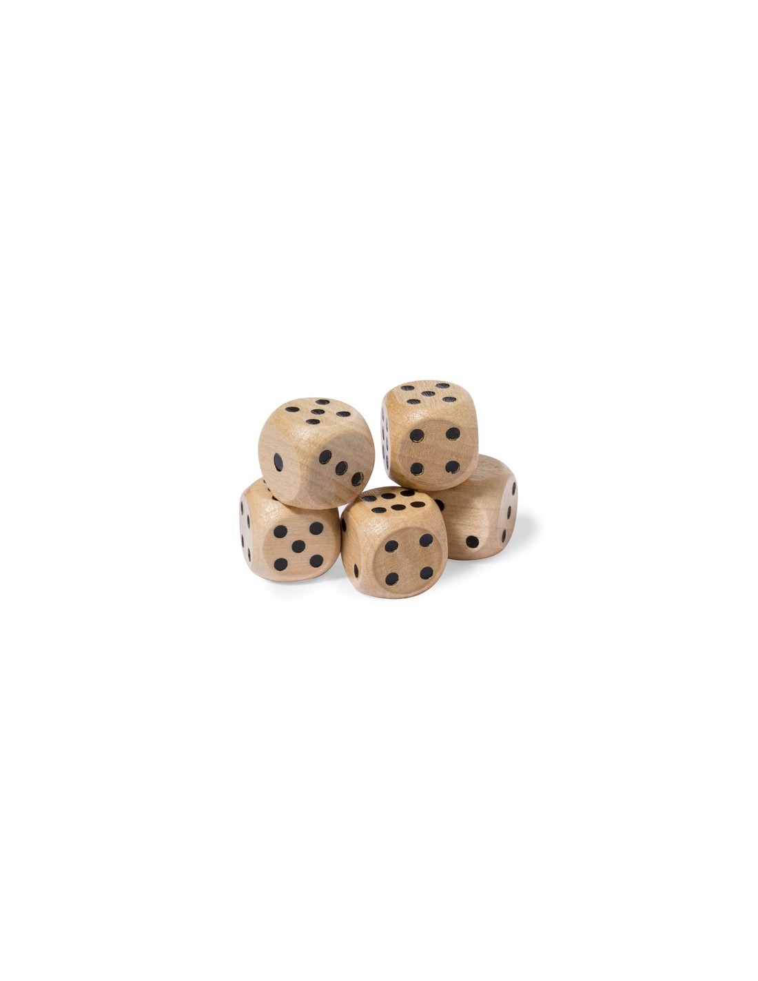 Juego de dados elaborado en madera de acabado natural. Este conjunto incluye cinco dados de seis caras, que vienen presentados en un estuche de madera con tapadera deslizante y en una bolsa individual reciclada. 5 Piezas Composition : Madera.