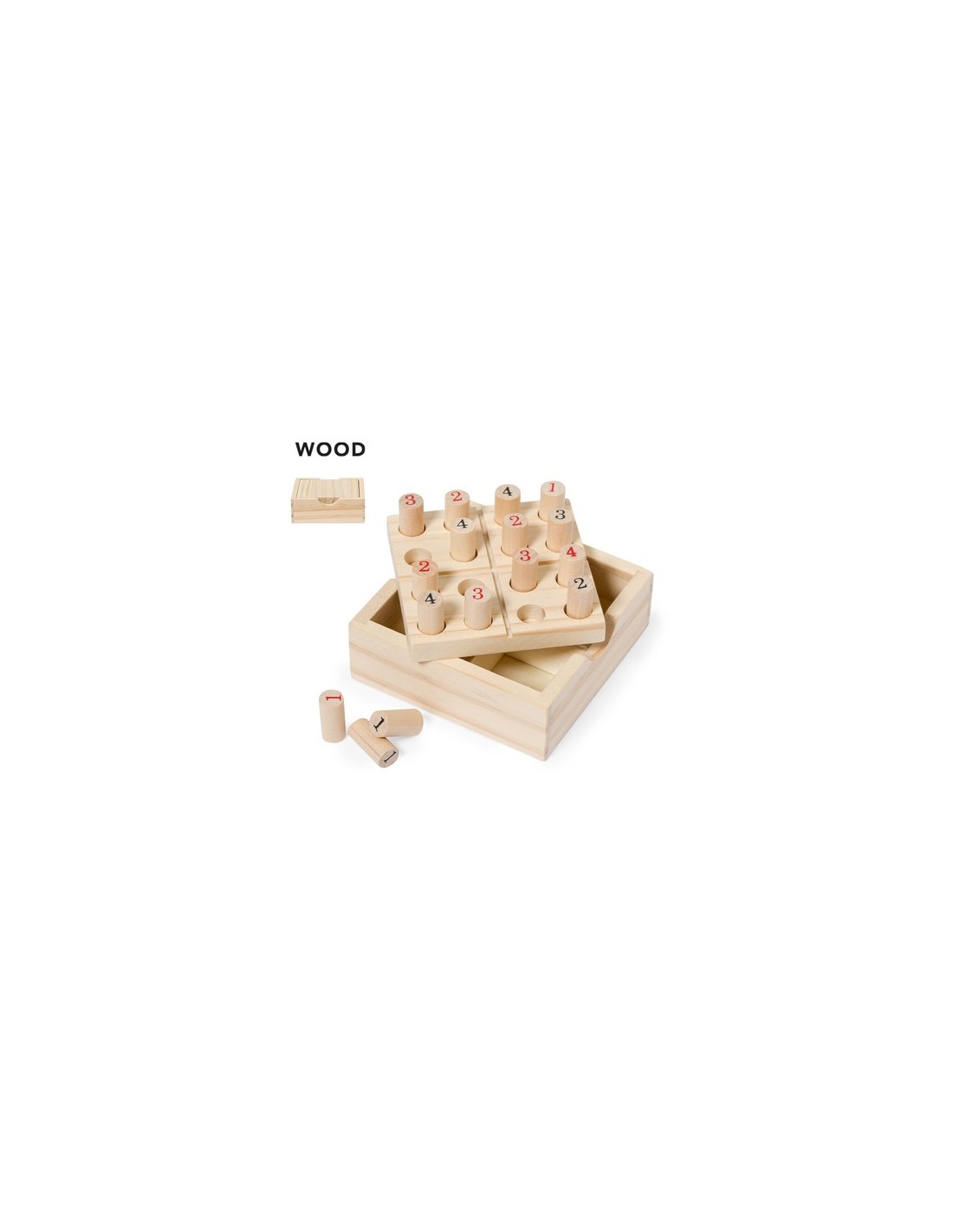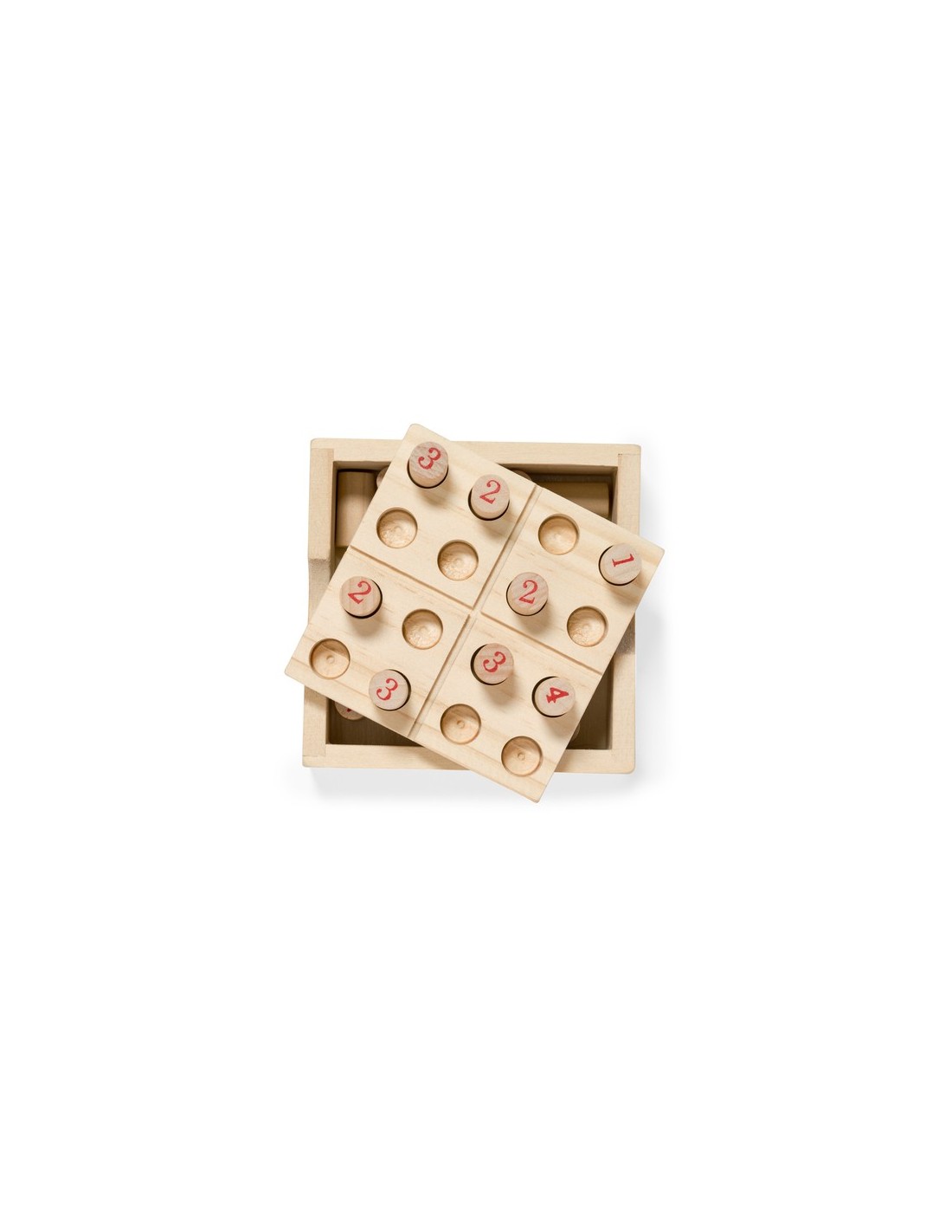 Juego de habilidad sudoku fabricado en suave madera. Incluye 16 fichas de madera numeradas, en estuche de madera con tapa-tablero. Con reglas del juego en español e inglés. Presentado individualmente en caja de diseño kraft. 16 Piezas Composition : Madera.