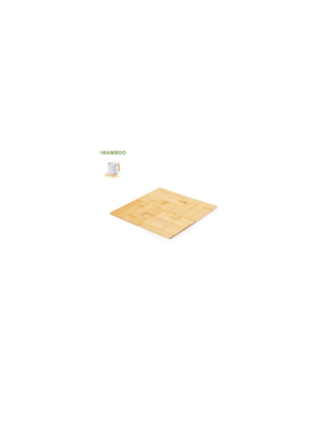 Set de posavasos fabricados en bambú. Consta de 4 piezas diseñadas en forma de puzle. Presentado individualmente en caja diseño kraft. Materiales como el bambú fomentan la utilización de materias primas naturales, reduciendo las emisiones contaminantes. Proviene de una planta de gran resistencia y versatilidad, con crecimiento y regeneración rápidos, siendo una excelente alternativa al uso de madera tradicional. 4 Piezas Composition : Bambú.