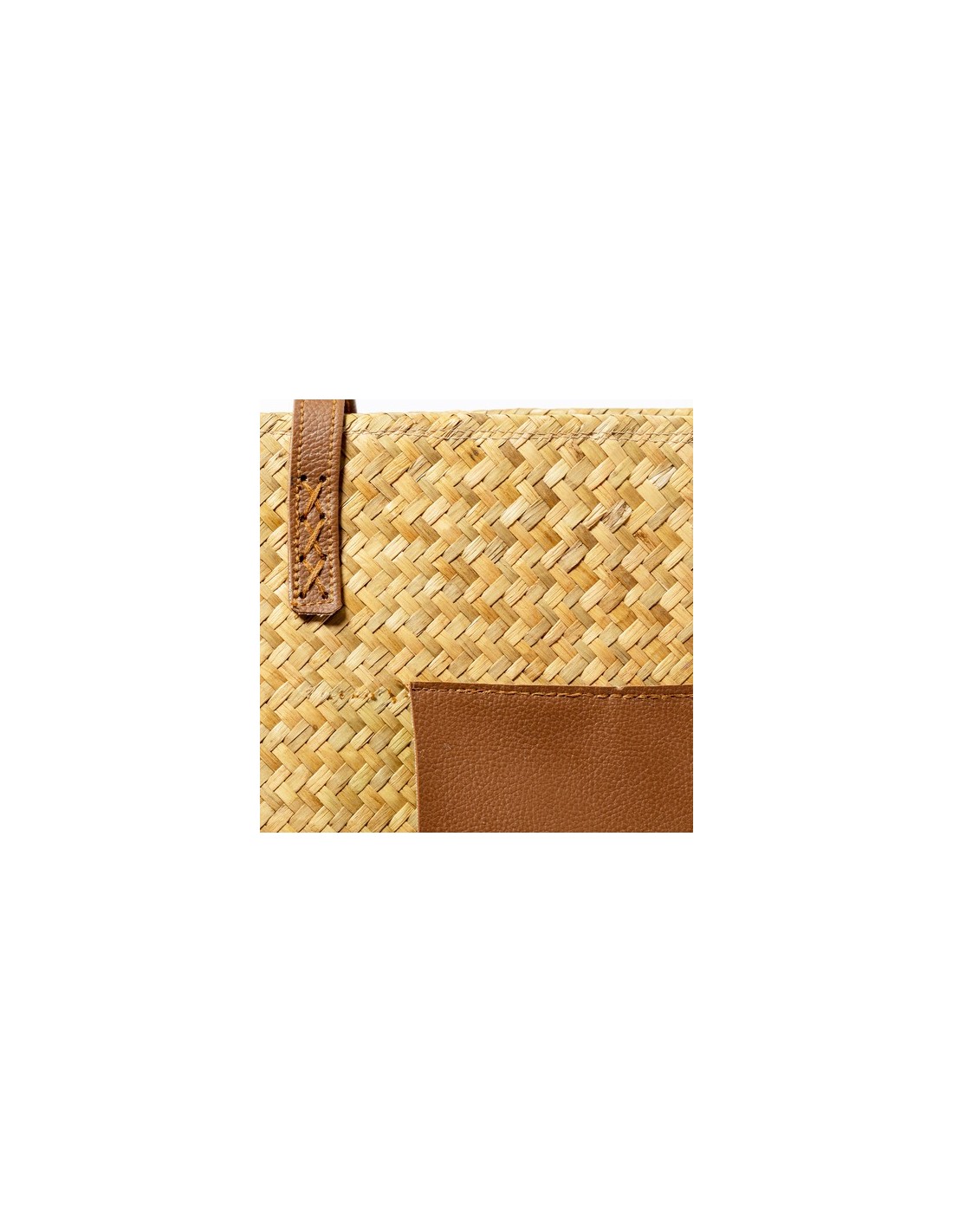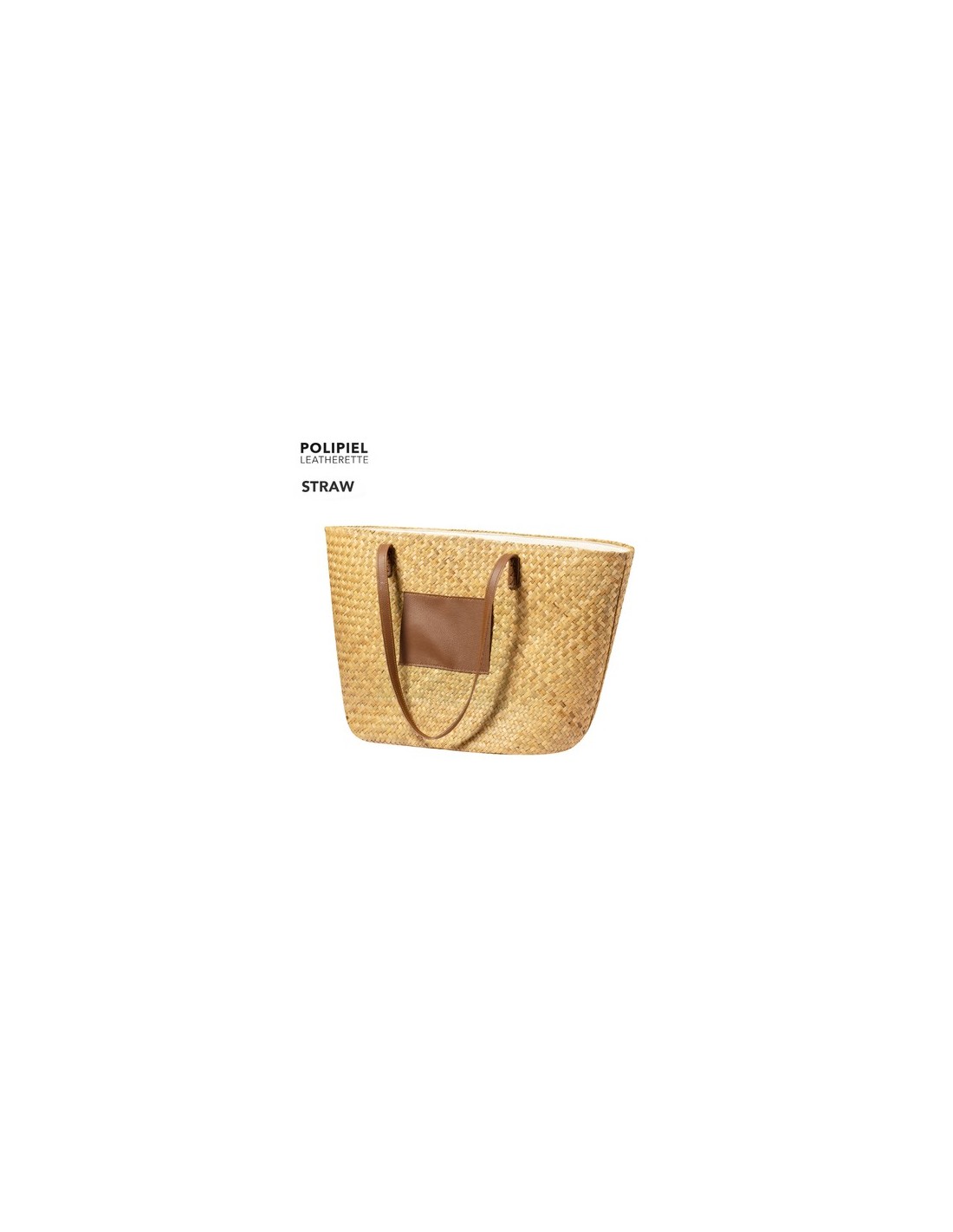 Bolsa de paja en forma rectangular y de desenfadado diseño.Gran capacidad y con originales asas largas en polipiel. Con amplio parche exterior en polipiel, especialmente diseñado para personalización en láser y a juego con las asas. Composition : Paja/ Polipiel.