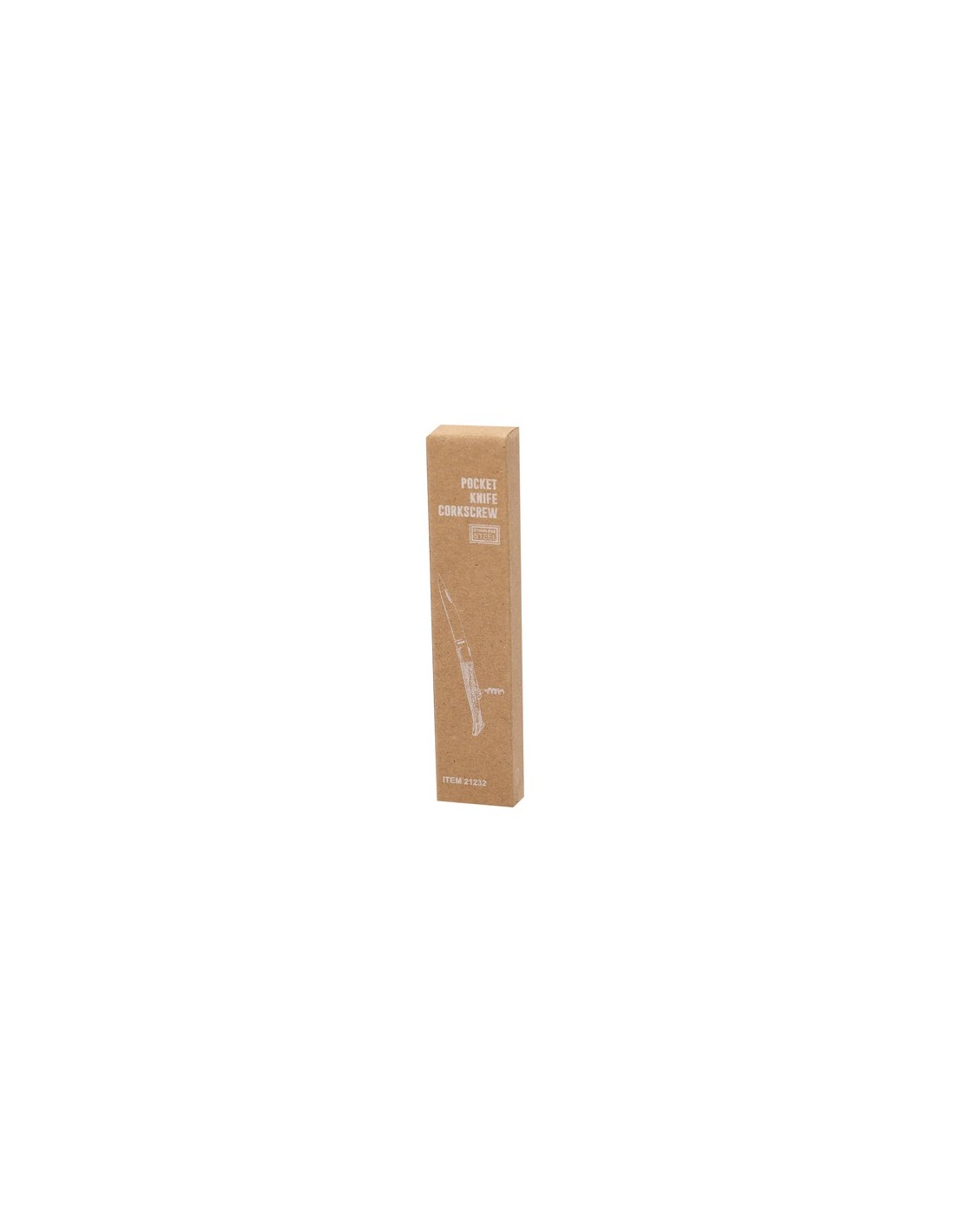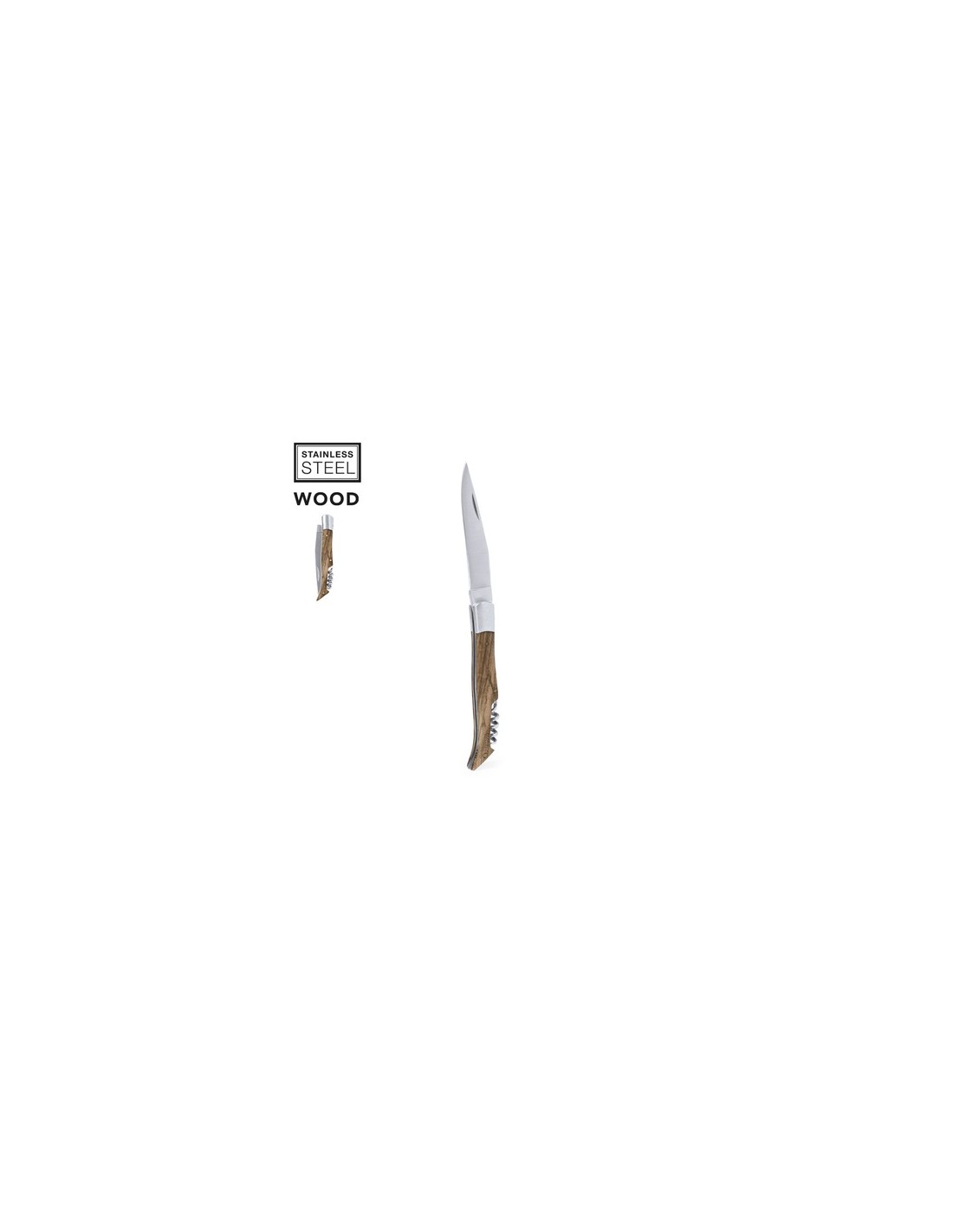 Navaja fabricada en resistente acero inox, con mango ergonómico fabricado en madera natural lacada y sacacorchos integrado. La aleación de la hoja garantiza resistencia a la corrosión y abrasión, siendo ideal para el uso frecuente con materiales duros. La hoja es de tipo punta de aguja, que se caracteriza por su forma puntiaguda, con la parte superior recta. Presentada individualmente en caja de diseño kraft. Composition : Madera/ Acero Inox.
