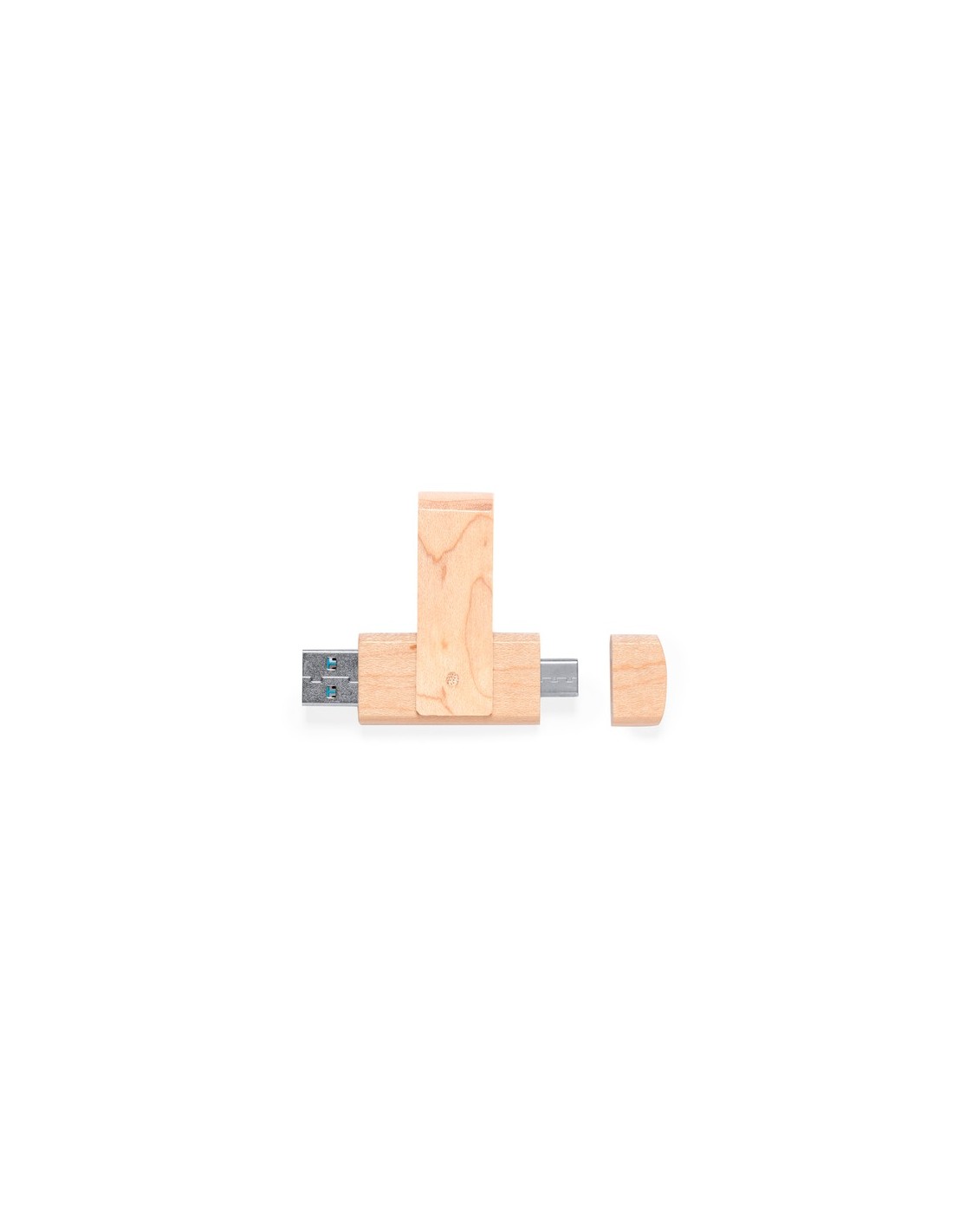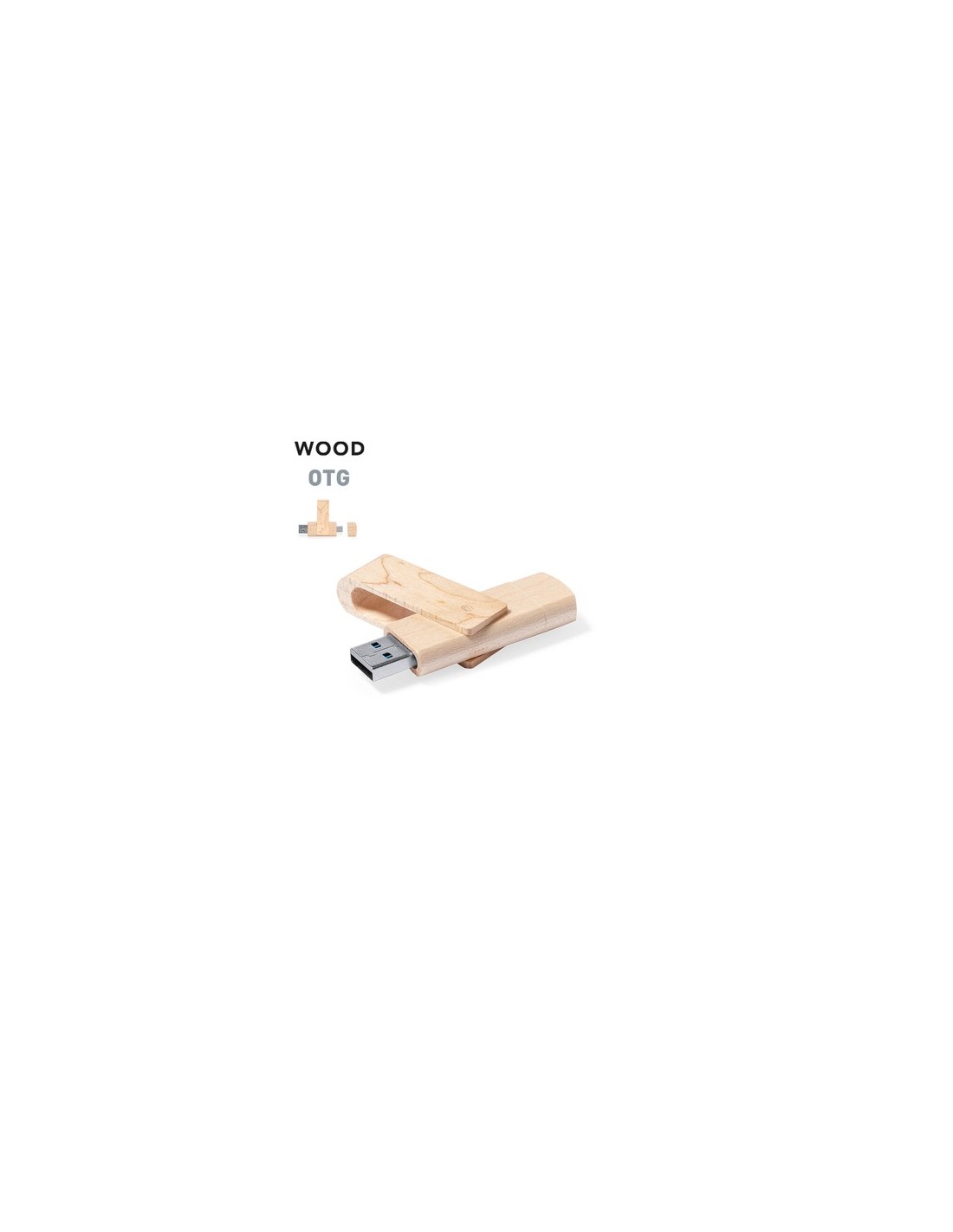 Memoria USB OTG de 16GB de capacidad, con clip giratorio y cuerpo acabado en suave madera. Con conexión USB y Tipo C. Presentada en estuche individual de cartón reciclado. Conexión Tipo C Composition : Madera.