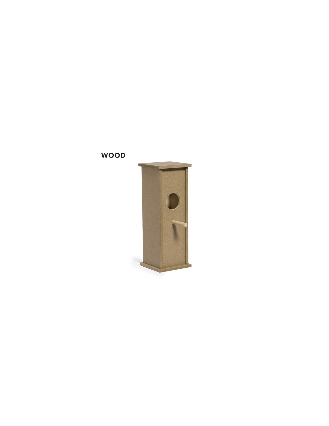 Caseta colgante para pájaros fabricada en resistente madera. Un acogedor refugio para aves muy fácil de montar, con amplio orificio de entrada para un cómodo acceso. Presentada en caja individual kraft. Composition : Madera.