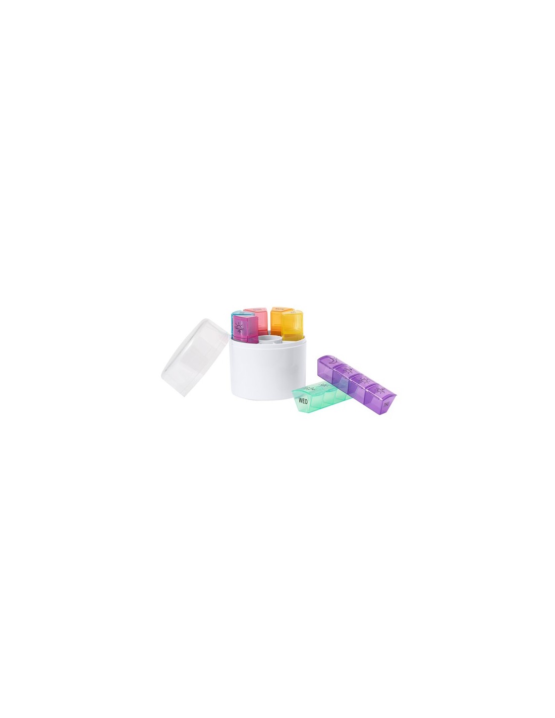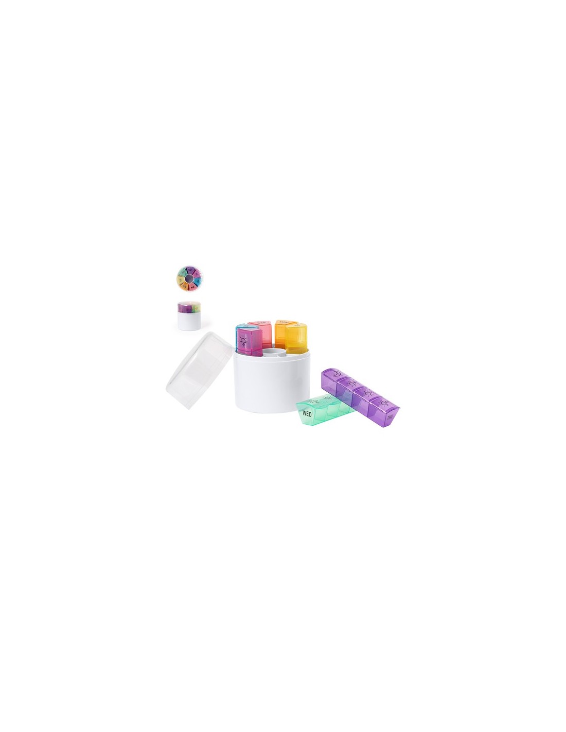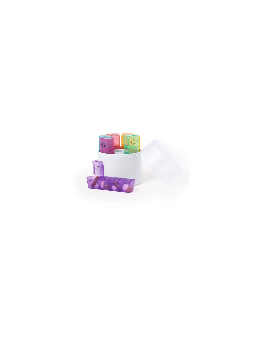 Compacto pastillero semanal. Estuche en forma de cilindro con 7 compartimentos diferenciados por colores y siglas para identificar rápidamente el día de la semana. Cada compartimento está dividido en 4 casillas independientes correspondientes a cada parte del día. Presentado individualmente en bolsa reciclada. 28 Compartimentos
