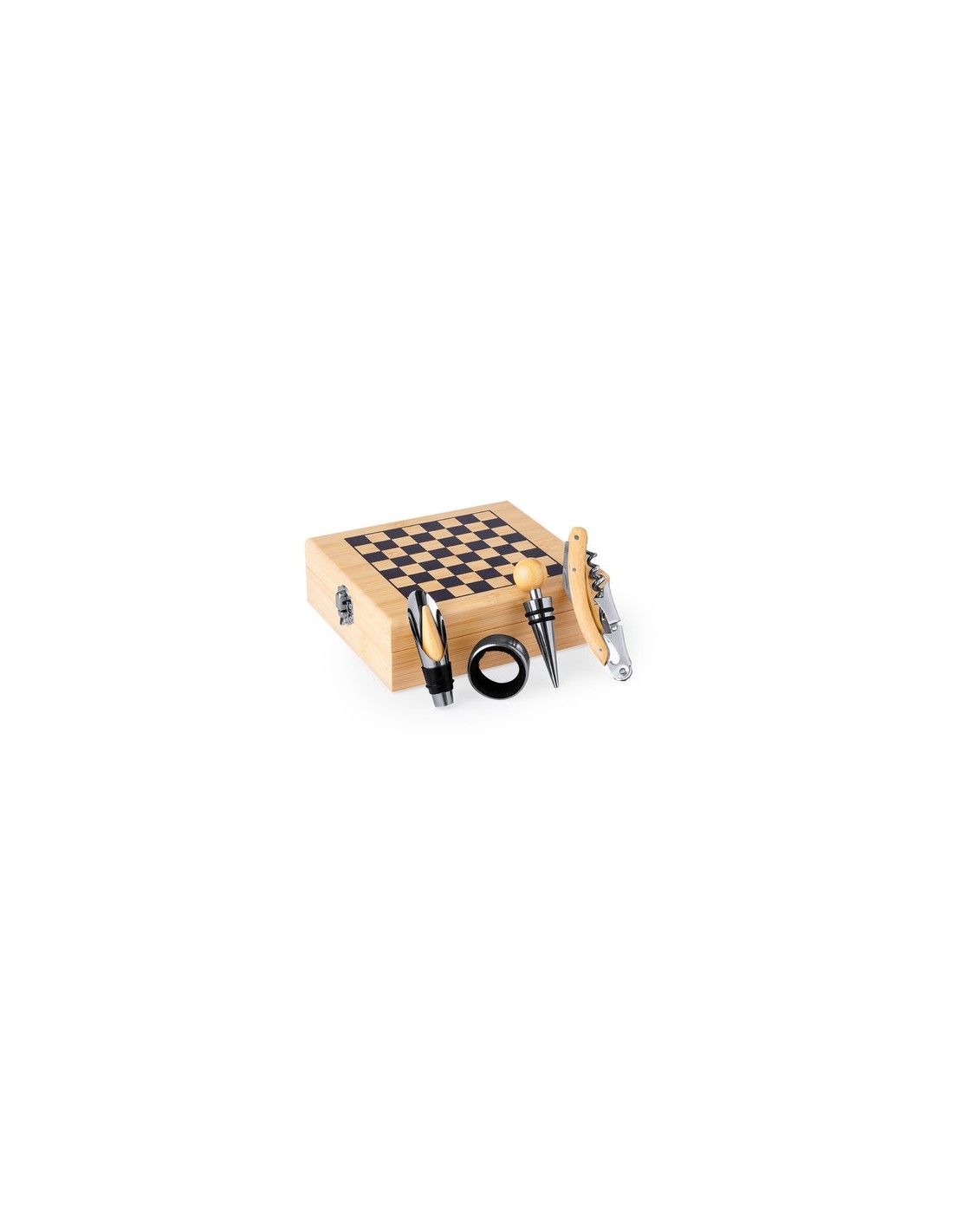 Original set de vinos ajedrez -piezas incluidas- acabado en bambú natural. Con cierre de seguridad y accesorios de acero inox y bambú. Incluye sacacorchos con cortacápsulas y abridor; tapón, decantador y recogegotas. Presentado en estuche individual con interior en suave espuma troquelada.Materiales como el bambú fomentan la utilización de materias primas naturales, reduciendo las emisiones contaminantes. Proviene de una planta de gran resistencia y versatilidad, con crecimiento y regeneración rápidos, siendo una excelente alternativa al uso de madera tradicional. 4 Accesorios Composition : Bambú.