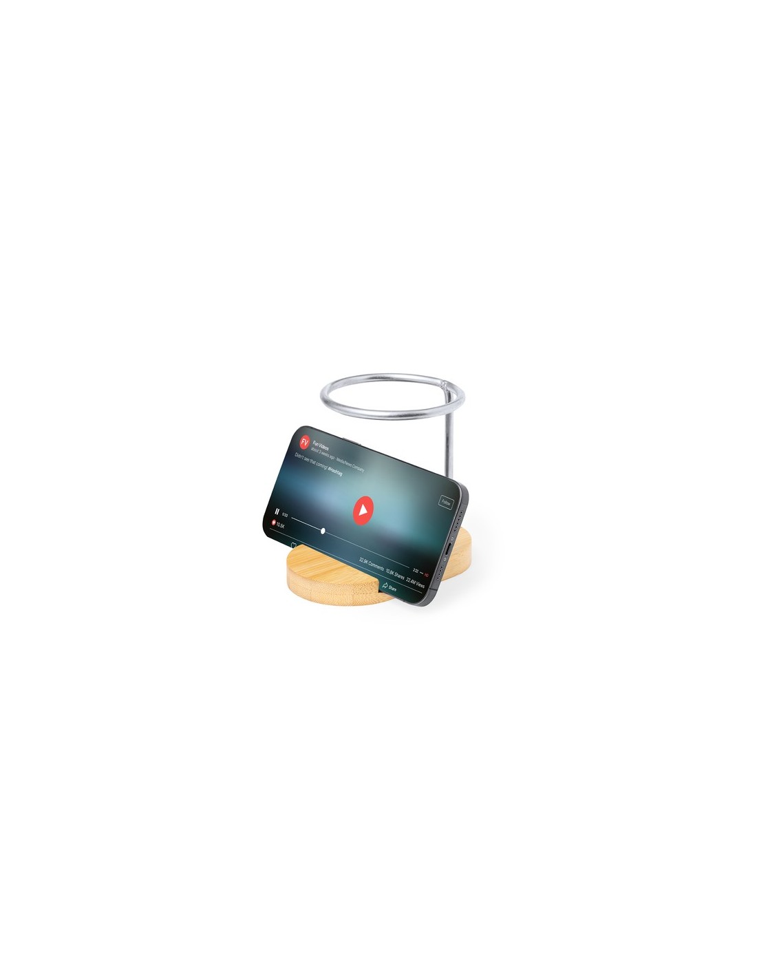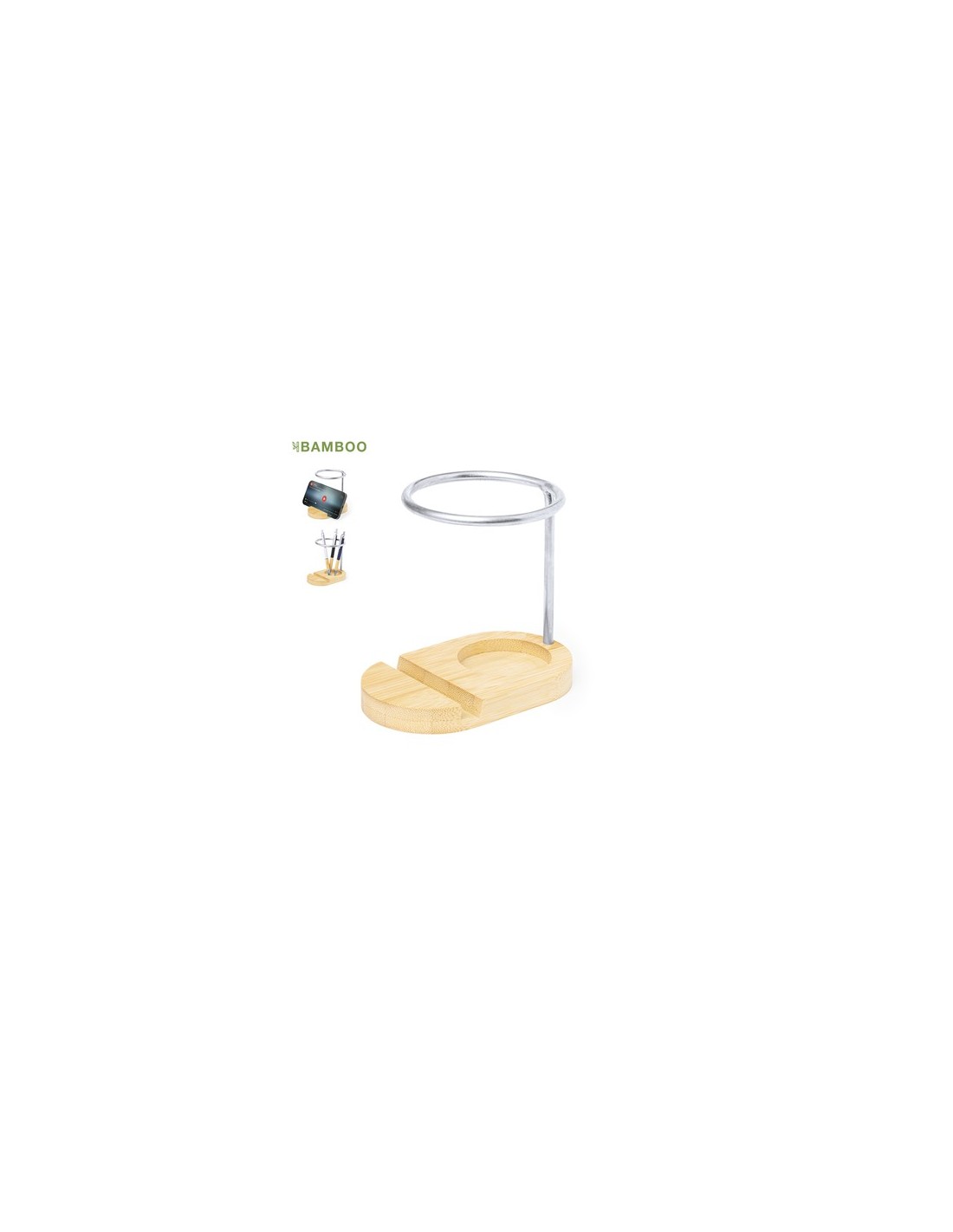 Lapicero con soporte fabricado en bambú y acero inox. De diseño minimalista, con base fabricada en bambú y estructura metálica. Presentado en una caja de diseño kraft. Materiales como el bambú fomentan la utilización de materias primas naturales, reduciendo las emisiones contaminantes. Proviene de una planta de gran resistencia y versatilidad, con crecimiento y regeneración rápidos, siendo una excelente alternativa al uso de madera tradicional. Composition : Bambú/ Metal.