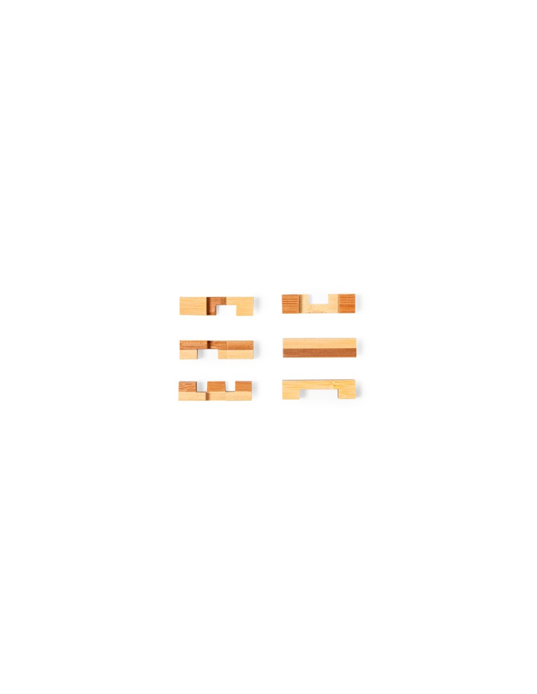 Juego de habilidad de 6 piezas fabricado en suave bambú. Un divertido rompecabezas perfecto para el entretenimiento: hay que ensamblar las piezas en una combinación única que nos mostrará la figura buscada. Presentado individualmente en una caja de diseño kraft.Materiales como el bambú fomentan la utilización de materias primas naturales, reduciendo las emisiones contaminantes. Proviene de una planta de gran resistencia y versatilidad, con crecimiento y regeneración rápidos, siendo una excelente alternativa al uso de madera tradicional. 6 Piezas Composition : Bambú.