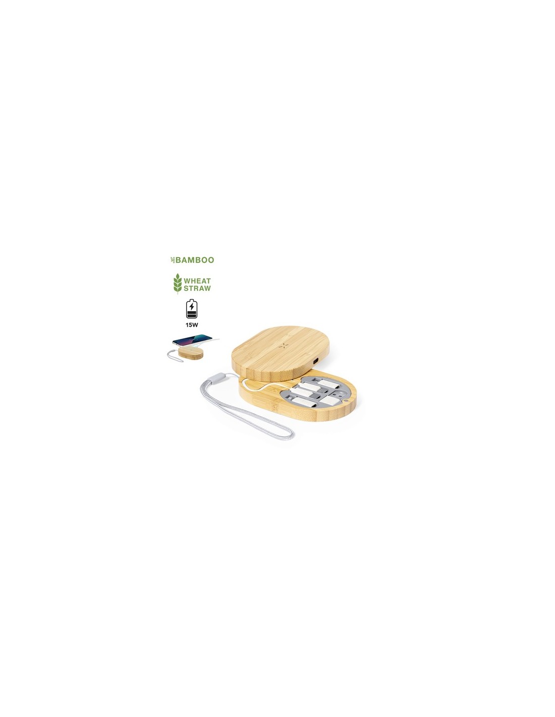 Completo conjunto de cargador inalámbrico 15W y cables cargadores. Fabricado en bambú pulido, en un original diseño de estuche con cargador inalámbrico integrado en la tapa y una base troquelada, que incluye un completo set de cables y adaptadores. Cargador compatible con dispositivos equipados con tecnología Qi. Set cables de carga con capacidad de transferencia de datos y múltiples conexiones: Micro USB, Tipo C y Lightning. 5V DC 3A. Presentado en caja diseño kraft.Materiales como el bambú fomentan la utilización de materias primas naturales, reduciendo las emisiones contaminantes. Proviene de una planta de gran resistencia y versatilidad, con crecimiento y regeneración rápidos, siendo una excelente alternativa al uso de madera tradicional.Fabricado conforme a los estándares RoHS y en cumplimiento con los siguientes requisitos de seguridad:Sistema de protección contra sobrecalentamiento.Sistema de protección contra sobrecarga.Sistema de bloqueo para evitar cortocircuitos. Inalámbrico 15W. Set Cables Cargadores Incluido. Apto para transferir datos. Conexión Micro USB, Tipo C y Lightning 5V DC 3A Composition : Bambú.
