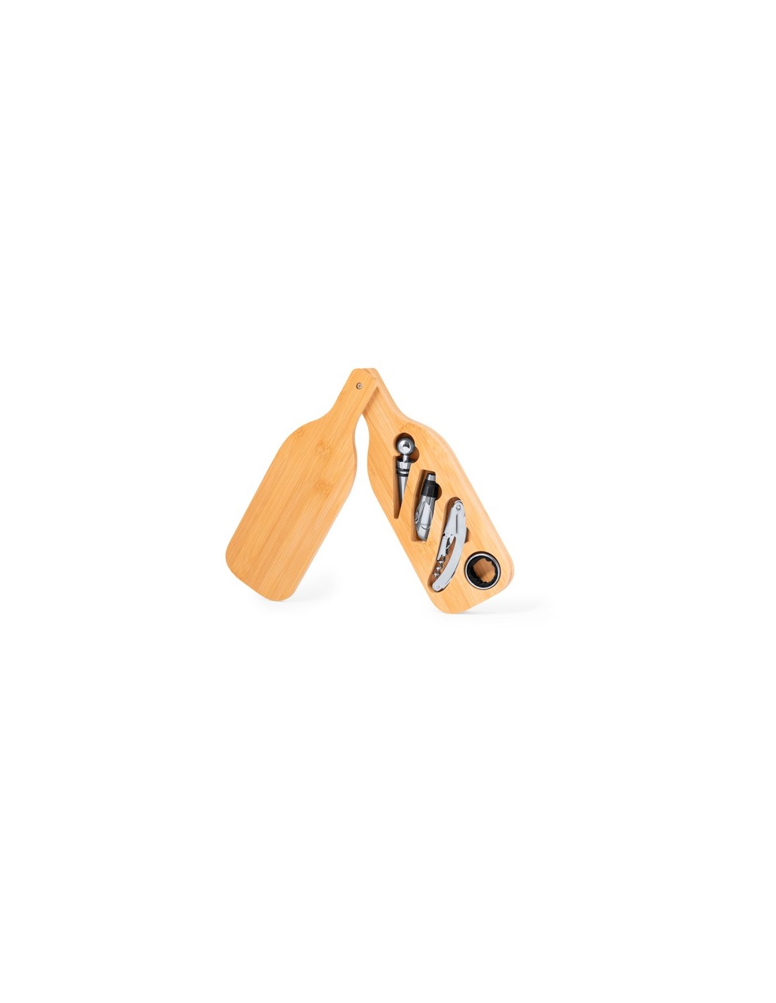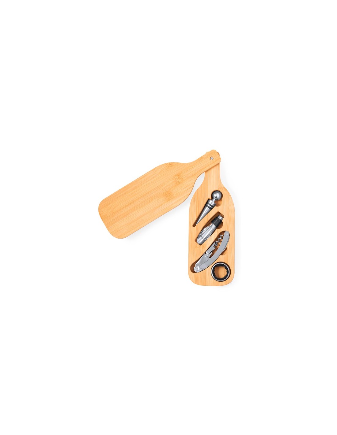 Set de vinos presentado en un diseño inspirado en botella de vino y tallado en bambú, con accesorios en acero inox. Incluye sacacorchos de 2 tiempos con cortacápsulas y abridor; tapón, dosificador y recogegotas. Presentado en estuche individual de bambú con interior troquelado. 4 Accesorios Composition : Bambú.