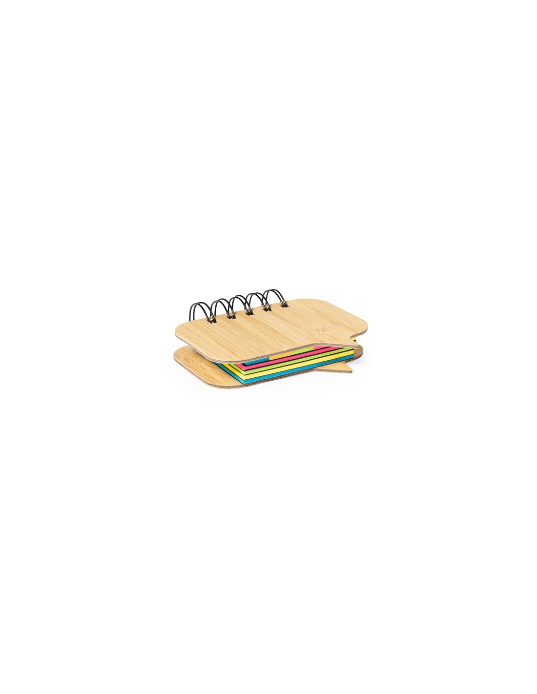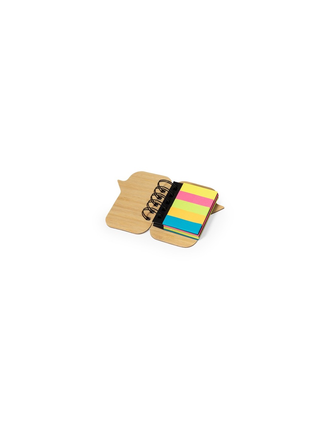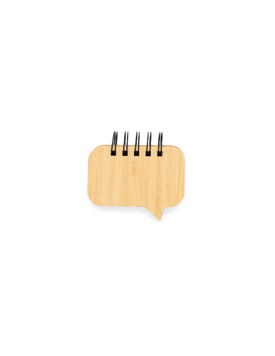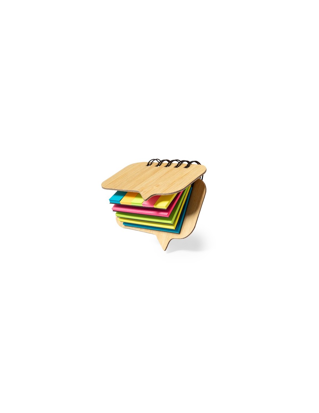 Bloc de notas con anillas y de tapas rígidas elaboradas con bambú en forma de globo speech. Interior con 25 notas adhesivas de 5x7,5cm y 125 mininotas adhesivas de 1,5x5cm en variados colores. Presentado en bolsa individual reciclada.Materiales como el bambú fomentan la utilización de materias primas naturales, reduciendo las emisiones contaminantes. Proviene de una planta de gran resistencia y versatilidad, con crecimiento y regeneración rápidos, siendo una excelente alternativa al uso de madera tradicional. 100 Notas Adhesivas 5 x 7,5 cm. 125 Mininotas Adhesivas 1,5 x 5 cm Composition : Bambú.