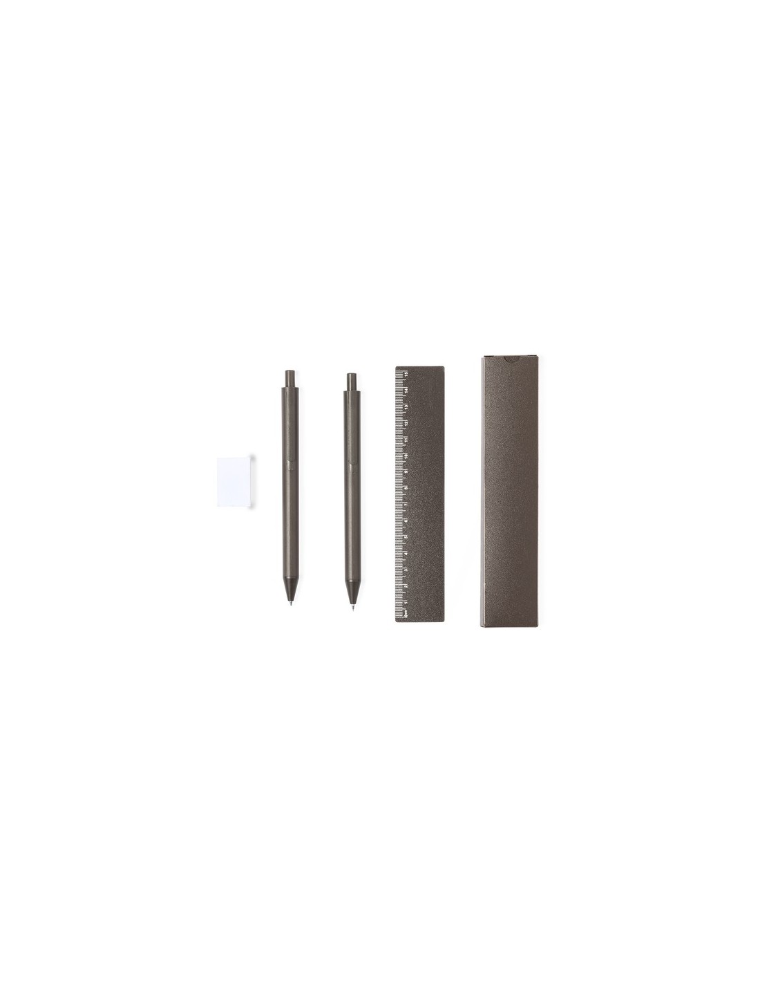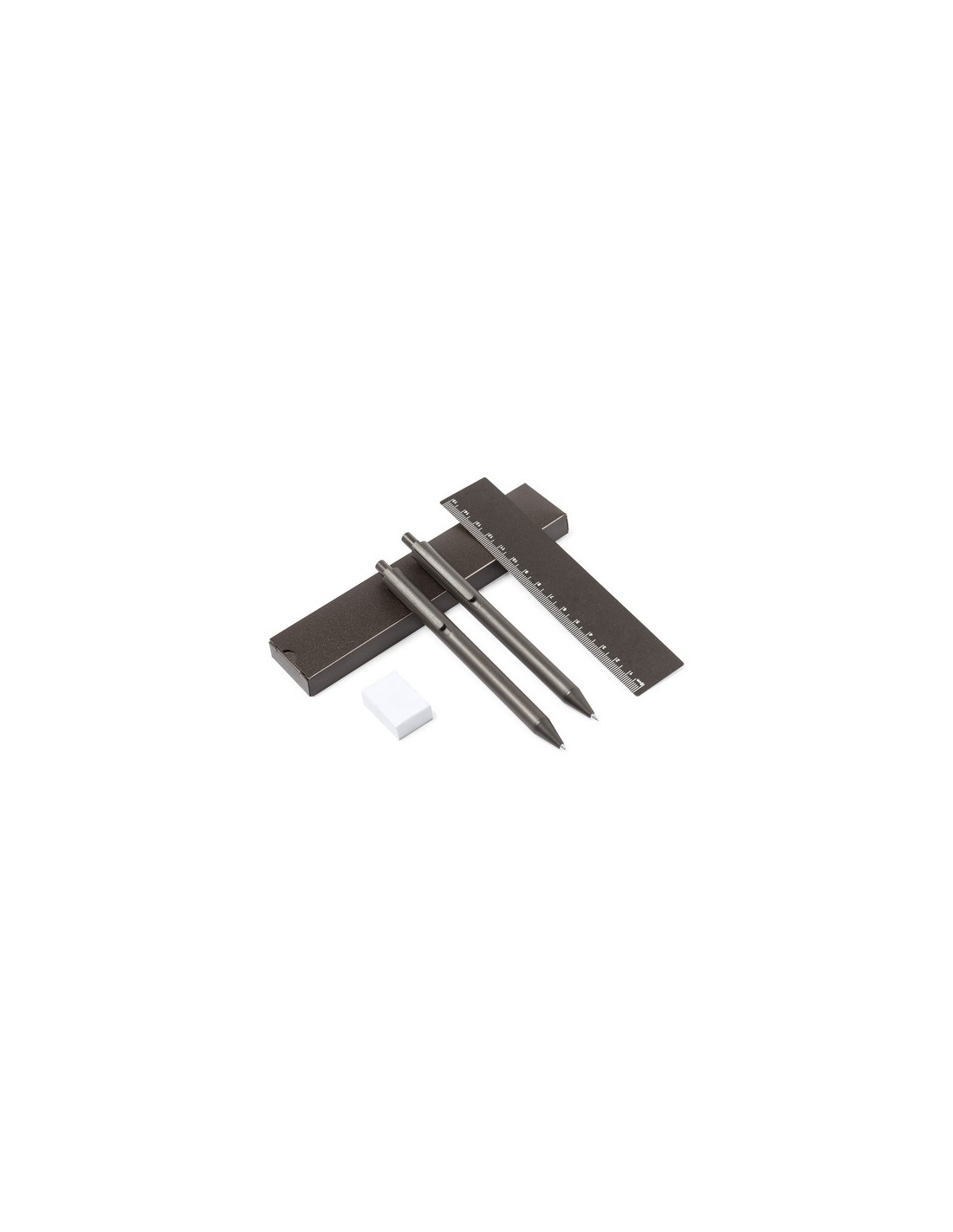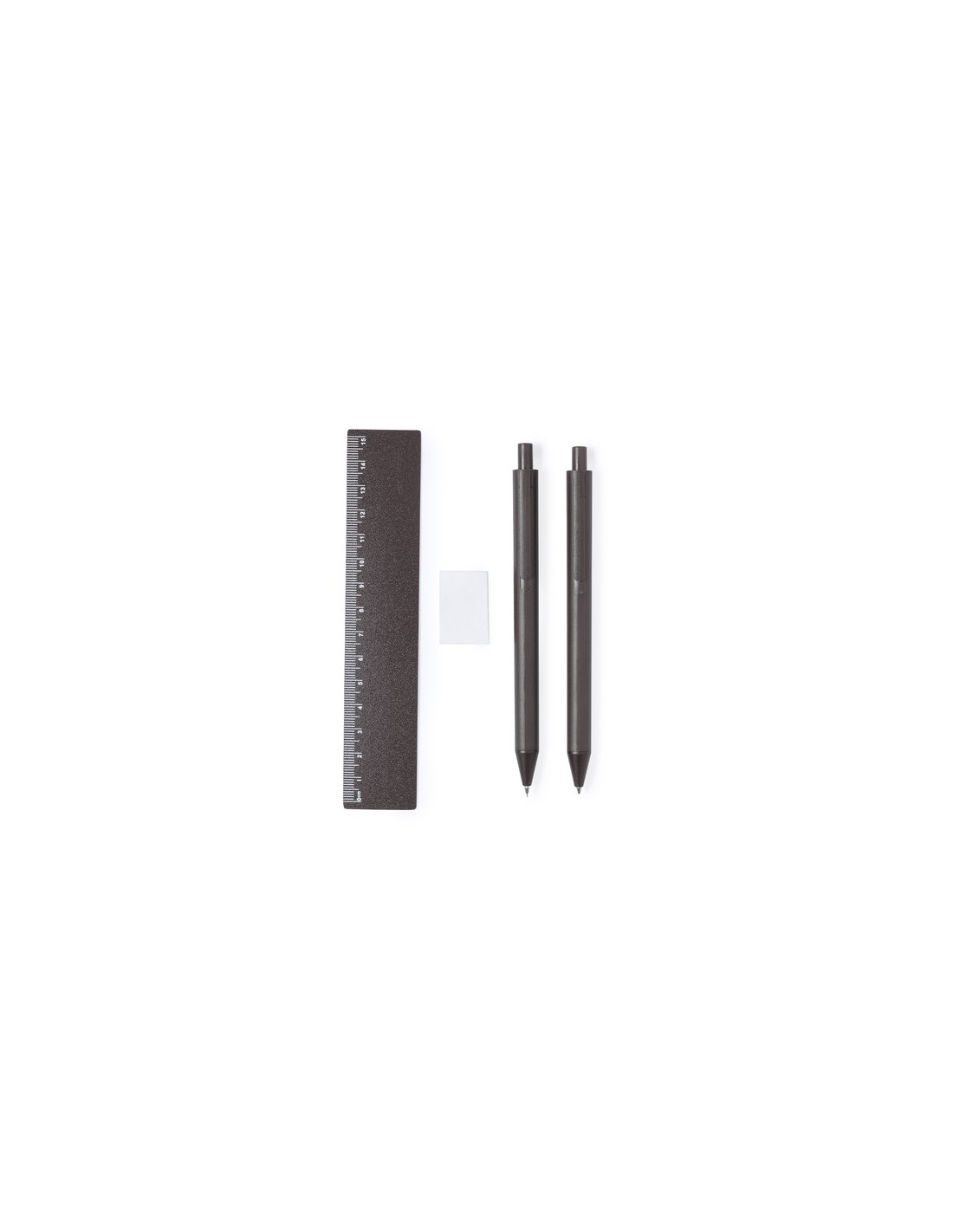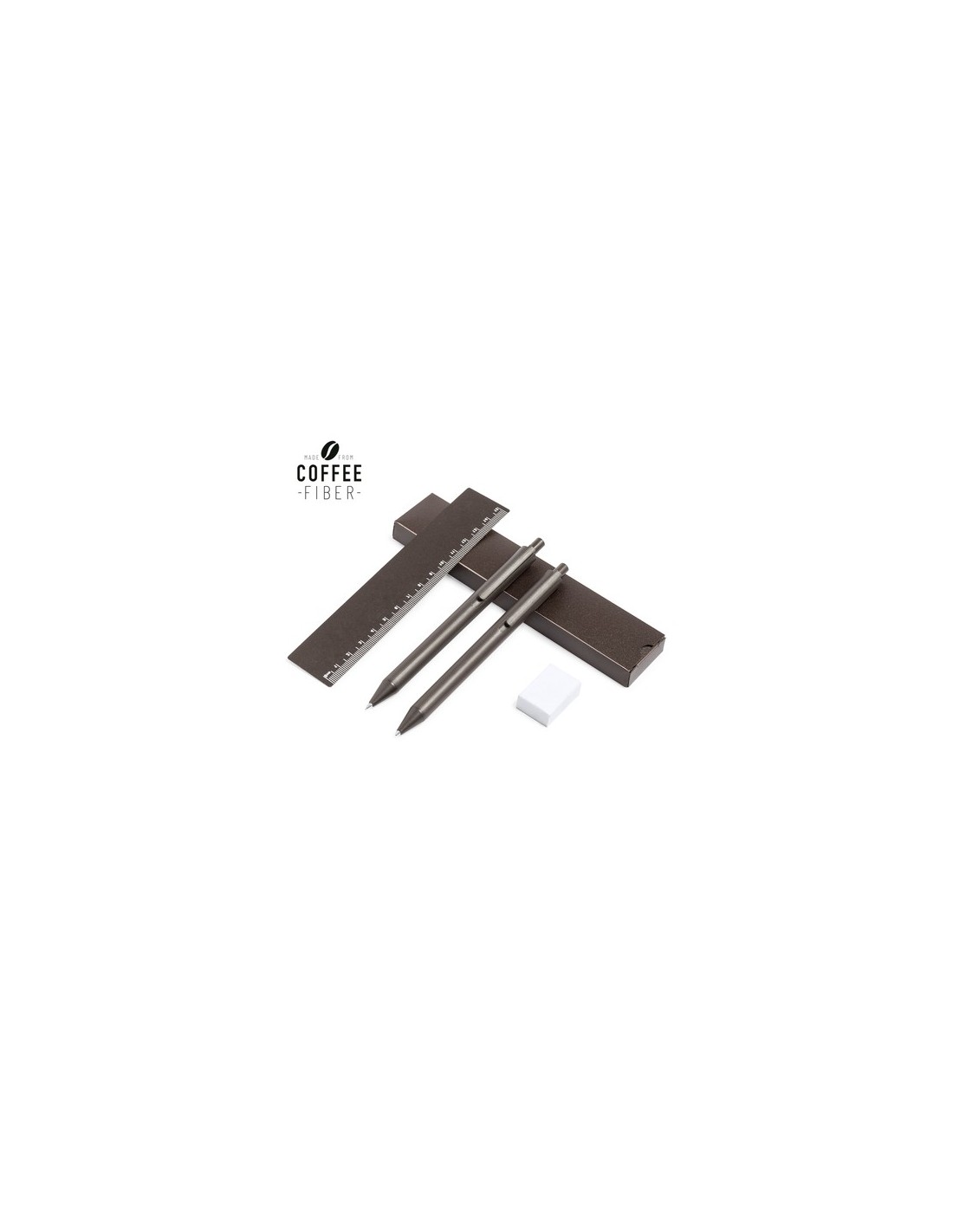 Set de bolígrafo, portaminas y regla, fabricados en fibra de café. Bolígrafo en tinta azul y portaminas con 2 minas incluidas de 0,7mm, ambos con clip. Incluye una práctica regla de 15 cm y útil goma. Presentado en estuche individual de fibra de café. Logotipo fibra de café en la parte superior del bolígrafo y portaminas.La fibra de café es una solución circular que se obtiene de la utilización de los residuos producidos en la obtención del café. Una alternativa sostenible que favorece la reducción del uso de plásticos, ahorrando energía en su proceso de fabricación y contribuyendo al cuidado del medio ambiente. 4 Piezas Composition : Fibra de Café/ PP.