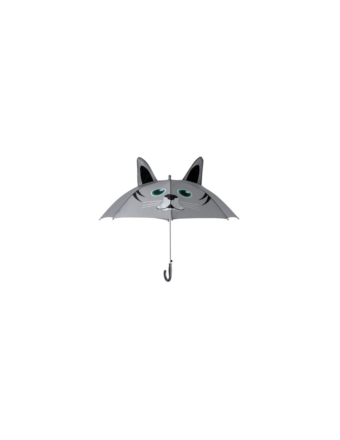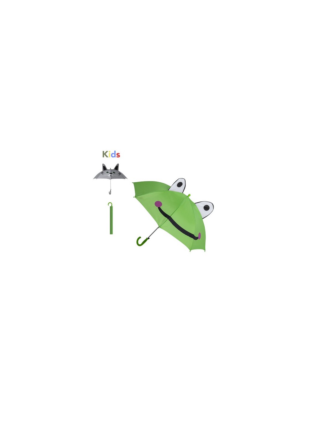 Paraguas infantil con divertidos diseños de gato y rana. De 78cm de diámetro y fabricado en resistente material poliéster 180T. Apertura automática, con caña y varillas de metal, mango curvo y funda de poliéster a juego. 18". Automático. Funda Poliéster Composition : Poliéster 190T. Varillas Metal.