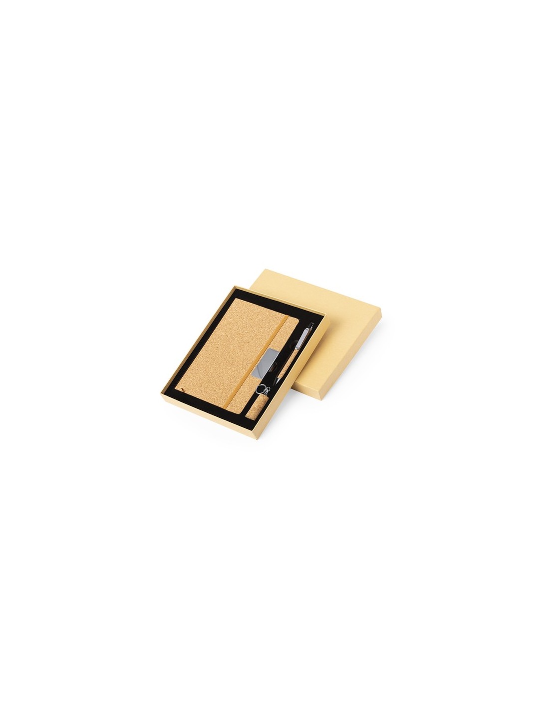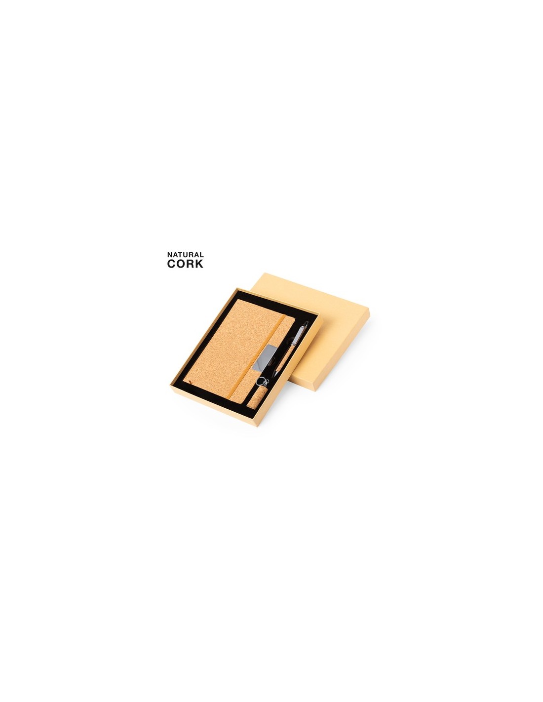 Set de bloc de notas y bolígrafo elaborado en corcho. Incluye:Bloc de notas de tapas rígidas, con detalle metálico en la portada, marcapáginas de tela y elástico de sujeción a juego. 80 hojas interiores con disposición a una raya. Bolígrafo con cuerpo recubierto en suave corcho. Elegante clip metálico y accesorios a juego, de mecanismo pulsador y en tinta azul. Llavero memoria USB de 16GB en forma de corcho de botella. Set presentado en elegante estuche de diseño en color kraft, con compartimento independiente para cada artículo.Elaborado con elementos vegetales para así fomentar la utilización de materias primas naturales y reducir las emisiones contaminantes. Bloc Portada Rígida. 80 Hojas. Bolígrafo. Memoria USB 16GB Composition : Corcho.