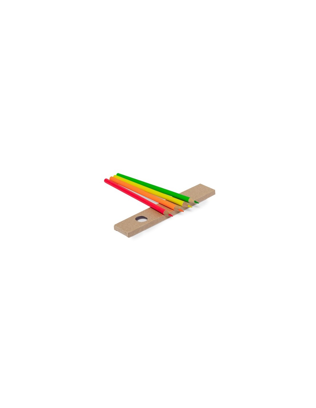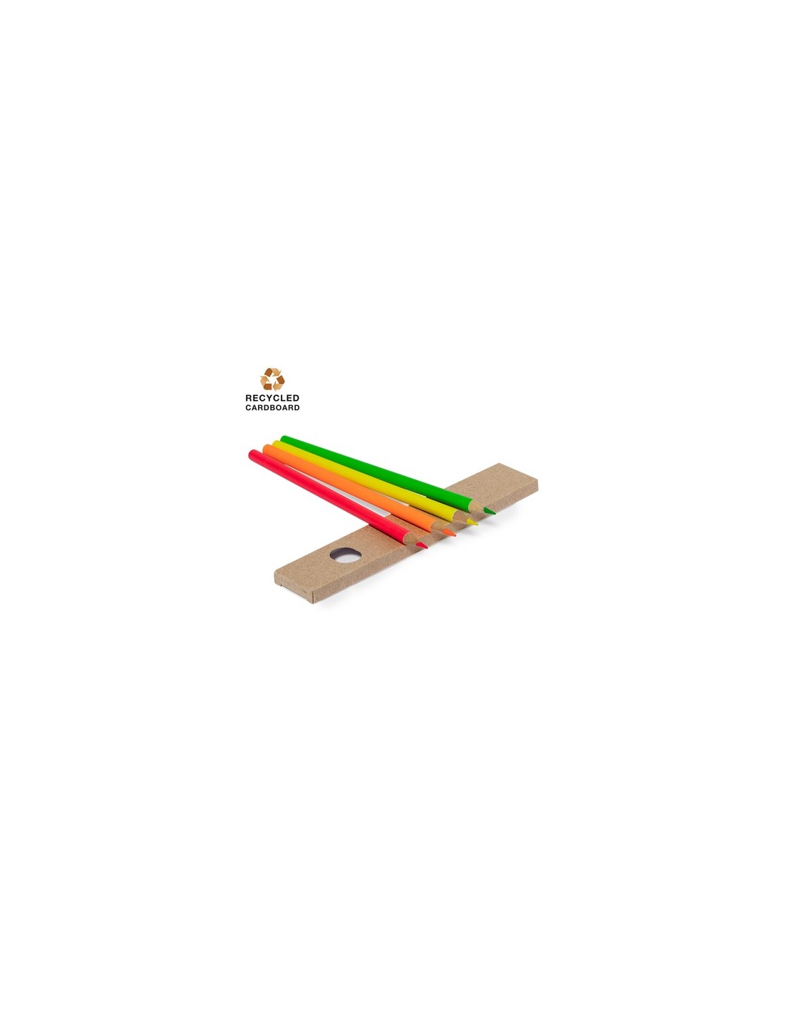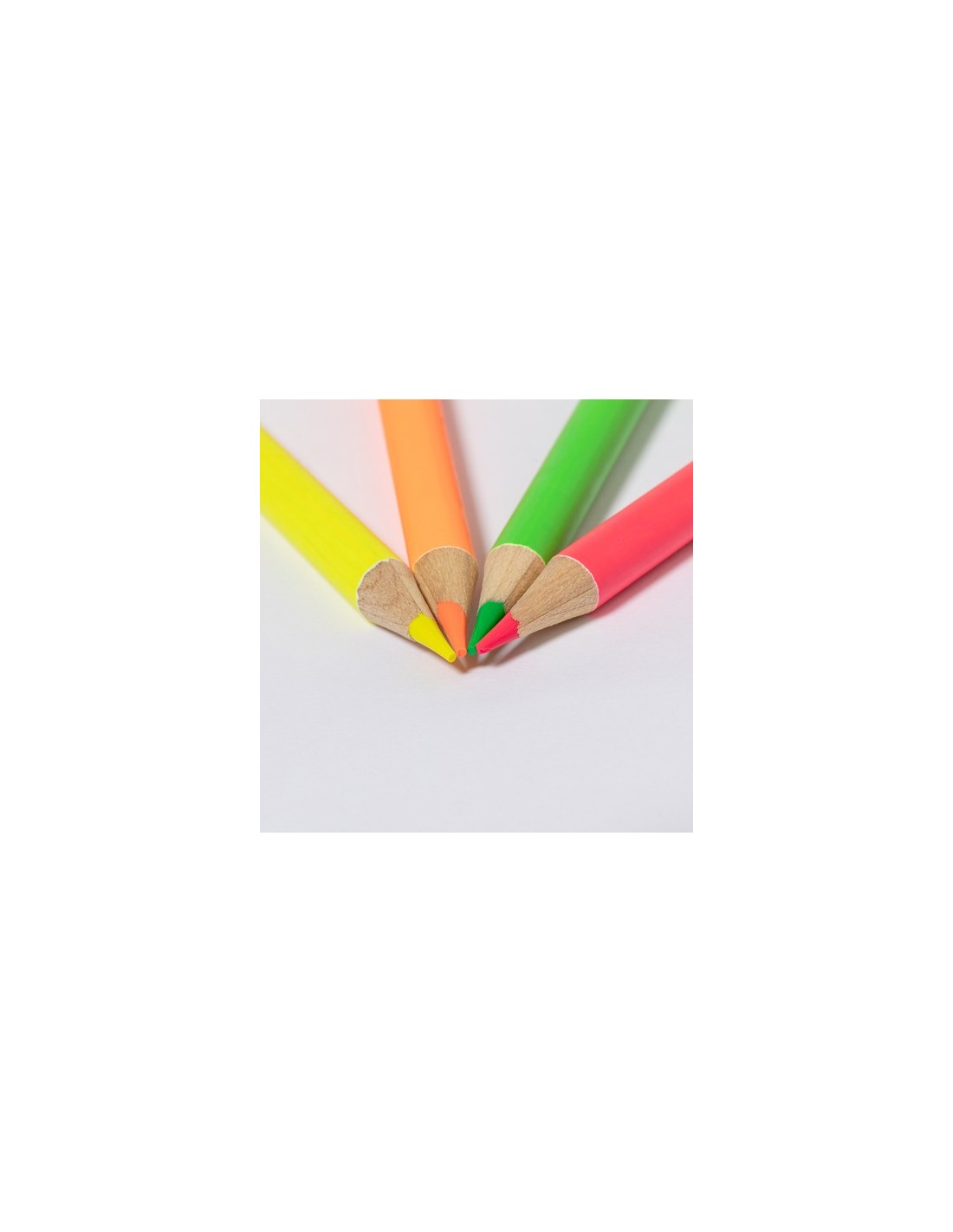 Set de 4 lápices en caja de cartón reciclada con ventana. Lápices de madera con cuerpo cilíndrico en variados colores fluor y minas en divertidos colores. 4 Lápices Composition : Cartón Reciclado.