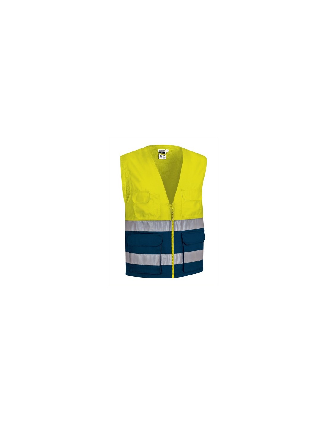 Chaleco bicolor de Alta Visibilidad multibolsillos.Confeccionado en tejido sarga mezcla algodón con poliéster que aporta durabilidad y resistencia, con forro interior de rejilla que favorece la ventilación, incluye dos cintas retro-reflectantes cosidas en torso y espalda para mayor seguridad.Prenda certificada como EPI de Categoría II de Alta Visibilidad en base a las normas 13688 y 20471, clase 1, con duración máxima de 25 lavados.Dos bolsillos frontales con fuelle, dos en el pecho, todos con tapeta, dos laterales y uno interior para tener todo accesible y resaltar el marcaje, incluye departamentos para bolígrafo.Métodos idóneos de marcaje: serigrafía, transfer, bordados, cosidos.Ideal como ropa laboral y uniformes de trabajo. Composición : exterior: 65% poliester 35% algodon - interior: 100% poliester