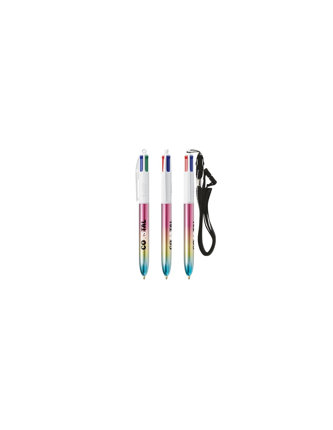 ¡Descubre nuestro nuevo BIC® 4 Colours® Gradient! Su exclusivo efecto degradado metálico combina 3 colores brillantes en el cuerpo, ¡para vibraciones veraniegas y creatividad sin límites! Nuestros bolígrafos BIC® 4 Colours® tienen una longitud media de escritura de 8.000m (pruebas SGS - longitud media de escritura para los cartuchos azul, negro, rojo y verde). Nuestro icónico BIC® 4 Colours® es cada vez más sostenible, ¡ahora con un 13% menos de plástico en la parte superior! Entre junio de 2023 y junio de 2024 tenga en cuenta que puede recibir su pedido con el clip estándar o con el nuevo clip que contiene menos plástico. ¡4 bolígrafos en 1! Gran área de impresión, casi 360º. Mecanismo de retracción confiable: los cartuchos no bloquean. Fabricación completa interna. La pelota de carburo de tungsteno perfectamente esférica contribuye a una escritura constante. Tinta de larga duración: alta calidad, secado rápido y escritura suave. Diseño icónico con más de 45 años estableciendo la tendencia en los instrumentos de escritura. Materiales : Plástico. Precio incluido marcado.