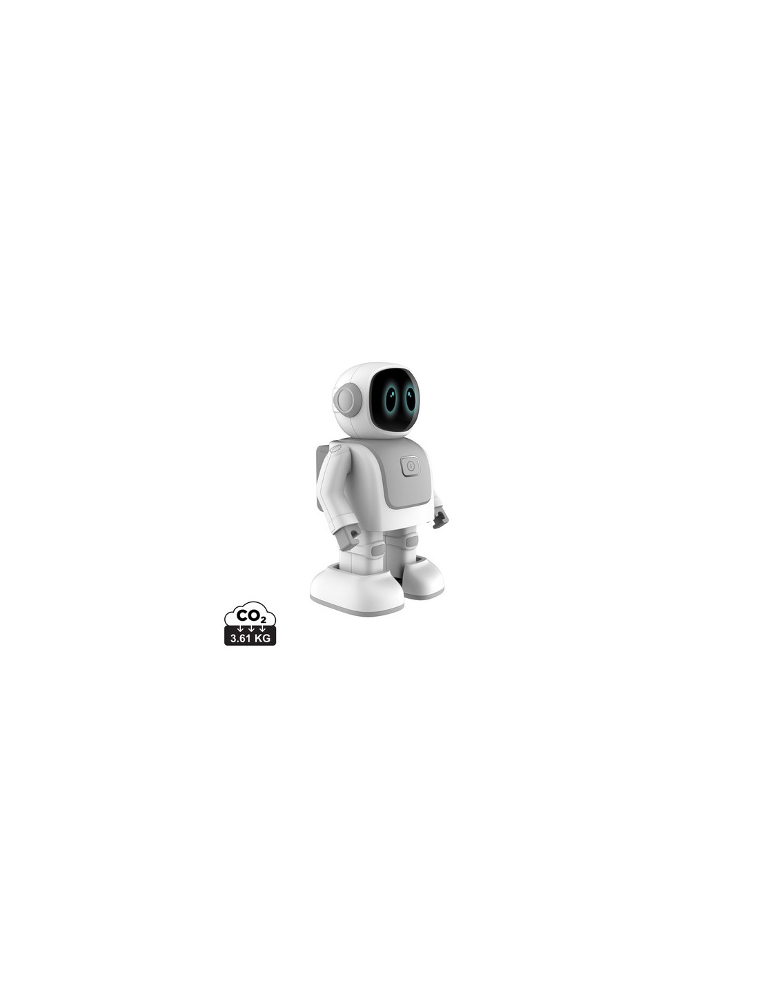 Presentamos a Robertt, el robot bailarín definitivo que revolucionará tu experiencia de entretenimiento. Conecta a Robert a tu dispositivo móvil sin problemas a través de una conexión inalámbrica y deja que la magia se desarrolle. Con un altavoz integrado que reproduce música con una claridad nítida, Robert bailará al ritmo de la música y convertirá cualquier habitación en una pista de baile. Sincroniza a Robert con tu dispositivo Android o iOS en un instante y utiliza la aplicación interactiva para programar y controlar los movimientos de baile de Robert directamente desde tu móvil. Disfruta de música de alta calidad a través del altavoz integrado de Robert y baila sin parar durante hasta 5 horas con un alcance de hasta 10 metros. Perfecto tanto para niños como para adultos, Robert cautivará y entretendrá a todos. Ya sea que estés organizando una fiesta, buscando una forma divertida de interactuar con tus hijos o simplemente quieras un compañero único, Robert es tu dispositivo ideal. Material : ABS Recycled Content Percent : 0 Conforme directiva bateria 2006/66EC, Conforme directiva equipamientos Radio y Telecomunicaciones 2014/53/EU, Conforme directiva de sustancias peligrosas 2011/65/EC & 2015/863, Hoja de datos de seguridad del material disponible, Conforme PAHS content in Reach & ZEK 01-4-08, Conforme directiva Phtalate content, Conforme directiva Battery transportation safety UN38.3, Certificado para transporte aéreo, Conforme directiva seguridad baterias Alcalinas EN62133, Libre de parafinas cloradas de cadena corta y media. WEEE Battery : 1 Li-poli - 18650 - 33 g. Packaging : Caja de regalo All print codes : Pad Print - Print code default : Tampografía - parte frontal en medio - 35 x 10 mm - max color : 5 Social Audits : BSCI Total CO2 emissions : 3,61.