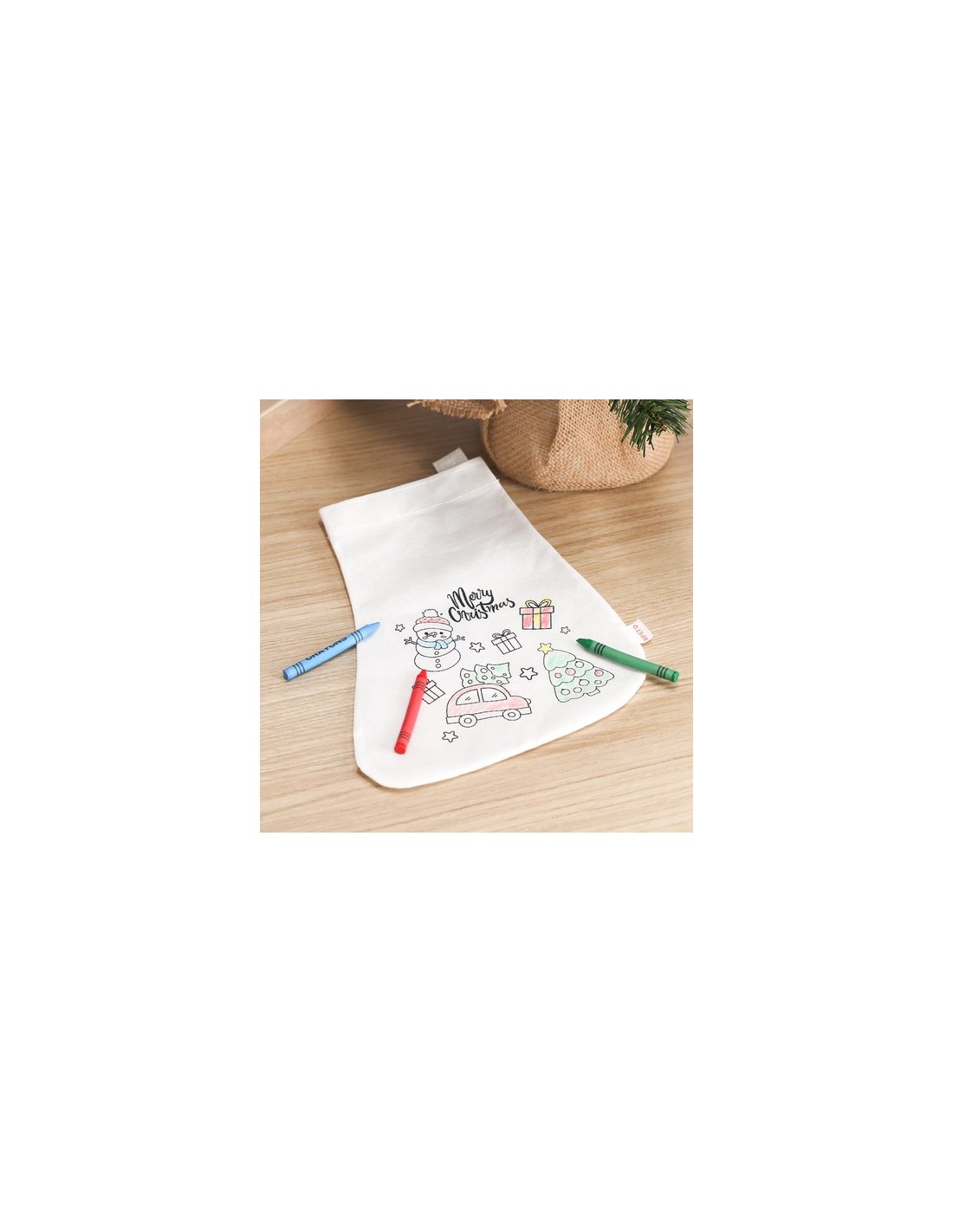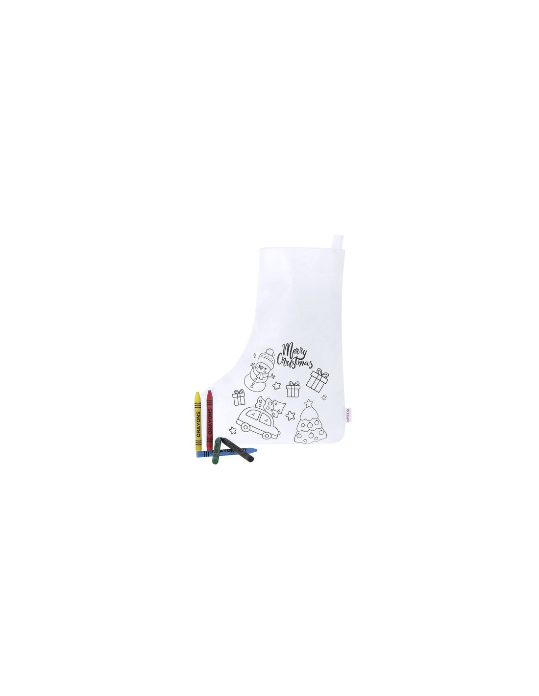 Calcetín de non-woven RPET en color blanco, especialmente diseñado para colorear con ceras. Diseño frontal de divertidos dibujos navideños, incluyendo 5 ceras en variados colores. Con cinta para colgar y de acabado termosellado. Incluye distintivo RPET en etiqueta.El material RPET se elabora a partir de plástico reciclado, para así fomentar la reutilización de residuos plásticos y ayudar a la sostenibilidad del planeta. 5 Ceras Incluidas Composition : Non-Woven RPET.