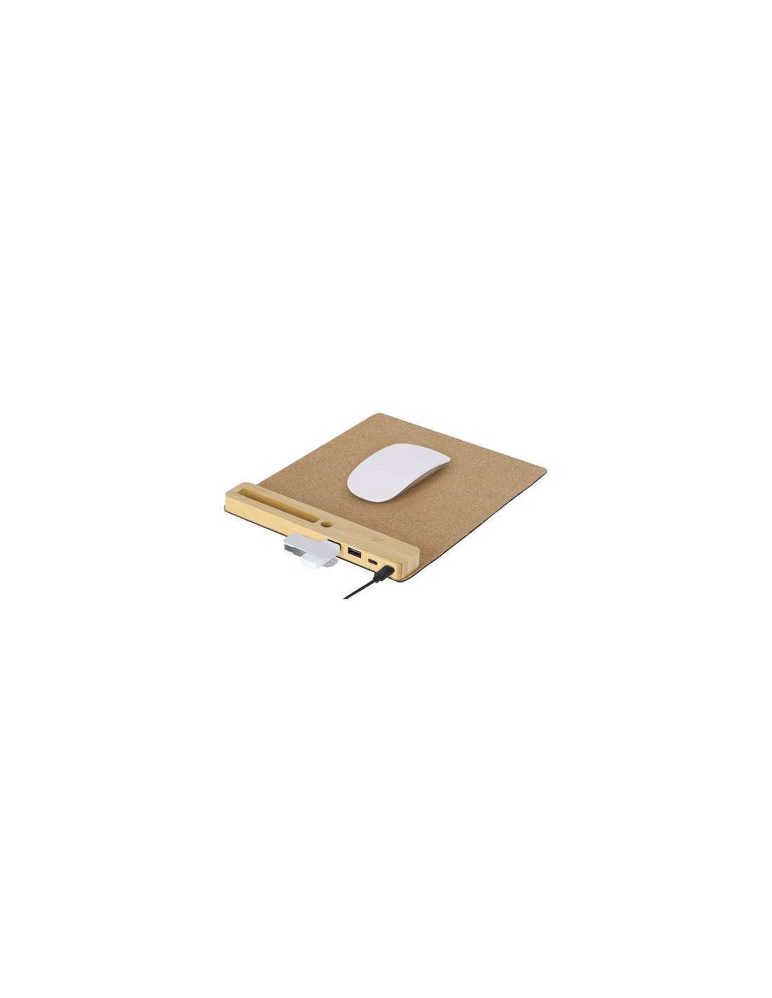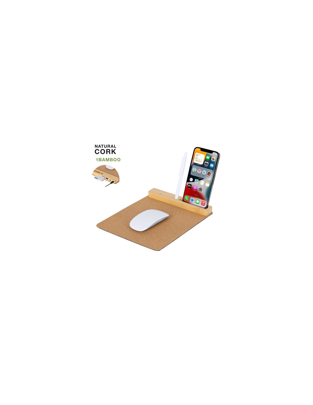 Alfombrilla multifunción fabricada en combinación de suave corcho y bambú. Flexible y con entrada Tipo C -cable incluido-, una salida Tipo C, y dos salidas USB; con función de sincronización de datos. Incluye soporte para smartphone y soporte para bolígrafos en la base de bambú. Es antideslizante y estable, garantizando una confortable experiencia de uso.Elaborado con elementos vegetales para así fomentar la utilización de materias primas naturales y reducir las emisiones contaminantes.Materiales como el bambú fomentan la utilización de materias primas naturales reduciendo las emisiones contaminantes. Además, el bambú proviene de una planta de gran resistencia y versatilidad, con crecimiento y regeneración rápida, siendo una excelente alternativa al uso de madera tradicional. 1 Puerto Tipo C. 2 Puertos USB 2.0. Antideslizante Composition : Corcho/ Silicona/ Bambú.