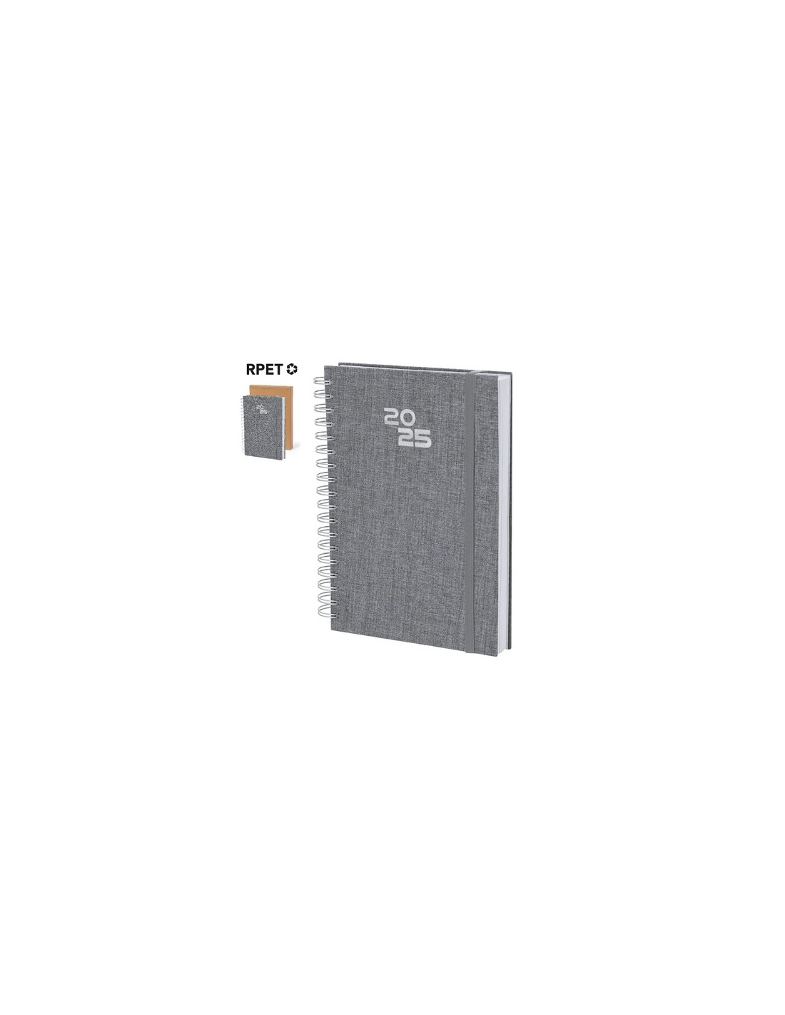 Agenda de anillas tamaño B5 fabricada en suave poliéster RPET. Con tapas rígidas y cierre de goma elástica a juego. Incluye caja kraft de presentación. Cuenta con distintivo RPET.Diseño semana vista, zona de anotaciones y marcapáginas de tela. En 2 idiomas: castellano e inglés. El material RPET se elabora a partir de plástico reciclado, para así fomentar la reutilización de residuos plásticos y ayudar a la sostenibilidad del planeta. Página Día. Caja Presentación Incluida Composition : Poliéster 300D RPET.